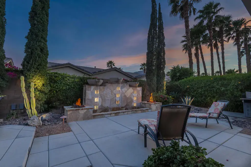Live Life Beautifully in this bright and cheery Maurea model 1,641 SQ FT home with 3-bedrooms and 3-bathrooms including a detached Casita. Indoor, this delightful home with high ceilings and big picture windows offers exquisite contemporary built-in design elements and decor. Outdoor, the home offers the ultimate in day and night time relaxation and entertainment with peak-a-boo southern mountain views and custom features, including a luxurious cascading waterfall with built-in glass-block lighting and blazing fire bowls on either side, a built-in bar and BBQ area, and raised patio with seating around a lava stone firepit. The home is available Turnkey furnished including the beautifully curated furnishings and interior decor. The kitchen, dining, and great room flow seamlessly making the home feel much larger. The great room has crown molding and a custom crafted media center with linear fireplace, glass tile surround, and built-in big-screen TV. The kitchen meets every cook’s needs, with gas cooktop and range, new microwave, dishwasher, beautiful wood cabinets and smooth slab granite on the kitchen counters. The kitchen and dining areas are open to the great room keeping you engaged with family and friends while cooking and entertaining. The primary bedroom suite is spacious and elegant, and the bathroom features dual vanities, a large walk-in shower with travertine stone surround, a linen-closet, and large walk-in closet. The guest bedroom is roomy with a mirrored closet and is located next to a full guest bath. Guests will love the privacy of the roomy detached Casita with closet and full bath. The garage has storage and fits 2-cars and a golf cart.