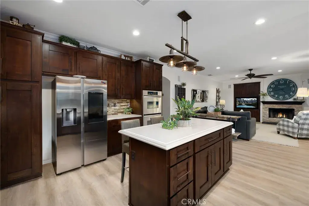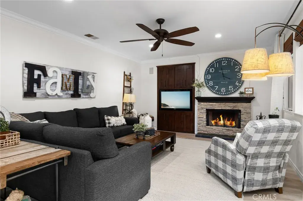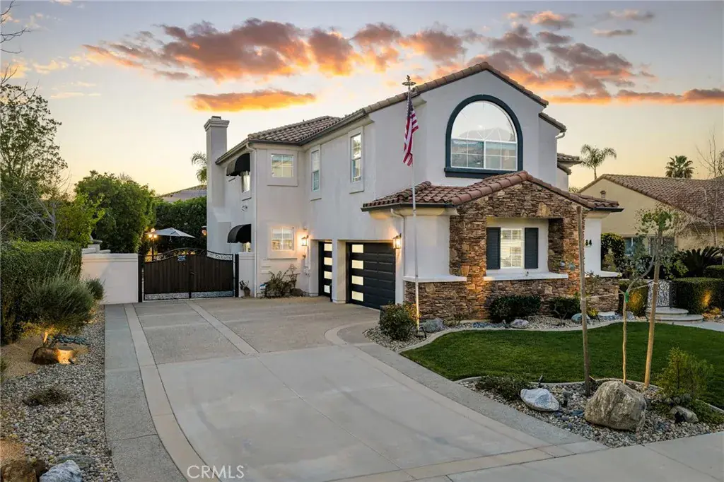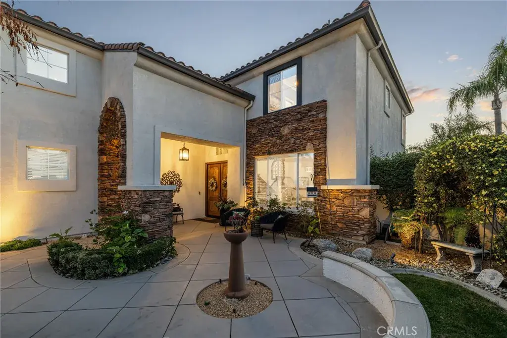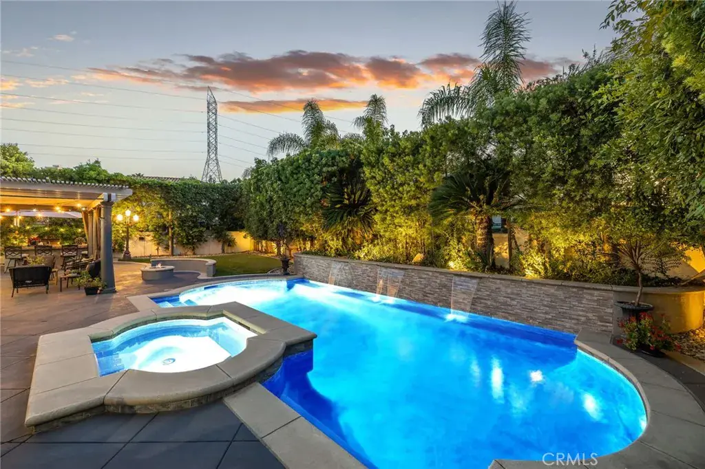 Tucked behind the gates of La Verne Heights, this thoughtfully remodeled residence blends refined interiors with a resort-style outdoor setting. Layered stonework, accent lighting, and hardscape walkways guide you through a private courtyard to a covered, arched entry with custom double doors. Inside, a two-story foyer sets the tone with an arched transom window, chandelier, wide-plank LVP flooring, and crown molding throughout. A staircase with a mid-landing, wood handrail, and dark metal balusters adds architectural presence. The living and dining rooms are filled with natural light, with the dining space highlighted by a modern chandelier and oversized mirror. The kitchen opens seamlessly to the family room and features Corian countertops, warm wood cabinetry, a glass tile backsplash, and stainless steel appliances including double ovens, gas cooktop, and built-in microwave. A center island with bar seating and pendant lighting anchors the space, while the breakfast nook—framed by multiple windows and a glass door—offers direct access to the backyard. The family room centers around a stacked-stone fireplace with built-in media cabinetry and views of the outdoor living areas beyond. The main level is completed by a private office or optional fourth bedroom, a full bathroom with walk-in shower, and an indoor laundry room with sink and storage. Upstairs, an expansive bonus room with vaulted ceilings and recessed LED lighting provides flexible use as a media room, game room, or secondary living space. The primary suite serves as a private retreat, featuring crown molding, plush carpet, abundant natural light, and an adjoining sitting area with gas fireplace. The spa-inspired primary bath includes dual vanities with granite countertops, a dedicated makeup station, a soaking tub beneath a large window, and a glass-enclosed walk-in shower with custom tile work. Two additional upstairs bedrooms are generously sized and share a well-appointed hall bath with dual sinks and a subway-tile tub/shower combination. Outdoors, a resort-style pool and raised spa with cascading water features and integrated lighting anchor the private backyard. Gated RV parking and tall, mature hedges surround the property, creating a secluded setting. Custom square-cut concrete hardscape defines multiple entertaining zones, including a covered Alumawood patio with lighting, built-in seating and fire pit, outdoor surround sound, and a built-in BBQ with grill and bar seating.