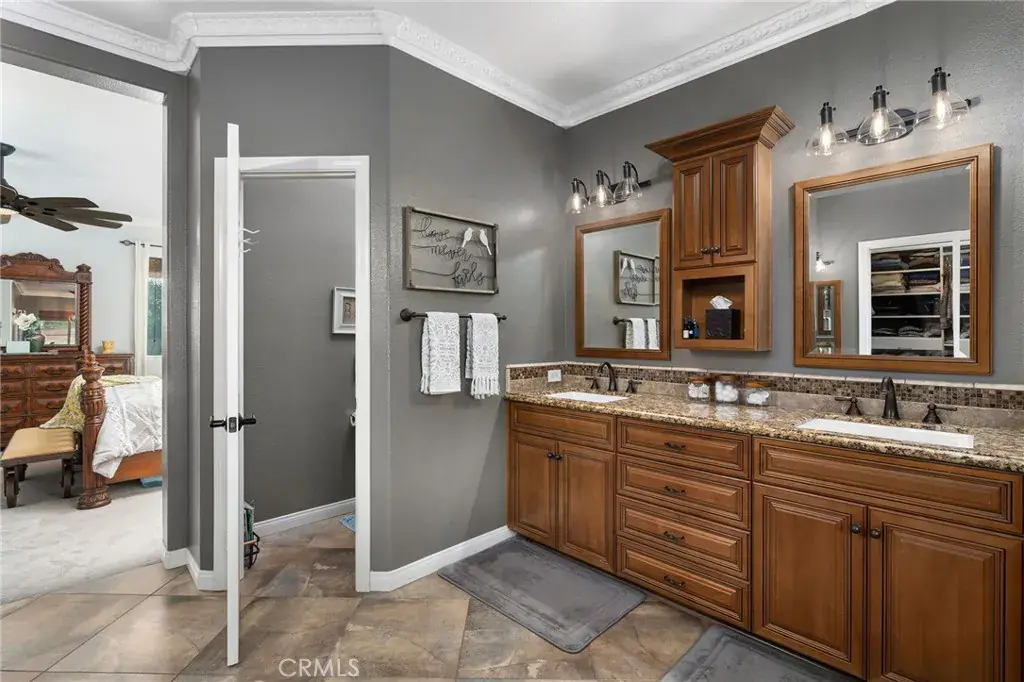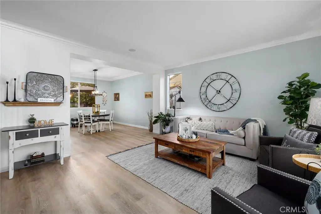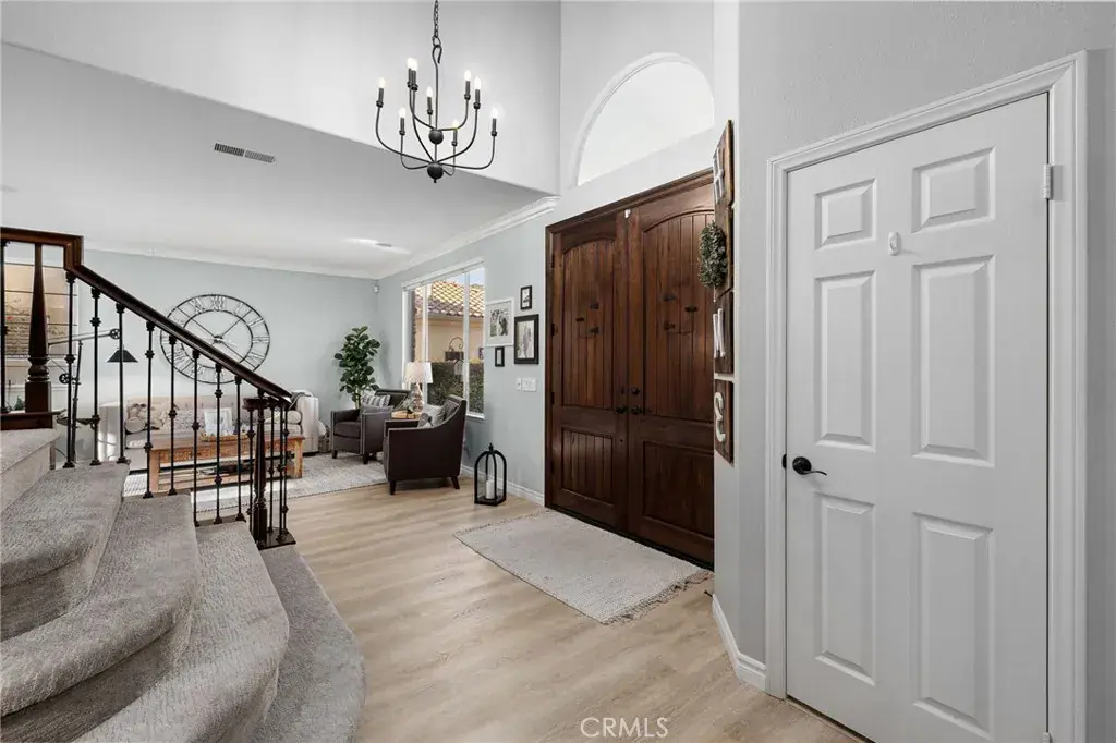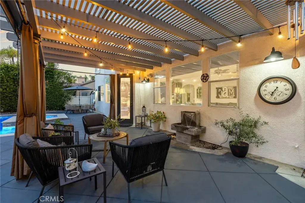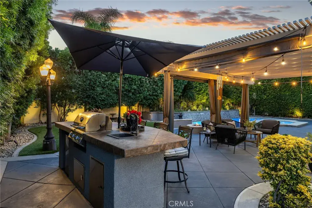 Tucked behind the gates of La Verne Heights, this thoughtfully remodeled residence blends refined interiors with a resort-style outdoor setting. Layered stonework, accent lighting, and hardscape walkways guide you through a private courtyard to a covered, arched entry with custom double doors. Inside, a two-story foyer sets the tone with an arched transom window, chandelier, wide-plank LVP flooring, and crown molding throughout. A staircase with a mid-landing, wood handrail, and dark metal balusters adds architectural presence. The living and dining rooms are filled with natural light, with the dining space highlighted by a modern chandelier and oversized mirror. The kitchen opens seamlessly to the family room and features Corian countertops, warm wood cabinetry, a glass tile backsplash, and stainless steel appliances including double ovens, gas cooktop, and built-in microwave. A center island with bar seating and pendant lighting anchors the space, while the breakfast nook—framed by multiple windows and a glass door—offers direct access to the backyard. The family room centers around a stacked-stone fireplace with built-in media cabinetry and views of the outdoor living areas beyond. The main level is completed by a private office or optional fourth bedroom, a full bathroom with walk-in shower, and an indoor laundry room with sink and storage. Upstairs, an expansive bonus room with vaulted ceilings and recessed LED lighting provides flexible use as a media room, game room, or secondary living space. The primary suite serves as a private retreat, featuring crown molding, plush carpet, abundant natural light, and an adjoining sitting area with gas fireplace. The spa-inspired primary bath includes dual vanities with granite countertops, a dedicated makeup station, a soaking tub beneath a large window, and a glass-enclosed walk-in shower with custom tile work. Two additional upstairs bedrooms are generously sized and share a well-appointed hall bath with dual sinks and a subway-tile tub/shower combination. Outdoors, a resort-style pool and raised spa with cascading water features and integrated lighting anchor the private backyard. Gated RV parking and tall, mature hedges surround the property, creating a secluded setting. Custom square-cut concrete hardscape defines multiple entertaining zones, including a covered Alumawood patio with lighting, built-in seating and fire pit, outdoor surround sound, and a built-in BBQ with grill and bar seating.