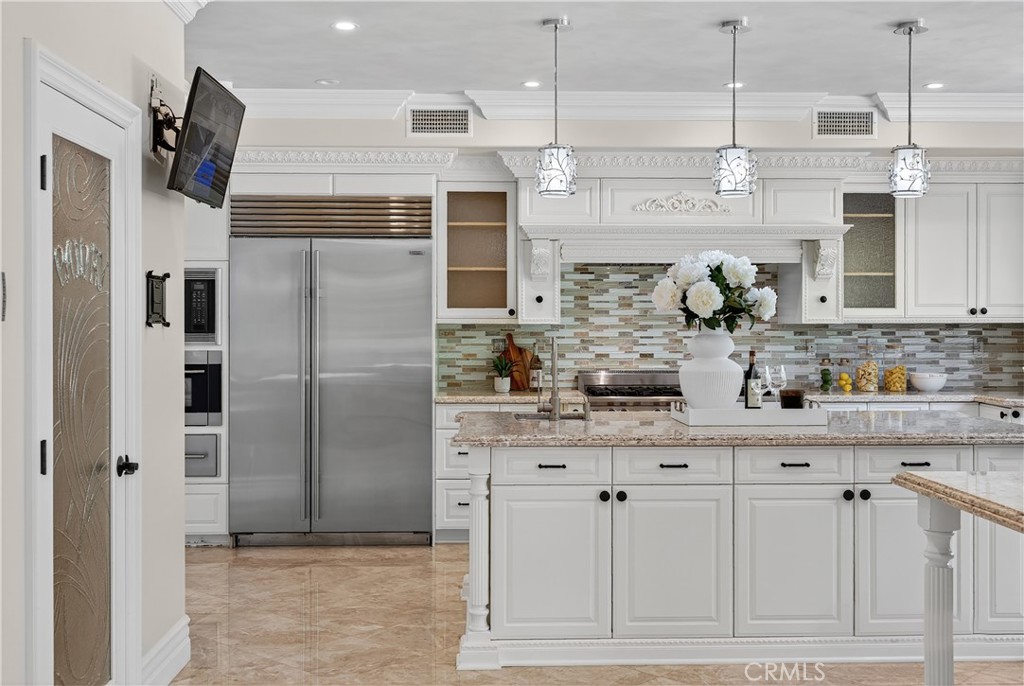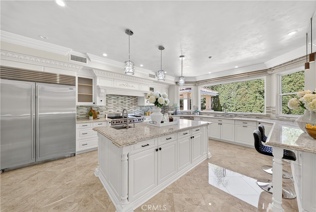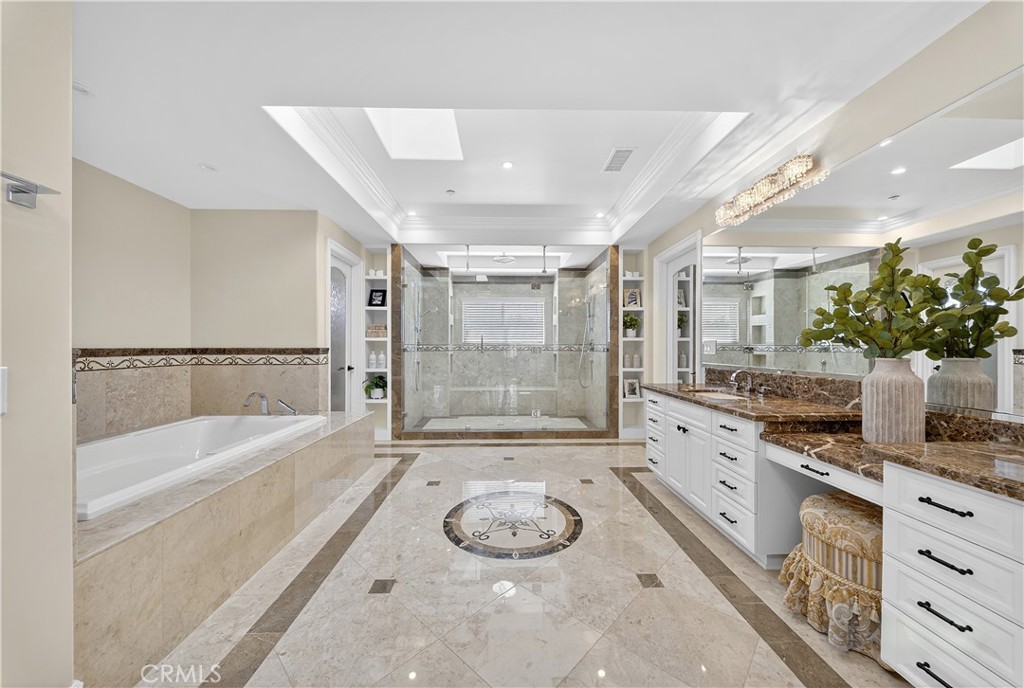 Inside, soaring hand-painted ceilings and brand-new flooring set the stage for refined living. The chef’s kitchen has been completely redesigned with custom cabinetry, a top-of-the-line Sub-Zero refrigerator and professional-grade Wolf appliances—perfect for both everyday meals and entertaining. Each bedroom has been transformed into a private suite with a newly added full bathroom, while the primary suite impresses with a custom walk-in closet and spa-inspired bathroom featuring dual vanities and dual walk-in showers.