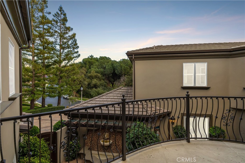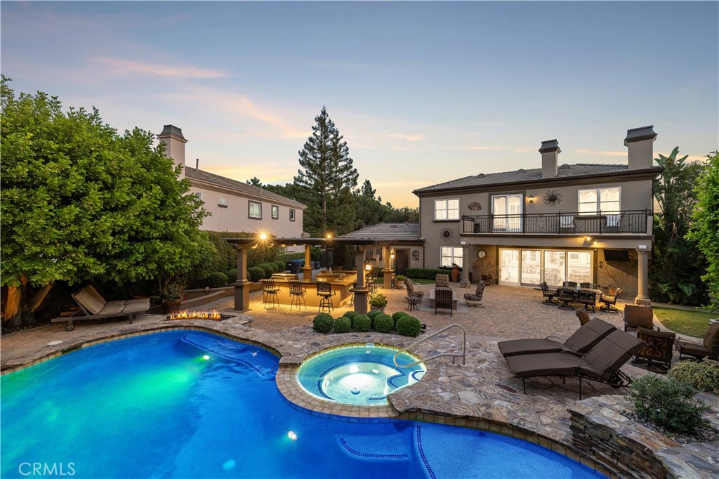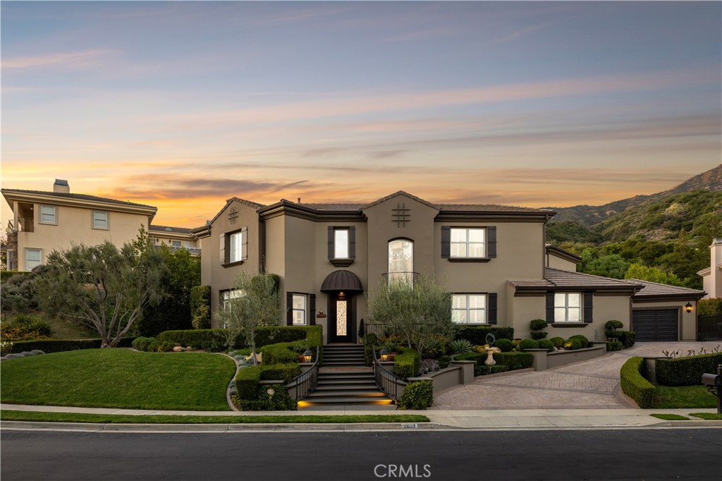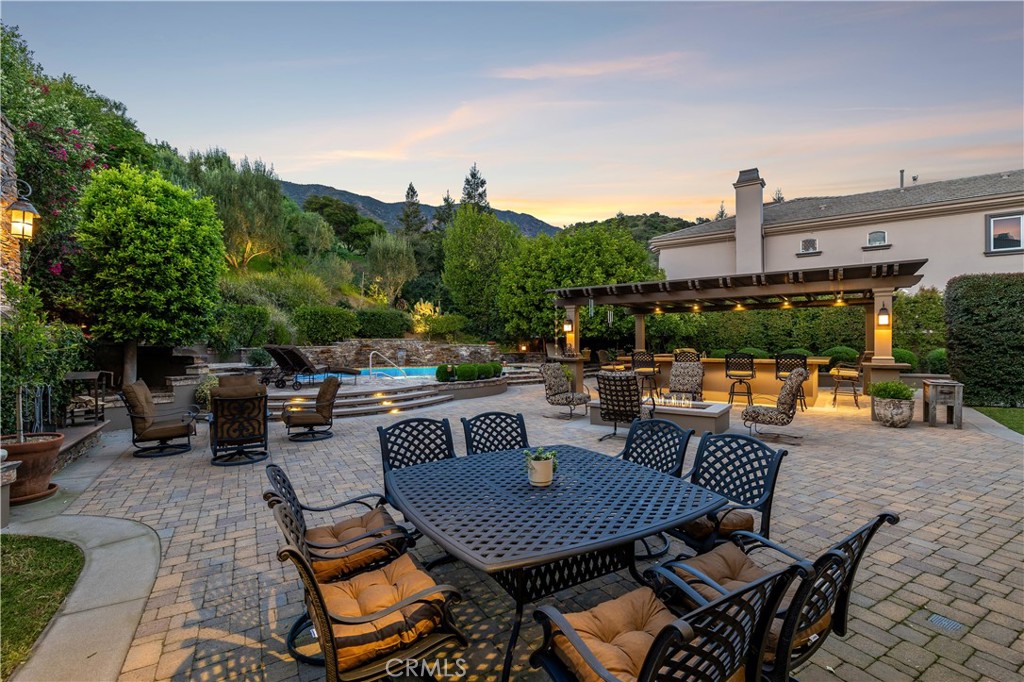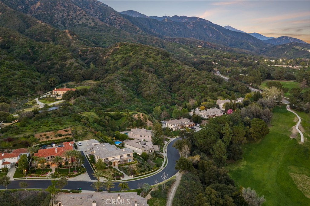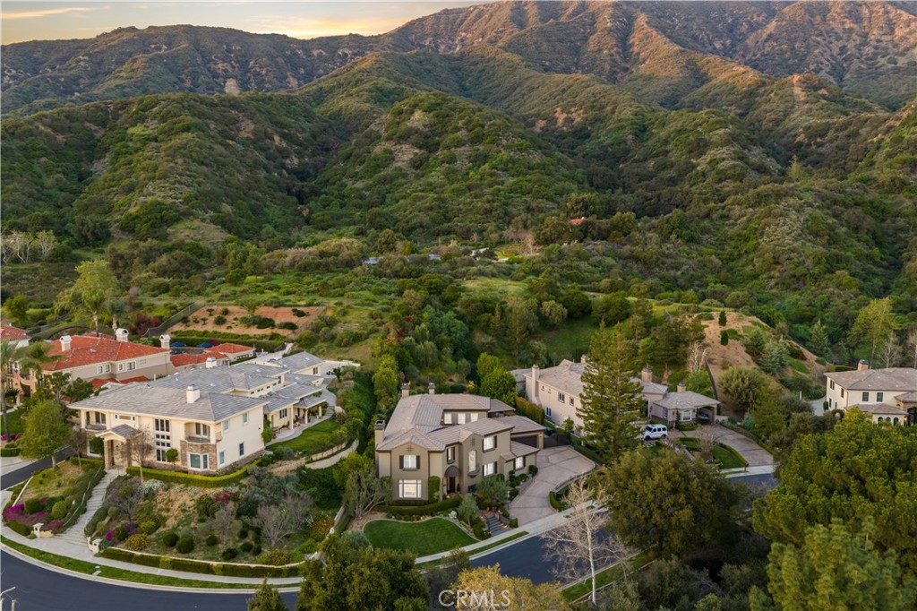 Positioned on a prime elevated lot within the exclusive Marshall Canyon Estates, this custom-built residence is one of only ten custom homes in the community. Panoramic mountain views, refined finishes, and expansive outdoor living spaces define the property, introduced by manicured landscaping and a paver driveway leading to a motor court and four-car garage. Travertine flooring welcomes you into the entry, where a staircase with wood handrails and white balusters creates a central architectural feature, complemented by a motorized chandelier. Crown molding, plantation shutters, recessed lighting, and abundant natural light continue throughout the home. Formal living and dining rooms sit just beyond the entry, offering well-proportioned spaces for entertaining and gatherings, with large windows bringing in natural light while maintaining separation from the casual living areas. The kitchen provides extensive workspace with granite countertops, custom cabinetry, a built-in refrigerator, double ovens, and a large center island with cooktop and prep sink. A breakfast bar offers additional seating, while the adjacent breakfast nook features a bay window with built-in bench seating. French doors open to a private courtyard with a fountain. The family room connects directly to the kitchen and features wood flooring, a stone fireplace with mantel, built-in cabinetry, and a dry bar. Expansive glass doors provide direct access to the backyard. The primary suite includes recessed lighting, a fireplace, and French doors opening to a private balcony overlooking the backyard and mountains, along with a second balcony above the courtyard. The primary bathroom is finished in travertine and includes dual vanities, a soaking tub beneath a view window, a walk-in shower with multiple fixtures, and a vanity counter. The walk-in closet is fully built out with custom cabinetry and a center island. Upstairs includes three additional bedrooms, each with its own ensuite bathroom, along with a dedicated laundry room. The extensively hardscaped backyard features stone decking surrounding a pebble-finish pool with cascading spillways and a raised spa, while the remaining outdoor areas are finished with expansive paver patios. A built-in BBQ and outdoor kitchen are positioned beneath an Alumawood-covered structure with bar seating and prep space. Two fire pits and a stacked-stone outdoor fireplace serve as focal points within multiple gathering areas arranged throughout the backyard.