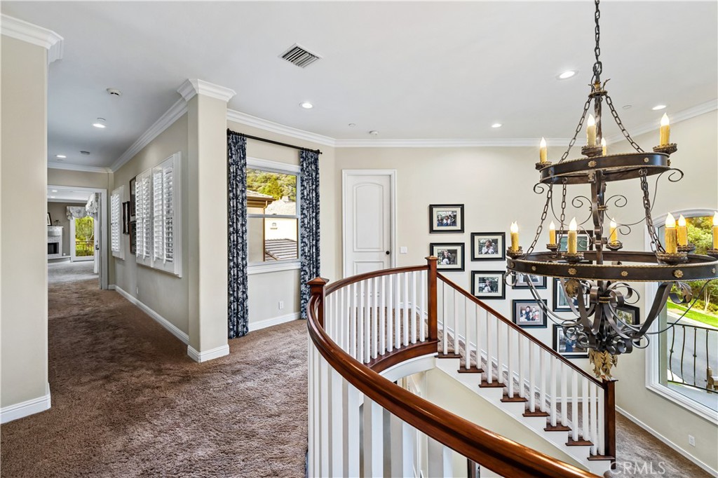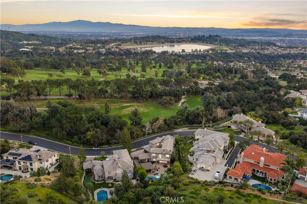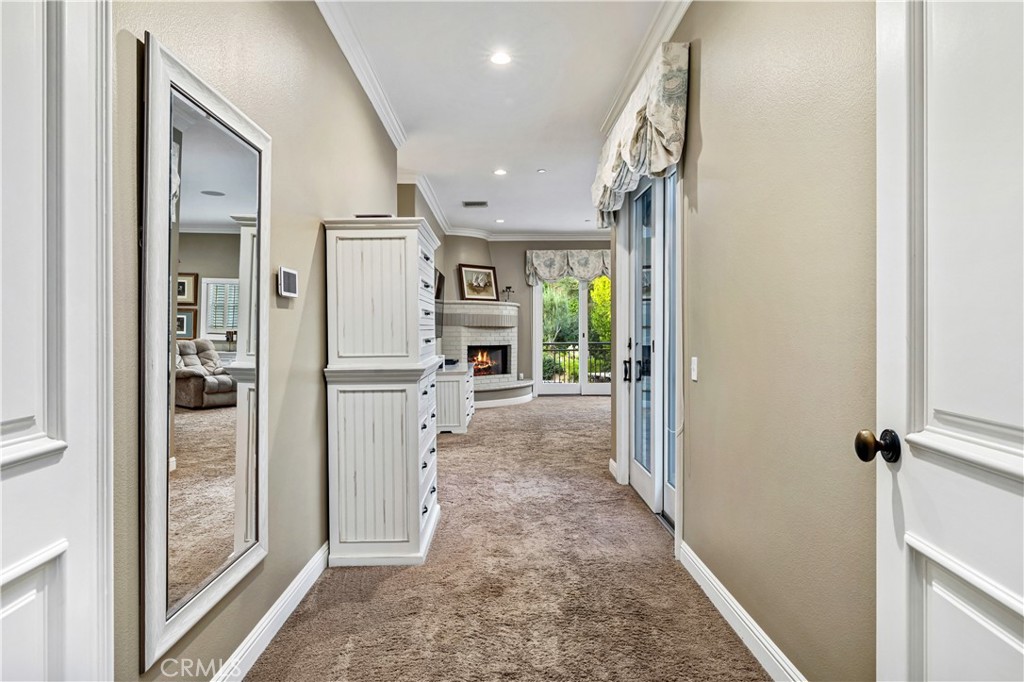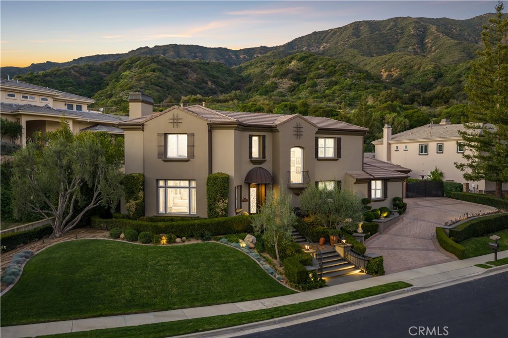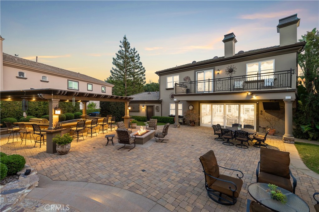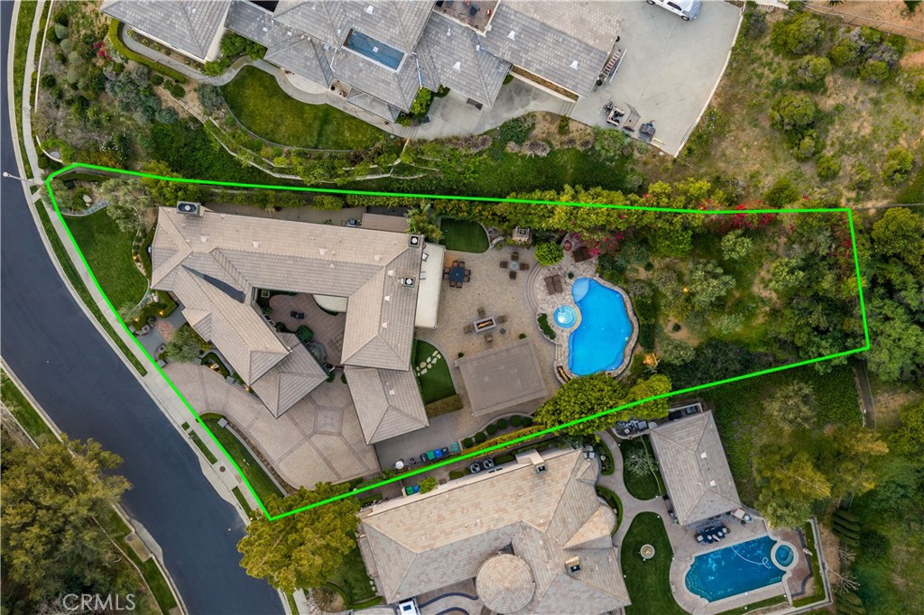 Positioned on a prime elevated lot within the exclusive Marshall Canyon Estates, this custom-built residence is one of only ten custom homes in the community. Panoramic mountain views, refined finishes, and expansive outdoor living spaces define the property, introduced by manicured landscaping and a paver driveway leading to a motor court and four-car garage. Travertine flooring welcomes you into the entry, where a staircase with wood handrails and white balusters creates a central architectural feature, complemented by a motorized chandelier. Crown molding, plantation shutters, recessed lighting, and abundant natural light continue throughout the home. Formal living and dining rooms sit just beyond the entry, offering well-proportioned spaces for entertaining and gatherings, with large windows bringing in natural light while maintaining separation from the casual living areas. The kitchen provides extensive workspace with granite countertops, custom cabinetry, a built-in refrigerator, double ovens, and a large center island with cooktop and prep sink. A breakfast bar offers additional seating, while the adjacent breakfast nook features a bay window with built-in bench seating. French doors open to a private courtyard with a fountain. The family room connects directly to the kitchen and features wood flooring, a stone fireplace with mantel, built-in cabinetry, and a dry bar. Expansive glass doors provide direct access to the backyard. The primary suite includes recessed lighting, a fireplace, and French doors opening to a private balcony overlooking the backyard and mountains, along with a second balcony above the courtyard. The primary bathroom is finished in travertine and includes dual vanities, a soaking tub beneath a view window, a walk-in shower with multiple fixtures, and a vanity counter. The walk-in closet is fully built out with custom cabinetry and a center island. Upstairs includes three additional bedrooms, each with its own ensuite bathroom, along with a dedicated laundry room. The extensively hardscaped backyard features stone decking surrounding a pebble-finish pool with cascading spillways and a raised spa, while the remaining outdoor areas are finished with expansive paver patios. A built-in BBQ and outdoor kitchen are positioned beneath an Alumawood-covered structure with bar seating and prep space. Two fire pits and a stacked-stone outdoor fireplace serve as focal points within multiple gathering areas arranged throughout the backyard.