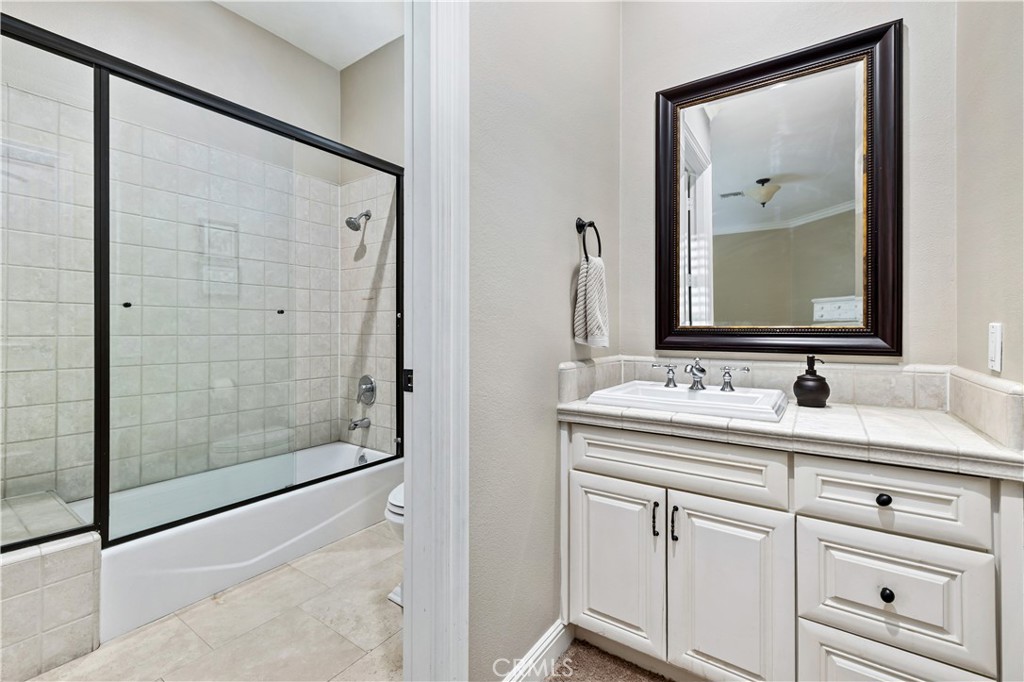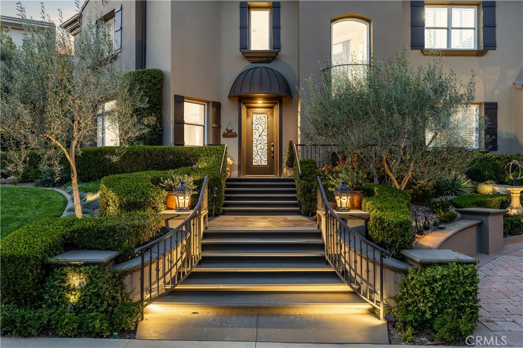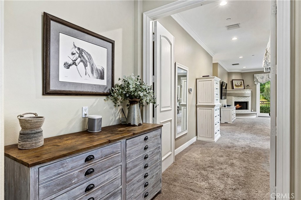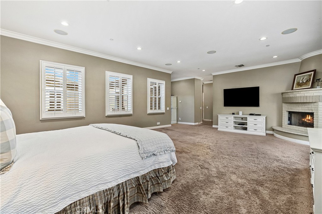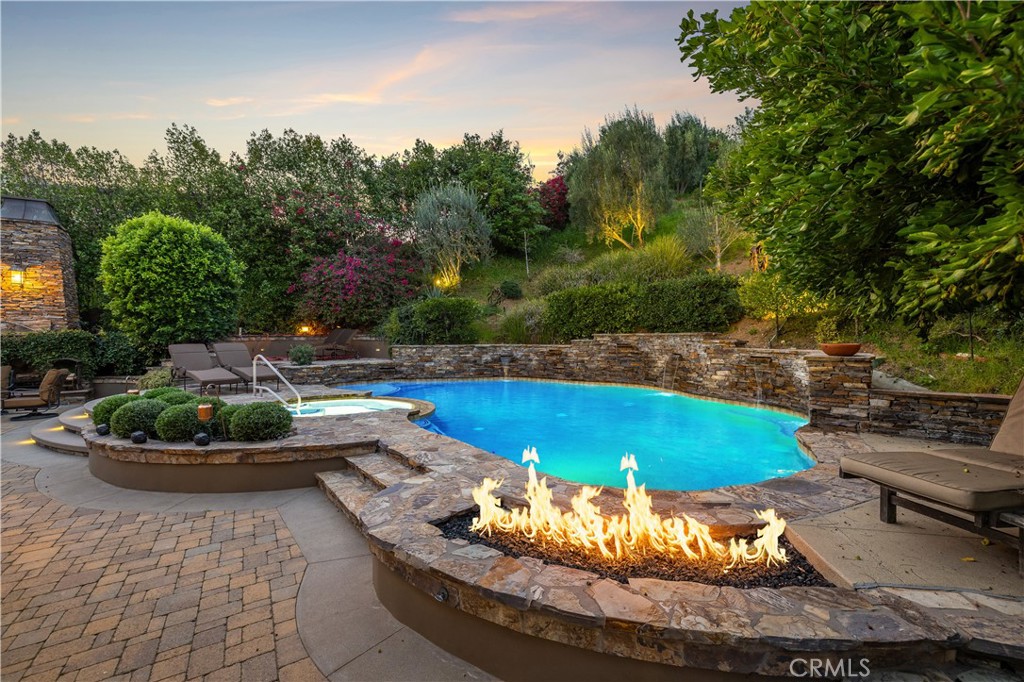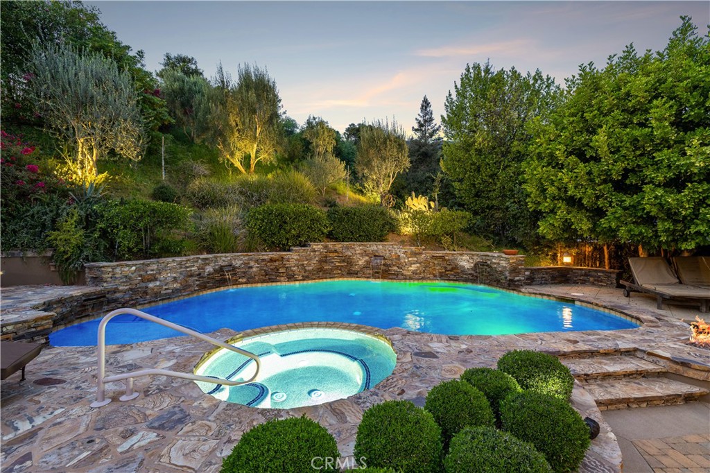Positioned on a prime elevated lot within the exclusive Marshall Canyon Estates, this custom-built residence is one of only ten custom homes in the community. Panoramic mountain views, refined finishes, and expansive outdoor living spaces define the property, introduced by manicured landscaping and a paver driveway leading to a motor court and four-car garage. Travertine flooring welcomes you into the entry, where a staircase with wood handrails and white balusters creates a central architectural feature, complemented by a motorized chandelier. Crown molding, plantation shutters, recessed lighting, and abundant natural light continue throughout the home. Formal living and dining rooms sit just beyond the entry, offering well-proportioned spaces for entertaining and gatherings, with large windows bringing in natural light while maintaining separation from the casual living areas. The kitchen provides extensive workspace with granite countertops, custom cabinetry, a built-in refrigerator, double ovens, and a large center island with cooktop and prep sink. A breakfast bar offers additional seating, while the adjacent breakfast nook features a bay window with built-in bench seating. French doors open to a private courtyard with a fountain. The family room connects directly to the kitchen and features wood flooring, a stone fireplace with mantel, built-in cabinetry, and a dry bar. Expansive glass doors provide direct access to the backyard. The primary suite includes recessed lighting, a fireplace, and French doors opening to a private balcony overlooking the backyard and mountains, along with a second balcony above the courtyard. The primary bathroom is finished in travertine and includes dual vanities, a soaking tub beneath a view window, a walk-in shower with multiple fixtures, and a vanity counter. The walk-in closet is fully built out with custom cabinetry and a center island. Upstairs includes three additional bedrooms, each with its own ensuite bathroom, along with a dedicated laundry room. The extensively hardscaped backyard features stone decking surrounding a pebble-finish pool with cascading spillways and a raised spa, while the remaining outdoor areas are finished with expansive paver patios. A built-in BBQ and outdoor kitchen are positioned beneath an Alumawood-covered structure with bar seating and prep space. Two fire pits and a stacked-stone outdoor fireplace serve as focal points within multiple gathering areas arranged throughout the backyard.