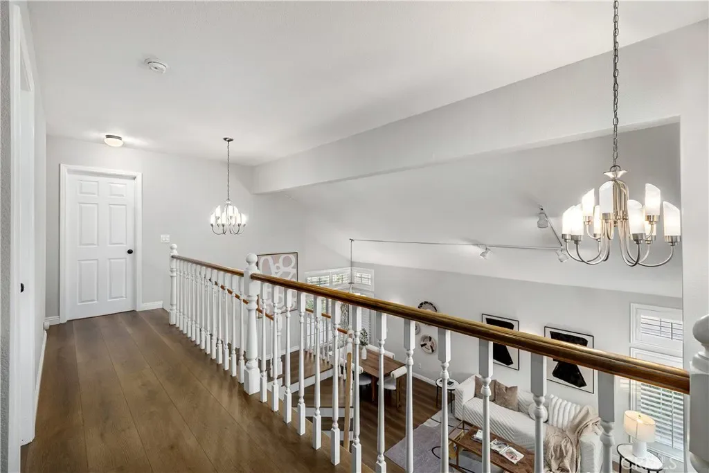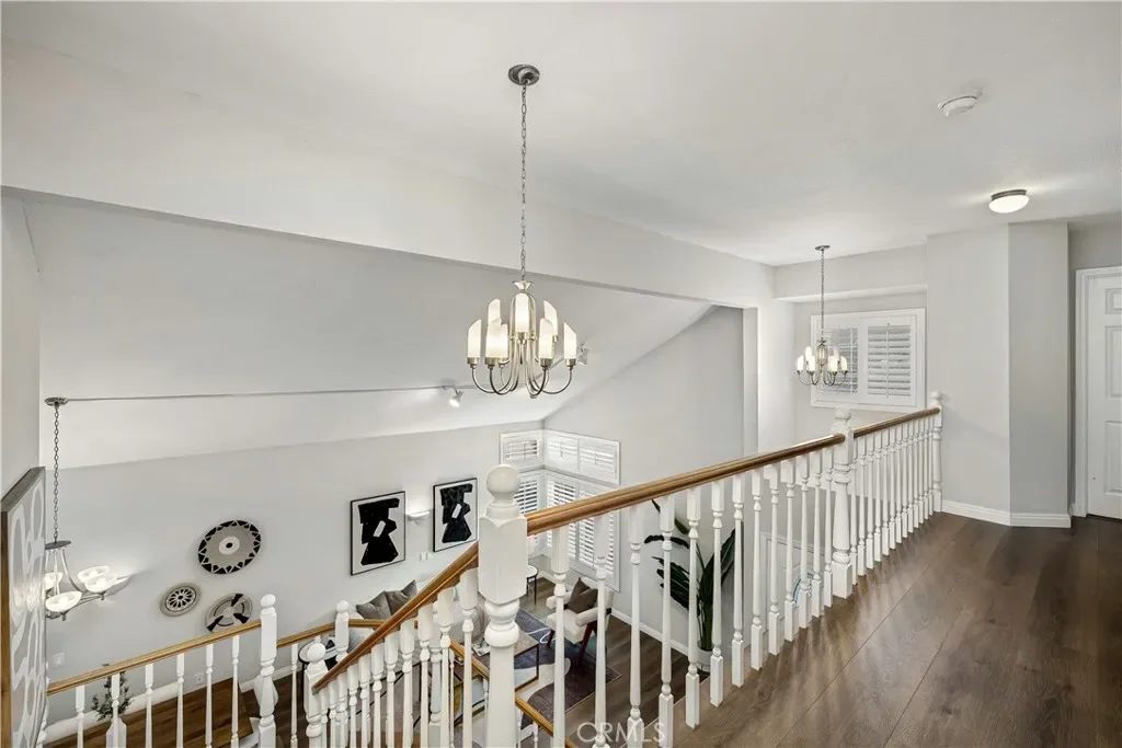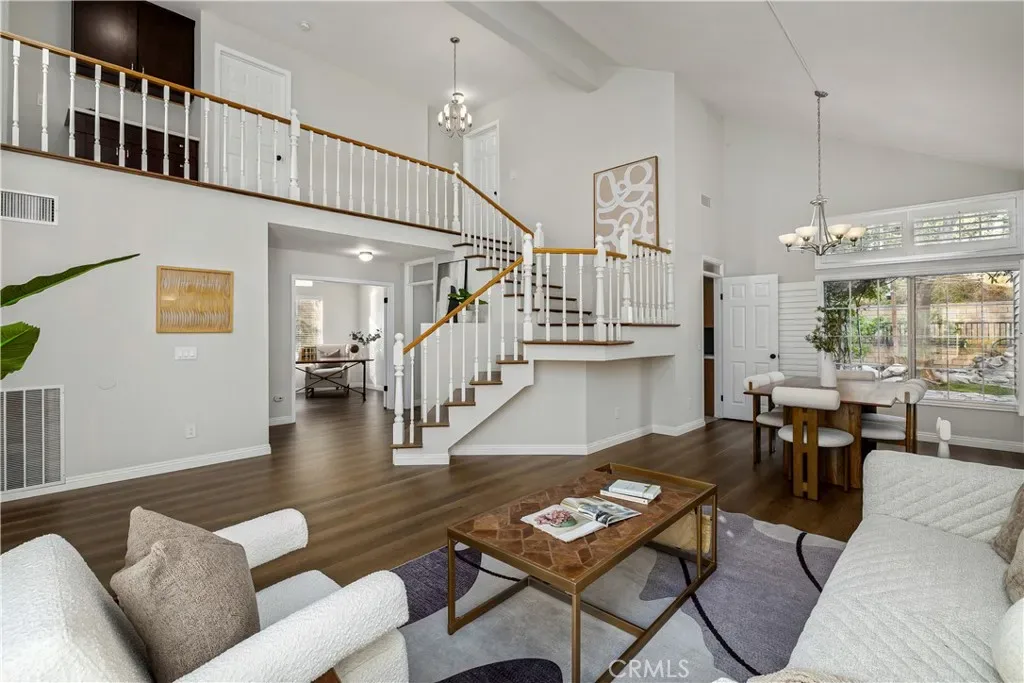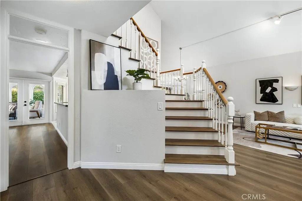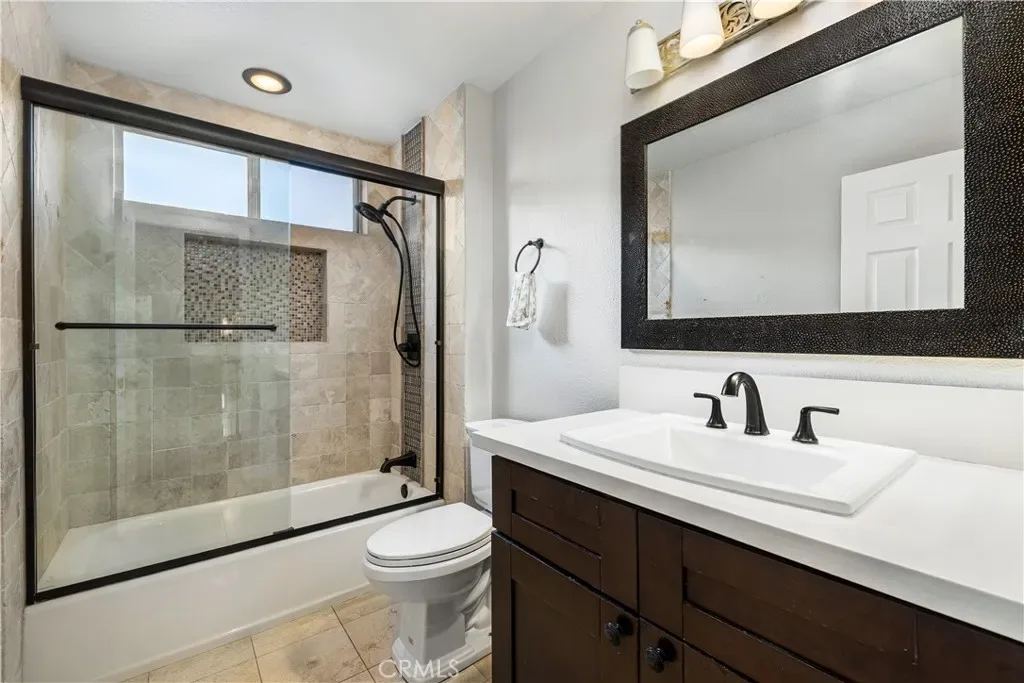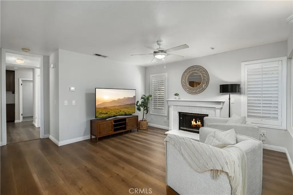 Remodeled home situated in a tucked lot of a quiet cul-de-sac located in the Emerald Ridge at Live Oak gated community. This home offers a long driveway leading to a two-car garage, landscaped front yard, and a covered front porch. Inside, enjoy soaring ceilings and a bright, open floor plan with a view of the center staircase and the living room featuring durable LVP flooring, large windows with plantation shutters, and an adjacent formal dining room with a chandelier and backyard view. The updated kitchen includes wood cabinetry, quartz countertops with full backsplash, stainless steel appliances, recessed lighting, and a breakfast nook, and is open to the family room. The family room has a fireplace with a mantel, windows with shutters, and access through glass French doors to a versatile space, ideal as a playroom, office, or additional lounge, that can remain private or open to the family room. Downstairs also offers a bedroom with double entry doors (currently used as an office), a remodeled bathroom with a custom tiled shower and updated vanity, a laundry room with cabinetry, and direct access to the attached two-car garage. Upstairs, the primary bedroom features a vaulted ceiling, double glass French doors leading to a balcony with mountain and greenbelt views, and direct access to the bathroom. The bathroom offers travertine tile in a versailles pattern, dual sinks, a frameless glass shower, separate tub with greenbelt views, and a walk-in closet with mirrored doors. Two additional bedrooms and a remodeled hall bathroom complete the upstairs. The backyard is set against the greenbelt with no direct neighbor, custom stonework, various trees, planters, a small wood deck, a stone fountain waterfall, and two side yards. The HOA offers a pool, spa, and an RV storage area for residents nearby. Choose La Verne or Claremont Schools, if La Verne, it’s Bonita Unified and attends Oak Mesa Elementary.