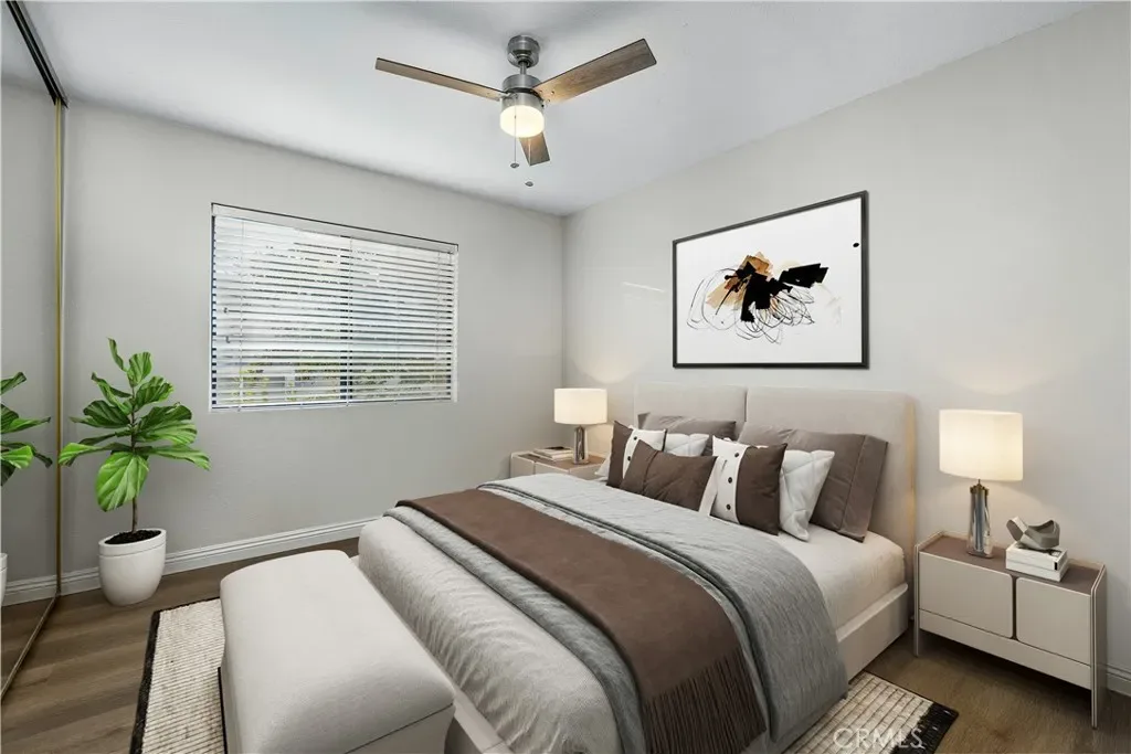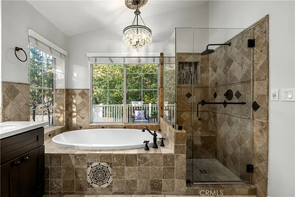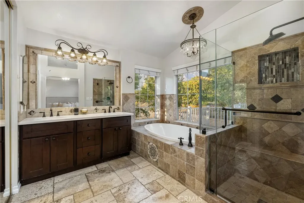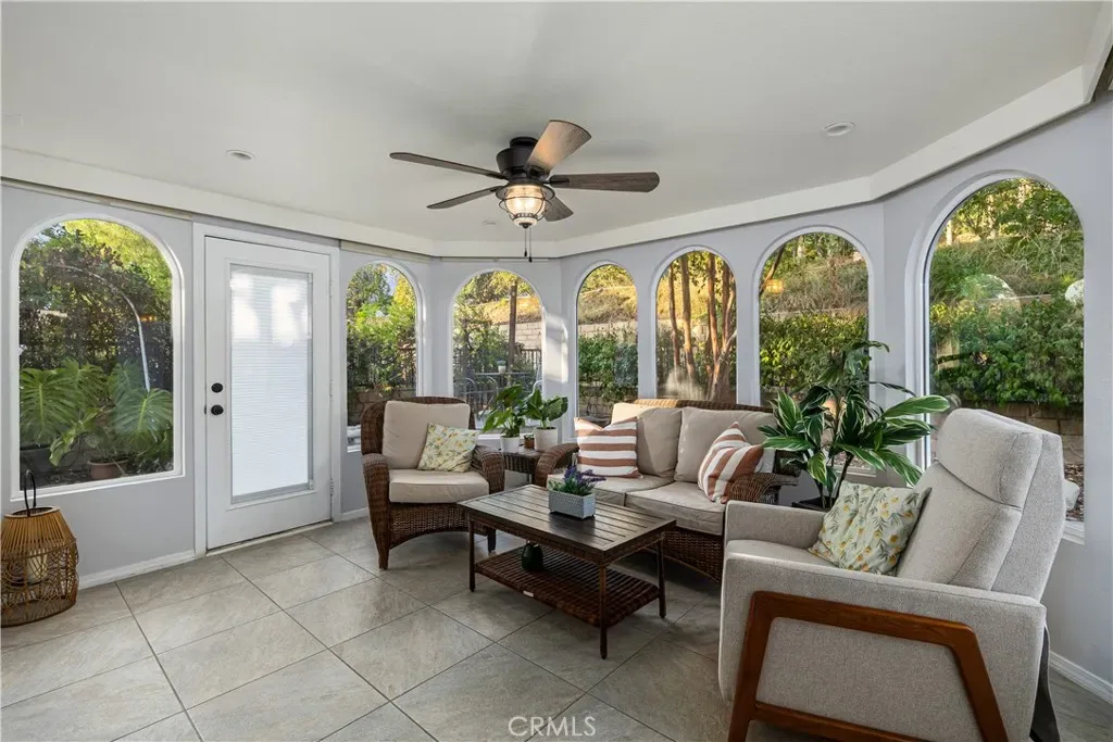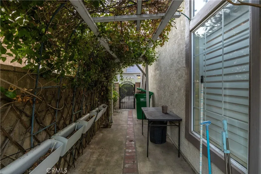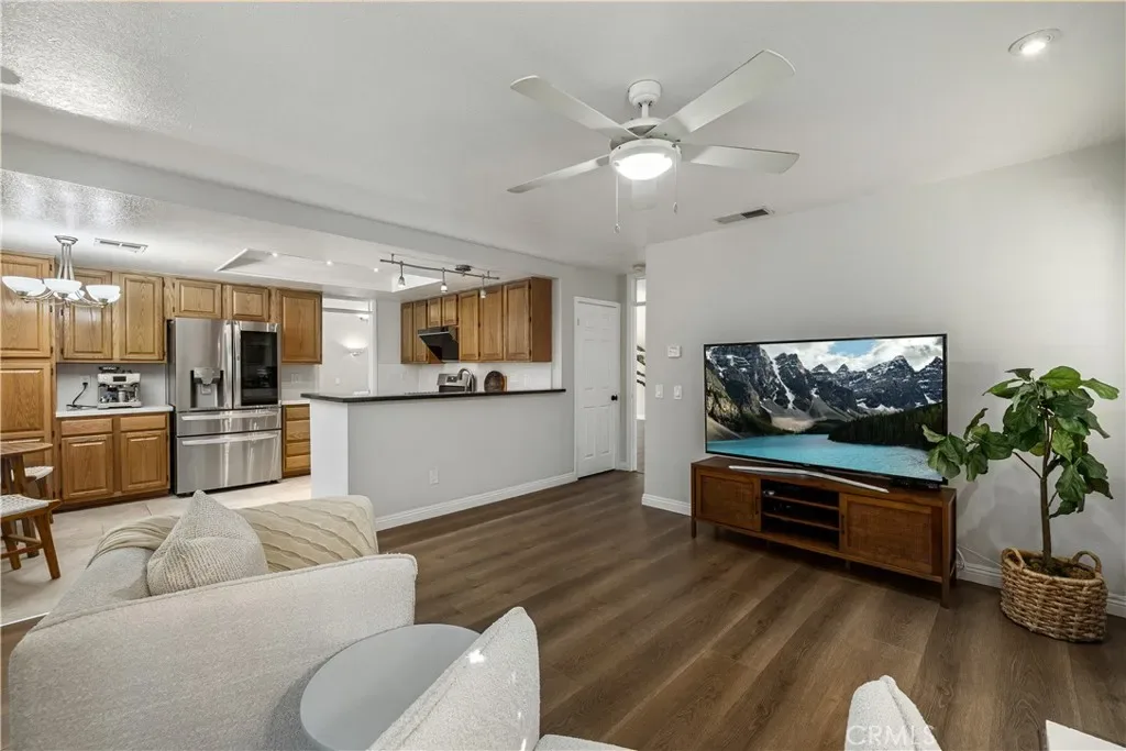 Remodeled home situated in a tucked lot of a quiet cul-de-sac located in the Emerald Ridge at Live Oak gated community. This home offers a long driveway leading to a two-car garage, landscaped front yard, and a covered front porch. Inside, enjoy soaring ceilings and a bright, open floor plan with a view of the center staircase and the living room featuring durable LVP flooring, large windows with plantation shutters, and an adjacent formal dining room with a chandelier and backyard view. The updated kitchen includes wood cabinetry, quartz countertops with full backsplash, stainless steel appliances, recessed lighting, and a breakfast nook, and is open to the family room. The family room has a fireplace with a mantel, windows with shutters, and access through glass French doors to a versatile space, ideal as a playroom, office, or additional lounge, that can remain private or open to the family room. Downstairs also offers a bedroom with double entry doors (currently used as an office), a remodeled bathroom with a custom tiled shower and updated vanity, a laundry room with cabinetry, and direct access to the attached two-car garage. Upstairs, the primary bedroom features a vaulted ceiling, double glass French doors leading to a balcony with mountain and greenbelt views, and direct access to the bathroom. The bathroom offers travertine tile in a versailles pattern, dual sinks, a frameless glass shower, separate tub with greenbelt views, and a walk-in closet with mirrored doors. Two additional bedrooms and a remodeled hall bathroom complete the upstairs. The backyard is set against the greenbelt with no direct neighbor, custom stonework, various trees, planters, a small wood deck, a stone fountain waterfall, and two side yards. The HOA offers a pool, spa, and an RV storage area for residents nearby. Choose La Verne or Claremont Schools, if La Verne, it’s Bonita Unified and attends Oak Mesa Elementary.