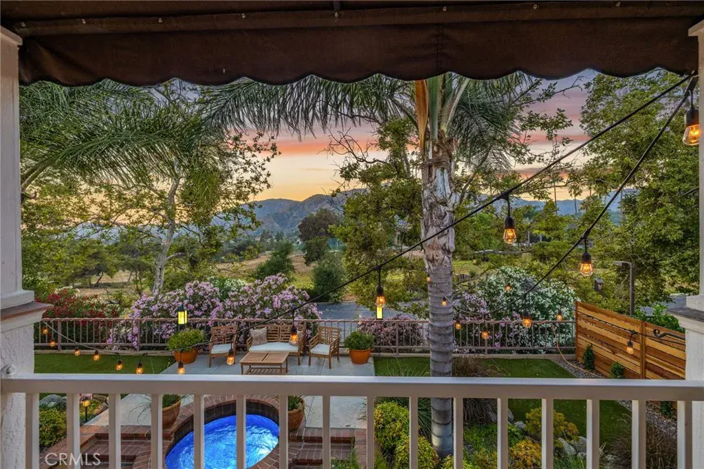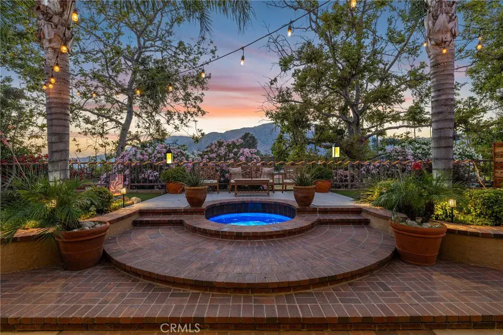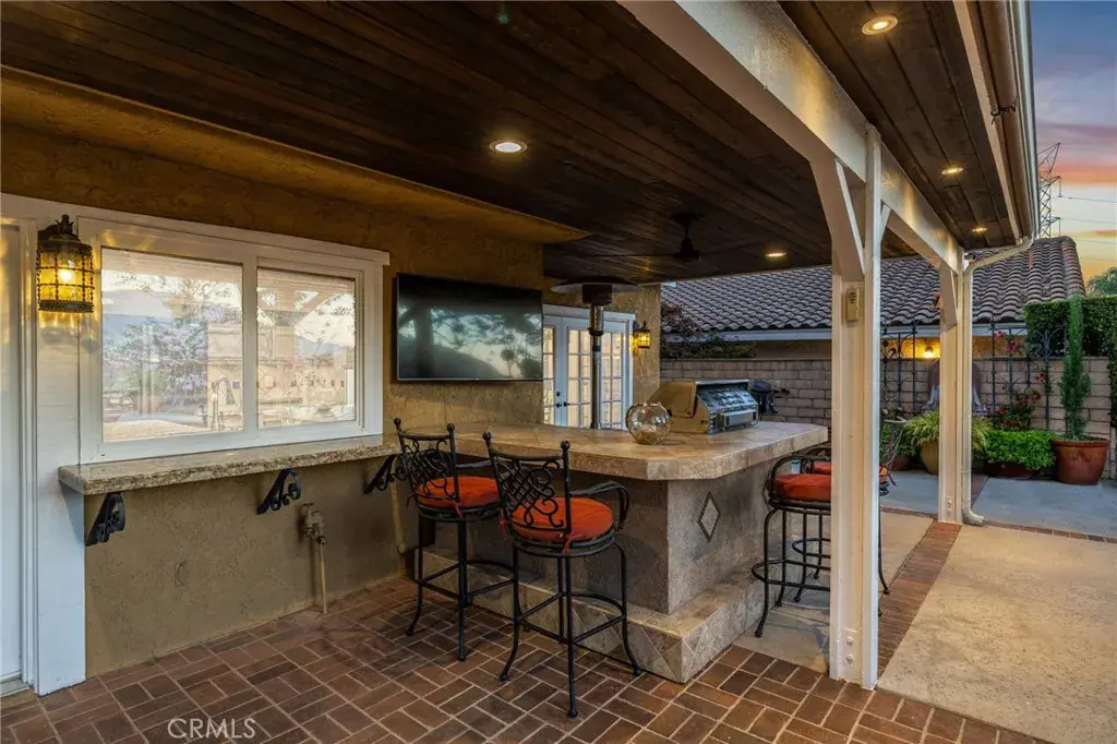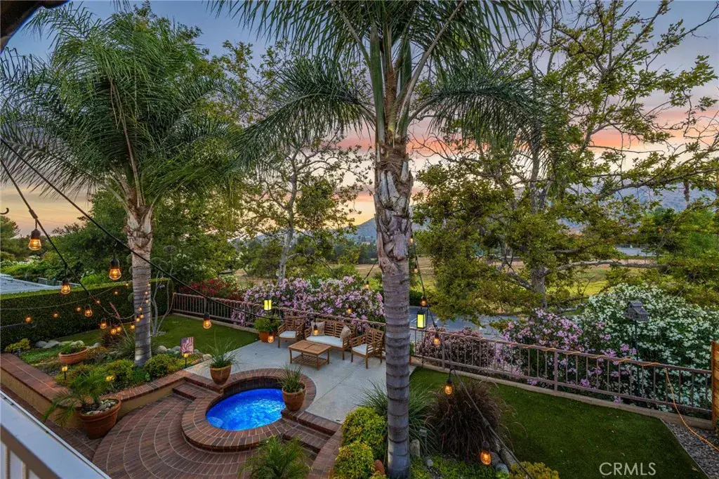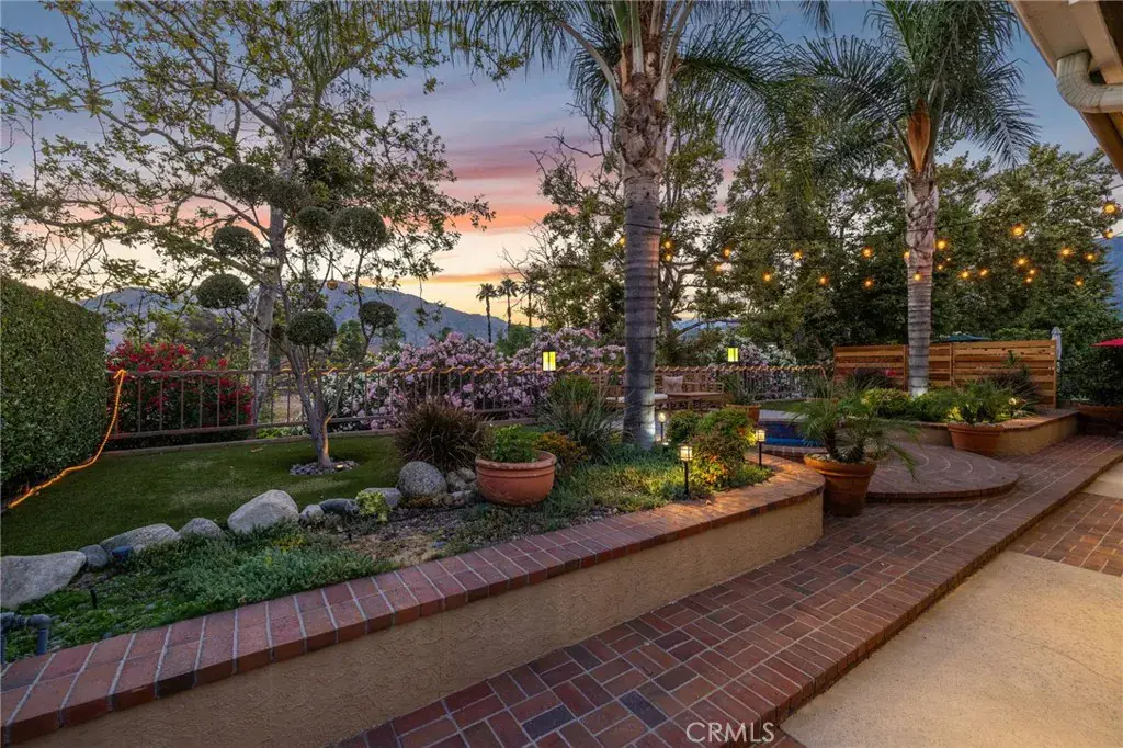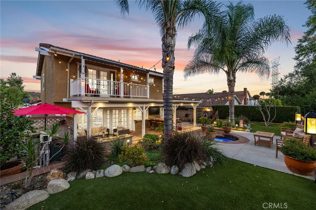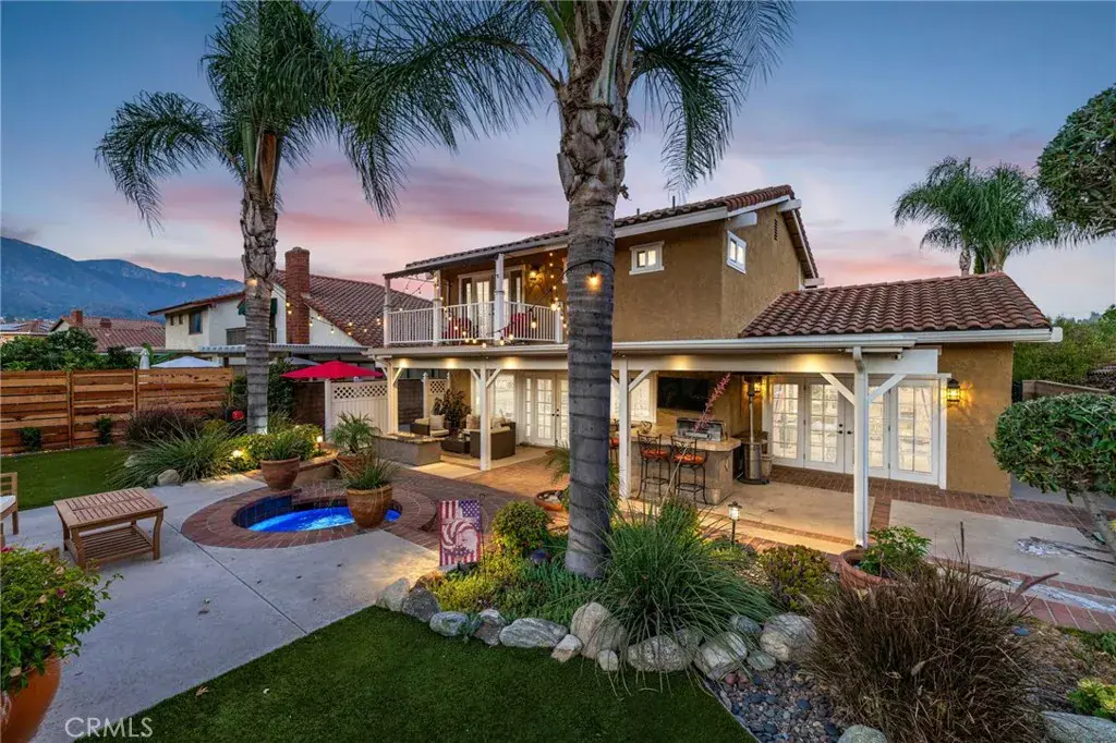 Beautifully positioned against a mountain-view backdrop, this thoughtfully updated home blends timeless character with functional living and inviting outdoor spaces. The front yard offers a warm first impression with mature landscaping, brick-accented steps, and a private gated courtyard leading to a covered brick porch. Soft lighting and classic tile roofing enhance the home’s curb appeal. Inside, a foyer with tile flooring opens to the formal living room, featuring a vaulted ceiling accented by decorative white trim, a stone-surround fireplace, white mantel, and a large front-facing window. The adjacent dining area continues the vaulted ceilings and is anchored by a wrought-iron chandelier, French doors to the exterior, and direct kitchen access. The kitchen is appointed with wood cabinetry, granite countertops, a full tile backsplash, recessed lighting, and an inset ceiling with crown molding. A peninsula with bar seating and a window overlooking the backyard and mountains add both function and natural light. The adjoining family room offers an open layout with crown molding, French doors, a spanning window to the backyard, and a built-in wet bar with granite counters and a beverage refrigerator. The main level also includes a remodeled half bath and a dedicated laundry room. Upstairs, the primary suite features carpeted floors, a vaulted ceilings, and French doors leading to a private balcony with panoramic views. The ensuite bath offers dual sinks with granite countertops, a custom tiled shower with glass enclosure, and a walk-in closet with built-ins. Two additional bedrooms provide ceiling fans and view windows, including one with a built-in desk, complemented by a remodeled hall bath with granite vanity and tiled shower. The finished two-car garage includes extensive cabinetry and a long workbench for added storage and workspace. The backyard is designed for both entertaining and everyday enjoyment, highlighted by a raised brick patio centered around a circular spa, mature landscaping, and palm trees. A covered patio spans the rear of the home and features a built-in barbecue with bar seating, creating a seamless extension of the indoor living areas, all set against scenic mountain views.