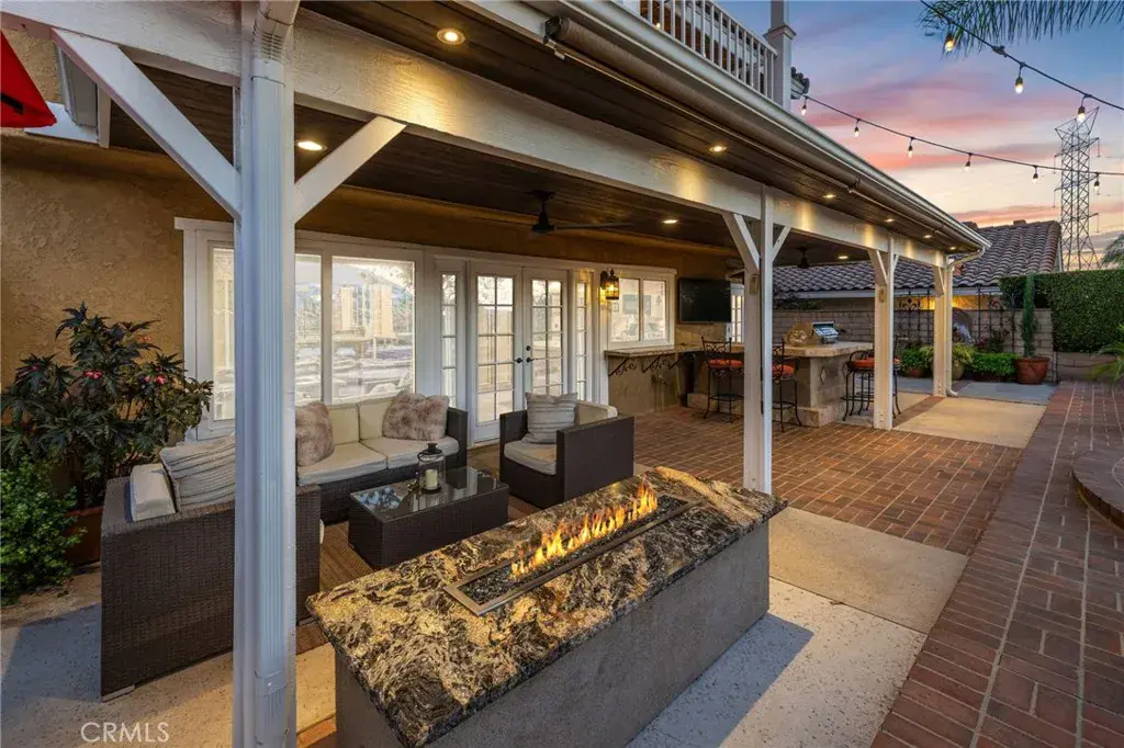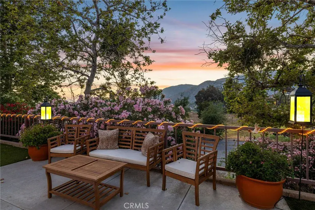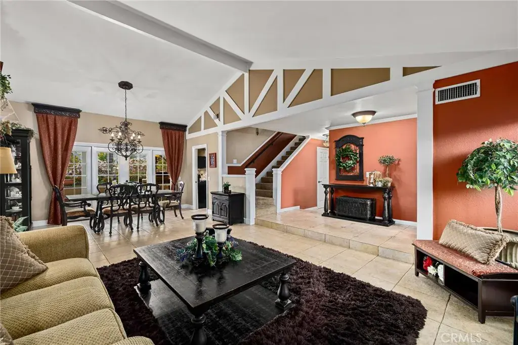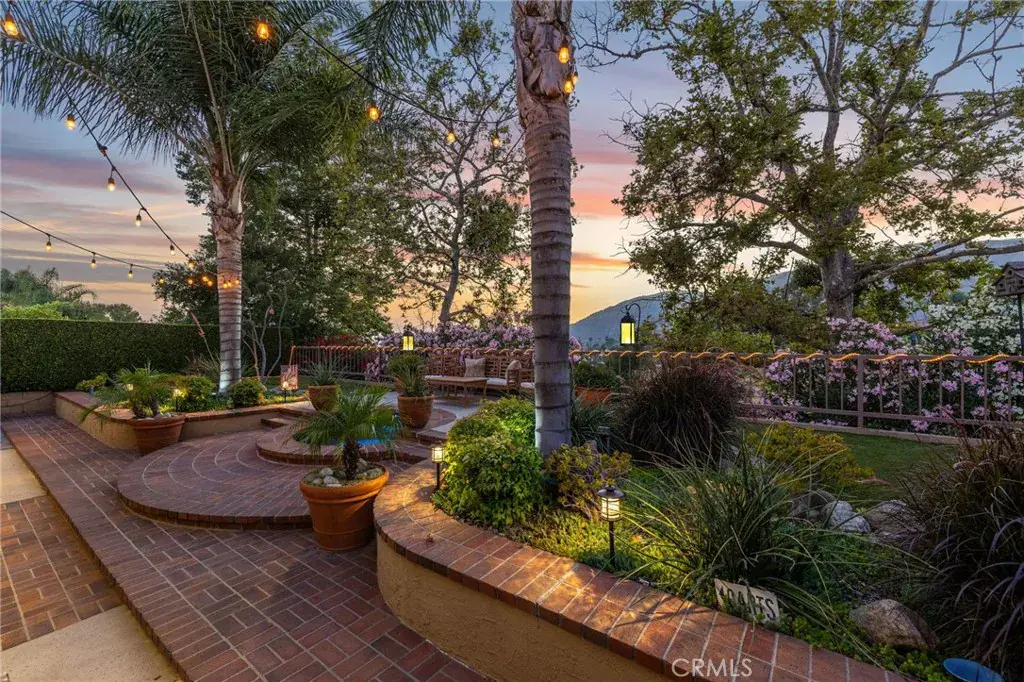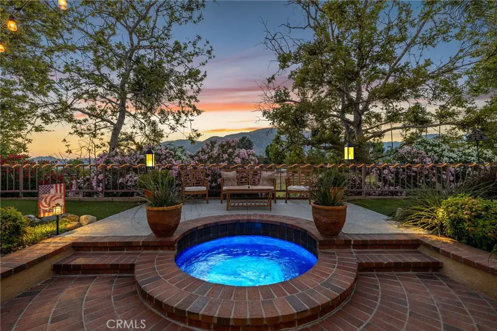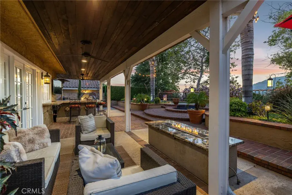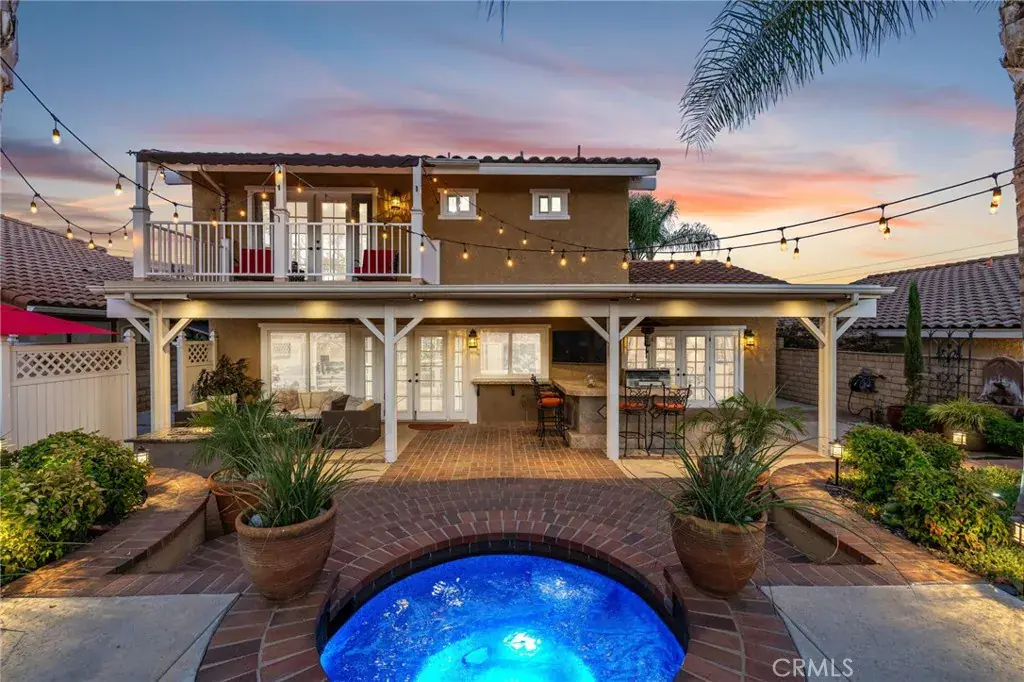 Beautifully positioned against a mountain-view backdrop, this thoughtfully updated home blends timeless character with functional living and inviting outdoor spaces. The front yard offers a warm first impression with mature landscaping, brick-accented steps, and a private gated courtyard leading to a covered brick porch. Soft lighting and classic tile roofing enhance the home’s curb appeal. Inside, a foyer with tile flooring opens to the formal living room, featuring a vaulted ceiling accented by decorative white trim, a stone-surround fireplace, white mantel, and a large front-facing window. The adjacent dining area continues the vaulted ceilings and is anchored by a wrought-iron chandelier, French doors to the exterior, and direct kitchen access. The kitchen is appointed with wood cabinetry, granite countertops, a full tile backsplash, recessed lighting, and an inset ceiling with crown molding. A peninsula with bar seating and a window overlooking the backyard and mountains add both function and natural light. The adjoining family room offers an open layout with crown molding, French doors, a spanning window to the backyard, and a built-in wet bar with granite counters and a beverage refrigerator. The main level also includes a remodeled half bath and a dedicated laundry room. Upstairs, the primary suite features carpeted floors, a vaulted ceilings, and French doors leading to a private balcony with panoramic views. The ensuite bath offers dual sinks with granite countertops, a custom tiled shower with glass enclosure, and a walk-in closet with built-ins. Two additional bedrooms provide ceiling fans and view windows, including one with a built-in desk, complemented by a remodeled hall bath with granite vanity and tiled shower. The finished two-car garage includes extensive cabinetry and a long workbench for added storage and workspace. The backyard is designed for both entertaining and everyday enjoyment, highlighted by a raised brick patio centered around a circular spa, mature landscaping, and palm trees. A covered patio spans the rear of the home and features a built-in barbecue with bar seating, creating a seamless extension of the indoor living areas, all set against scenic mountain views.