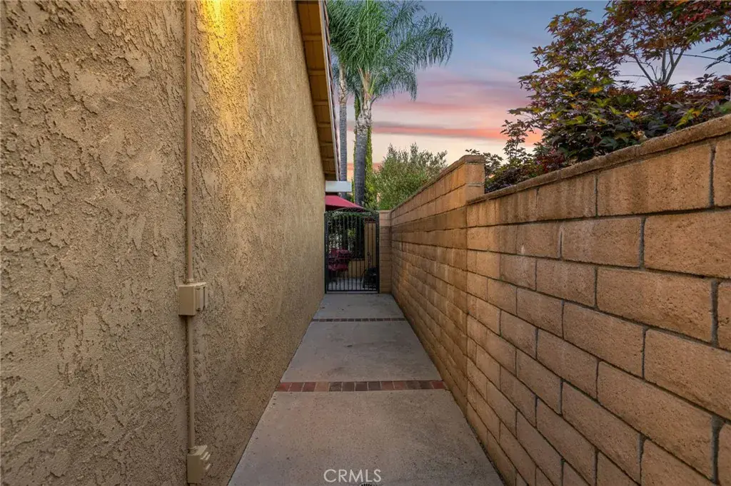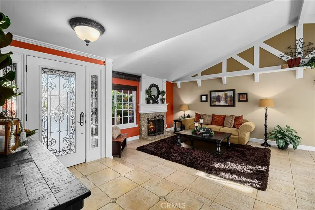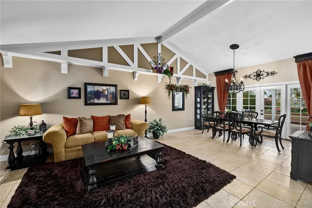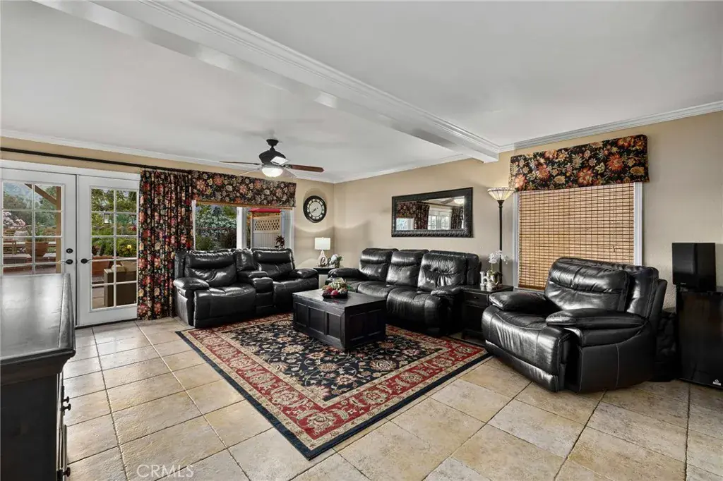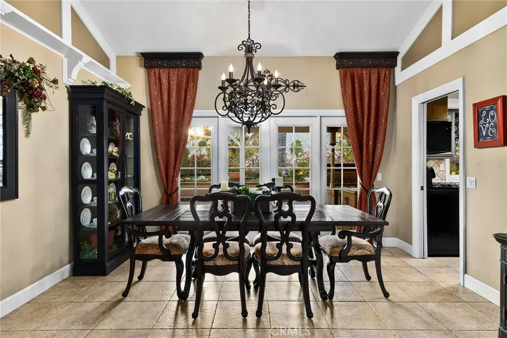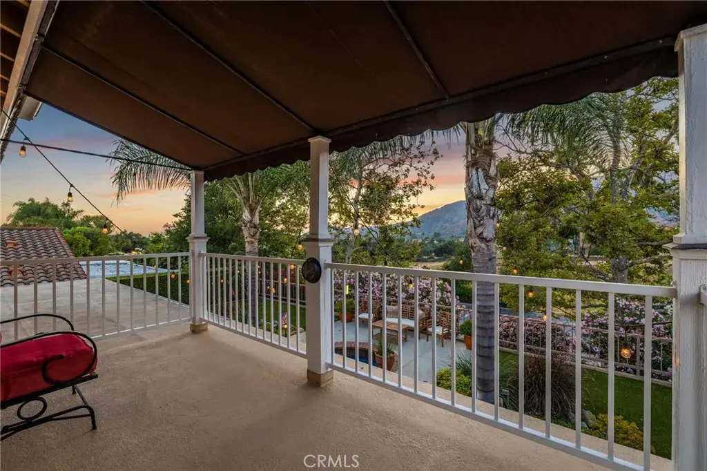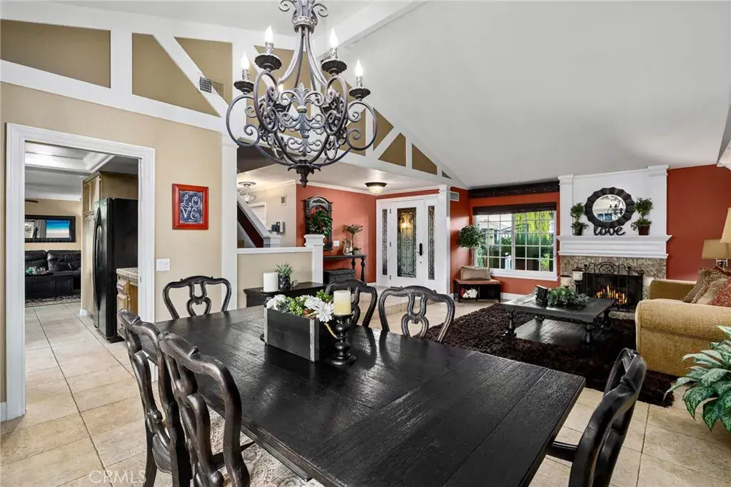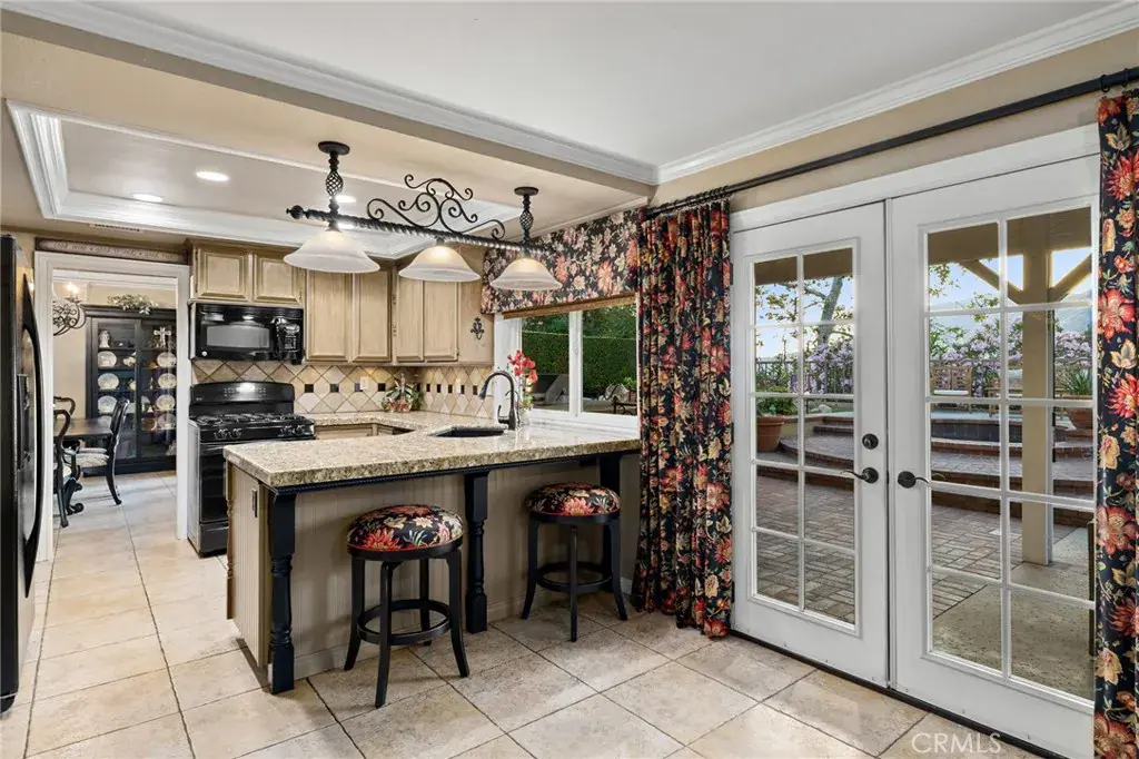 Beautifully positioned against a mountain-view backdrop, this thoughtfully updated home blends timeless character with functional living and inviting outdoor spaces. The front yard offers a warm first impression with mature landscaping, brick-accented steps, and a private gated courtyard leading to a covered brick porch. Soft lighting and classic tile roofing enhance the home’s curb appeal. Inside, a foyer with tile flooring opens to the formal living room, featuring a vaulted ceiling accented by decorative white trim, a stone-surround fireplace, white mantel, and a large front-facing window. The adjacent dining area continues the vaulted ceilings and is anchored by a wrought-iron chandelier, French doors to the exterior, and direct kitchen access. The kitchen is appointed with wood cabinetry, granite countertops, a full tile backsplash, recessed lighting, and an inset ceiling with crown molding. A peninsula with bar seating and a window overlooking the backyard and mountains add both function and natural light. The adjoining family room offers an open layout with crown molding, French doors, a spanning window to the backyard, and a built-in wet bar with granite counters and a beverage refrigerator. The main level also includes a remodeled half bath and a dedicated laundry room. Upstairs, the primary suite features carpeted floors, a vaulted ceilings, and French doors leading to a private balcony with panoramic views. The ensuite bath offers dual sinks with granite countertops, a custom tiled shower with glass enclosure, and a walk-in closet with built-ins. Two additional bedrooms provide ceiling fans and view windows, including one with a built-in desk, complemented by a remodeled hall bath with granite vanity and tiled shower. The finished two-car garage includes extensive cabinetry and a long workbench for added storage and workspace. The backyard is designed for both entertaining and everyday enjoyment, highlighted by a raised brick patio centered around a circular spa, mature landscaping, and palm trees. A covered patio spans the rear of the home and features a built-in barbecue with bar seating, creating a seamless extension of the indoor living areas, all set against scenic mountain views.