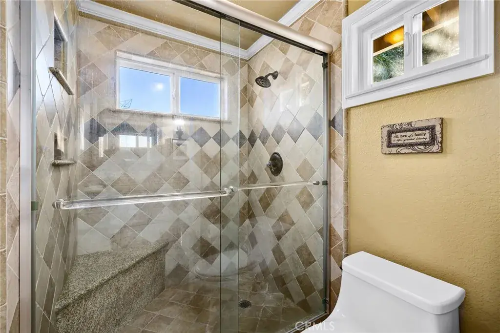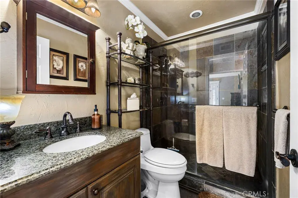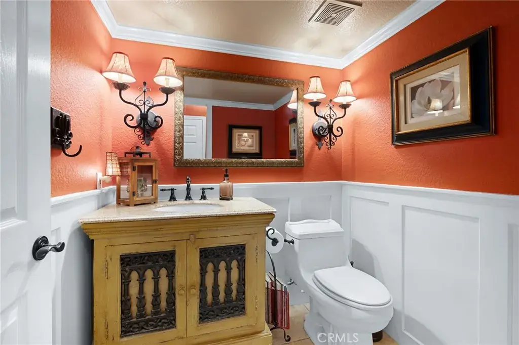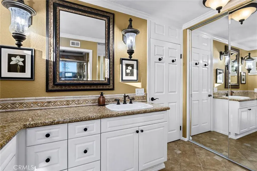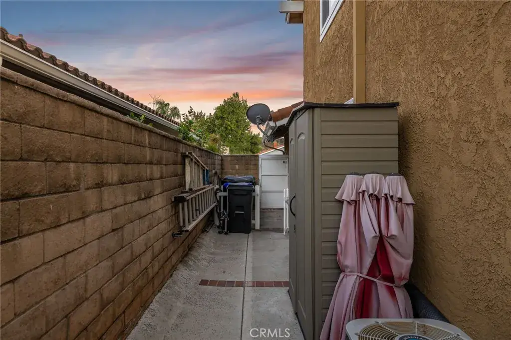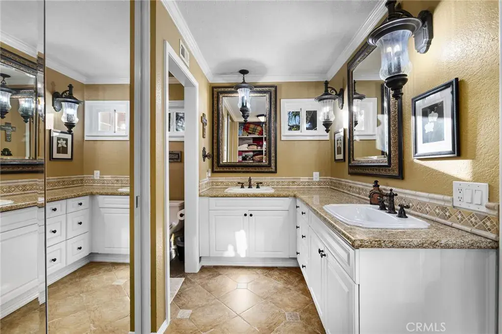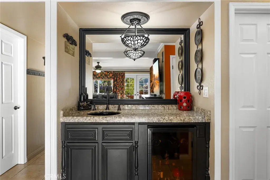 Beautifully positioned against a mountain-view backdrop, this thoughtfully updated home blends timeless character with functional living and inviting outdoor spaces. The front yard offers a warm first impression with mature landscaping, brick-accented steps, and a private gated courtyard leading to a covered brick porch. Soft lighting and classic tile roofing enhance the home’s curb appeal. Inside, a foyer with tile flooring opens to the formal living room, featuring a vaulted ceiling accented by decorative white trim, a stone-surround fireplace, white mantel, and a large front-facing window. The adjacent dining area continues the vaulted ceilings and is anchored by a wrought-iron chandelier, French doors to the exterior, and direct kitchen access. The kitchen is appointed with wood cabinetry, granite countertops, a full tile backsplash, recessed lighting, and an inset ceiling with crown molding. A peninsula with bar seating and a window overlooking the backyard and mountains add both function and natural light. The adjoining family room offers an open layout with crown molding, French doors, a spanning window to the backyard, and a built-in wet bar with granite counters and a beverage refrigerator. The main level also includes a remodeled half bath and a dedicated laundry room. Upstairs, the primary suite features carpeted floors, a vaulted ceilings, and French doors leading to a private balcony with panoramic views. The ensuite bath offers dual sinks with granite countertops, a custom tiled shower with glass enclosure, and a walk-in closet with built-ins. Two additional bedrooms provide ceiling fans and view windows, including one with a built-in desk, complemented by a remodeled hall bath with granite vanity and tiled shower. The finished two-car garage includes extensive cabinetry and a long workbench for added storage and workspace. The backyard is designed for both entertaining and everyday enjoyment, highlighted by a raised brick patio centered around a circular spa, mature landscaping, and palm trees. A covered patio spans the rear of the home and features a built-in barbecue with bar seating, creating a seamless extension of the indoor living areas, all set against scenic mountain views.