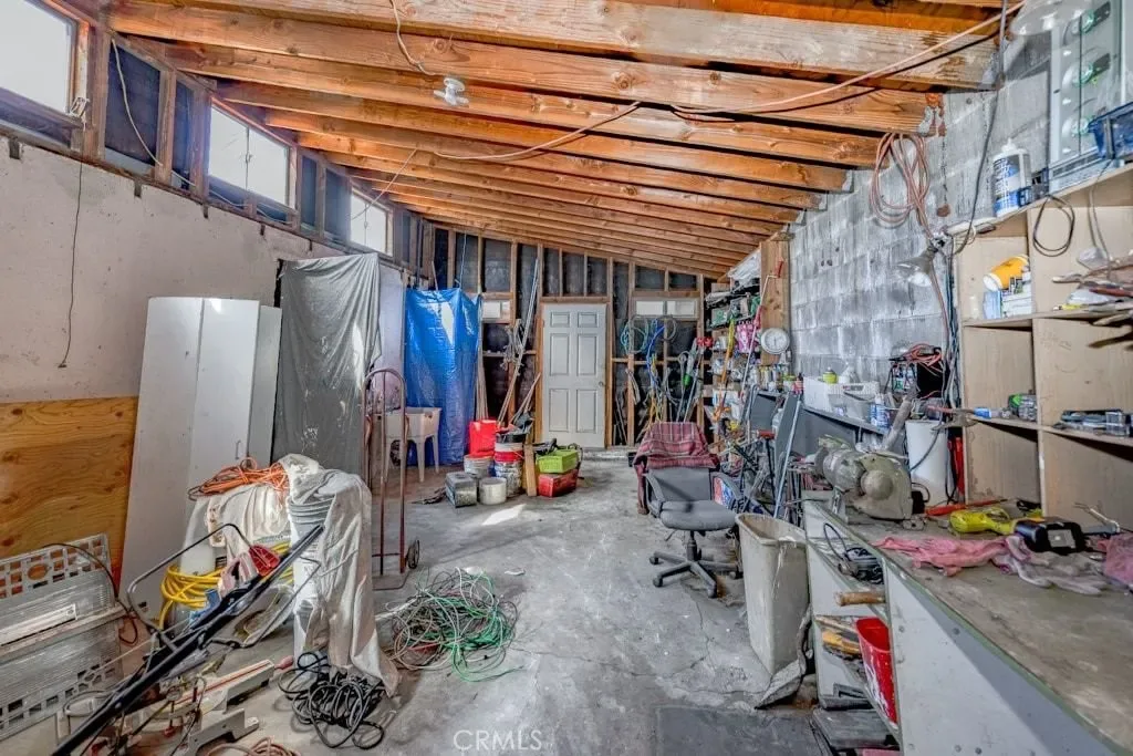 The garage structure also includes two individual garage bays serving the main units, plus a large dedicated workshop/storage area with stackable laundry, offering exceptional flexibility for supplemental income, creative use, or extended living arrangements.