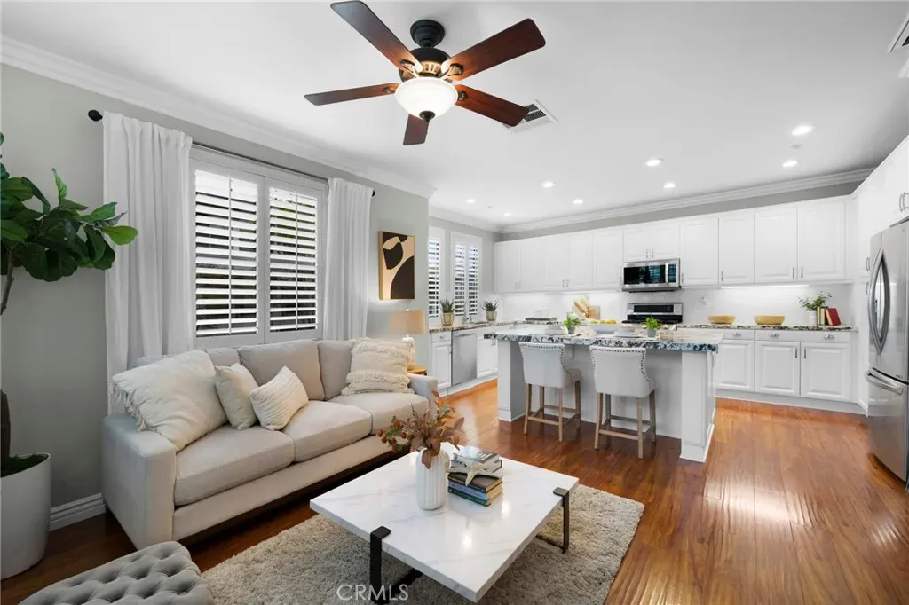 **HIGHLY DESIRABLE END UNIT and RARELY AVAILBLE PARK-FACING LOCATION** This timeless style home offers an abundance of natural light, park-facing, and 1,761 square feet of living space with 3 Bedrooms and 2.5 Baths. As one of the most sought-after floor plans and locations in Briar Rose, it has high ceilings with a separate formal living room and dining room featuring a peninsula fireplace adjacent to the family room and gourmet-style kitchen. The kitchen features an oversized island perfect for entertaining and is equipped with stainless steel appliances, generous cabinet space, subway tile backsplash and beautiful granite counter tops. The primary bedroom has a dual entry walk-in closet and primary bath with dual sinks with separate soaking tub and shower. Charming secondary bedrooms are both light and bright with generous closet space; full hallway bath adjacent. Dedicated upstairs laundry room with linen cabinet and folding counter offer ample storage space. The generously sized 2-car garage includes a bonus storage area. As you tour the home, you will also find many upgrades which include crown molding, tall baseboards, quartz counter tops in bathrooms, hardwood style and ceramic flooring, plantation shutters, recessed lighting, custom paint, tankless water heater and re-piped with Pex piping. Walking distance to Oso Grande Elementary. Enjoy the award-winning community amenities that Ladera Ranch has to offer!