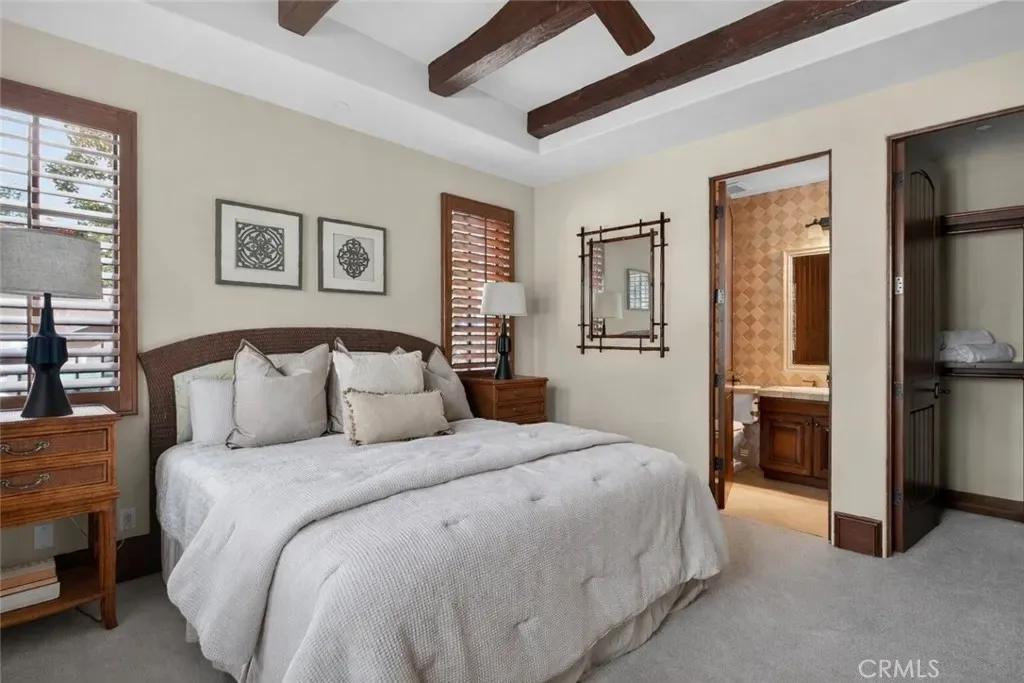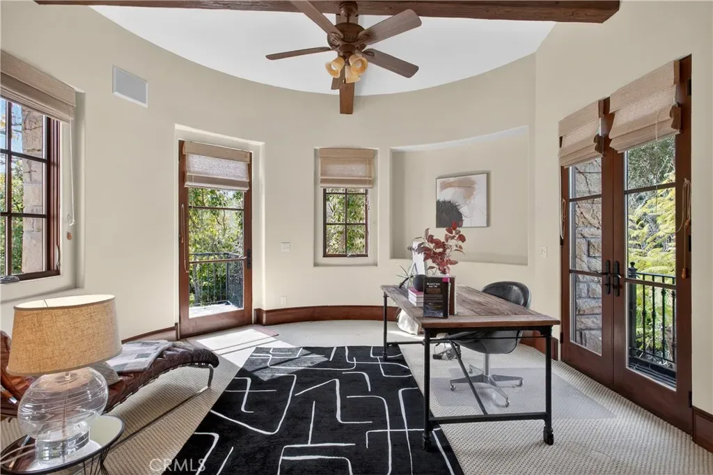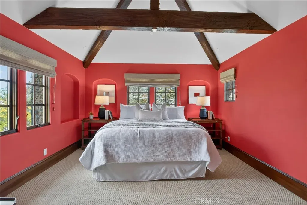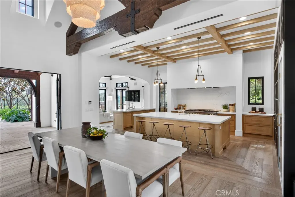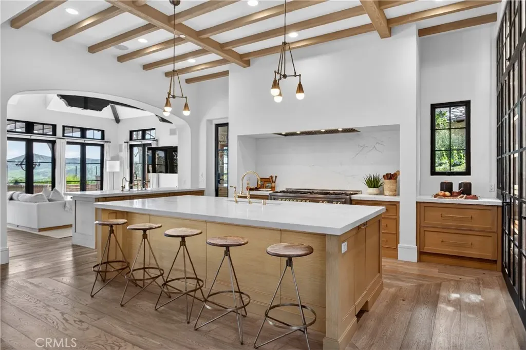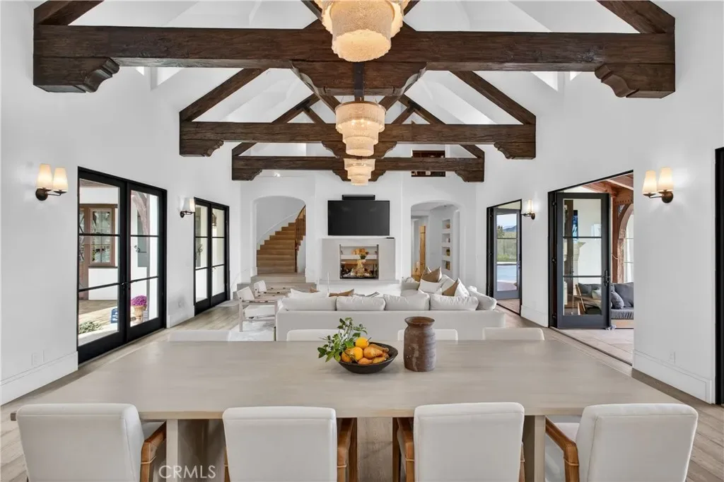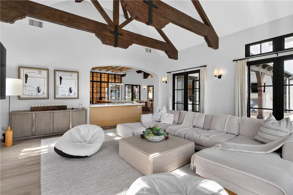 A gated entry leads to a serene courtyard where natural landscaping and a fountain set a tranquil tone. Inside, French oak floors, soaring cathedral ceilings, adorned with beautifully crafted beams and walls of French doors bathe the home in uplifting natural light, creating an inviting flow that blurs the line between indoors and out.