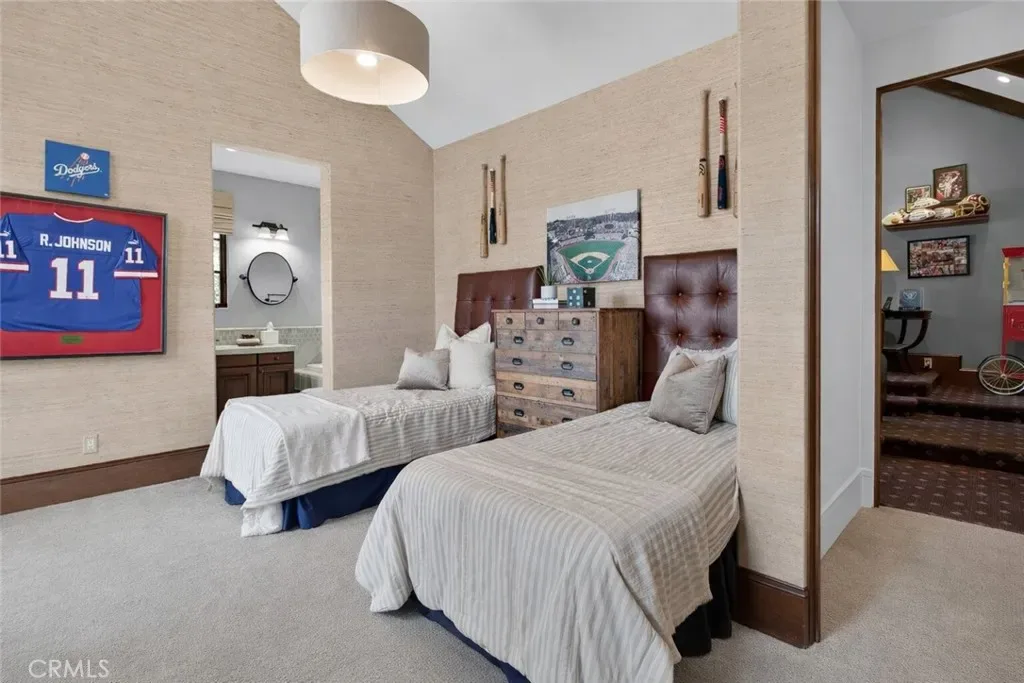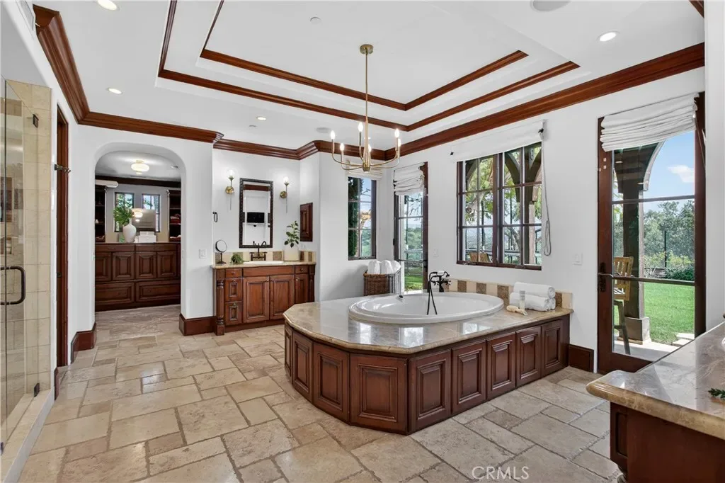 The main-floor primary suite is a private oasis with its own upstairs retreat—ideal for a nursery, gym, or office—plus a spacious walk-in closet with island. The spa-like bath features a jetted tub, separate shower, dual toilets, and a dedicated vanity.