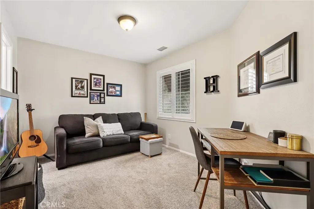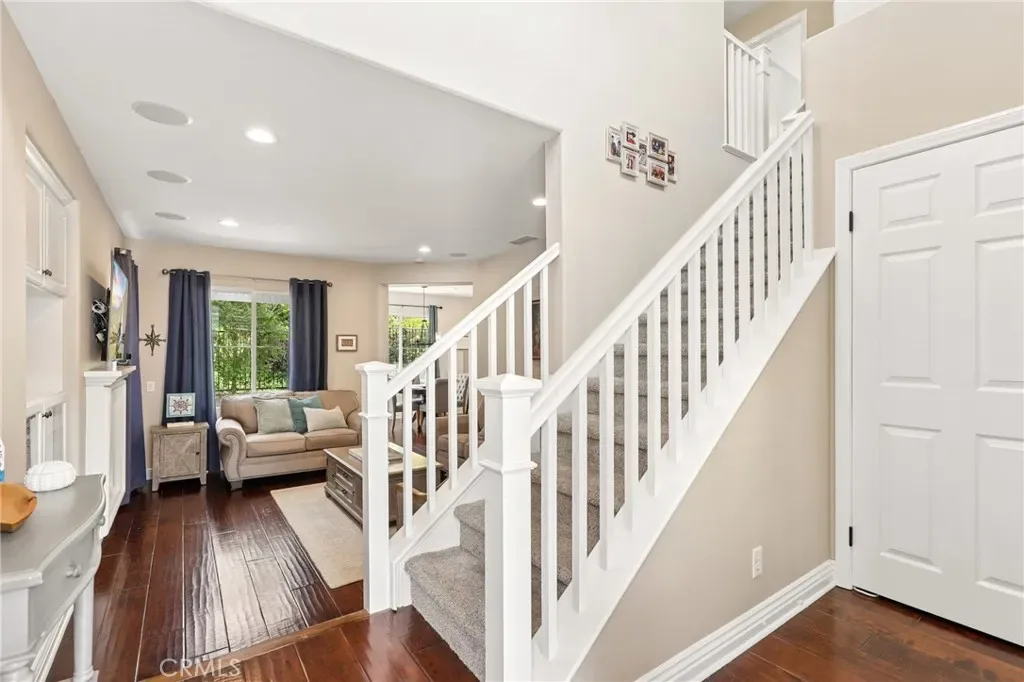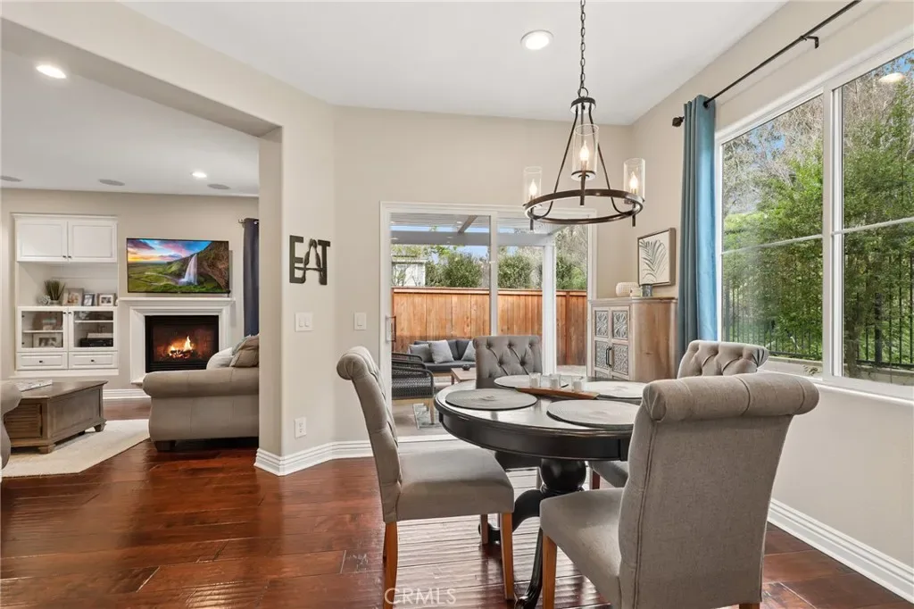 This inviting home features rich hardwood flooring throughout the downstairs living areas, creating a warm and elegant atmosphere. The cozy fireplace anchors the living space, while sliding glass doors open to a private backyard designed for easy California living.