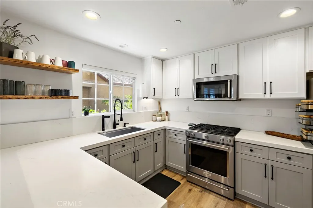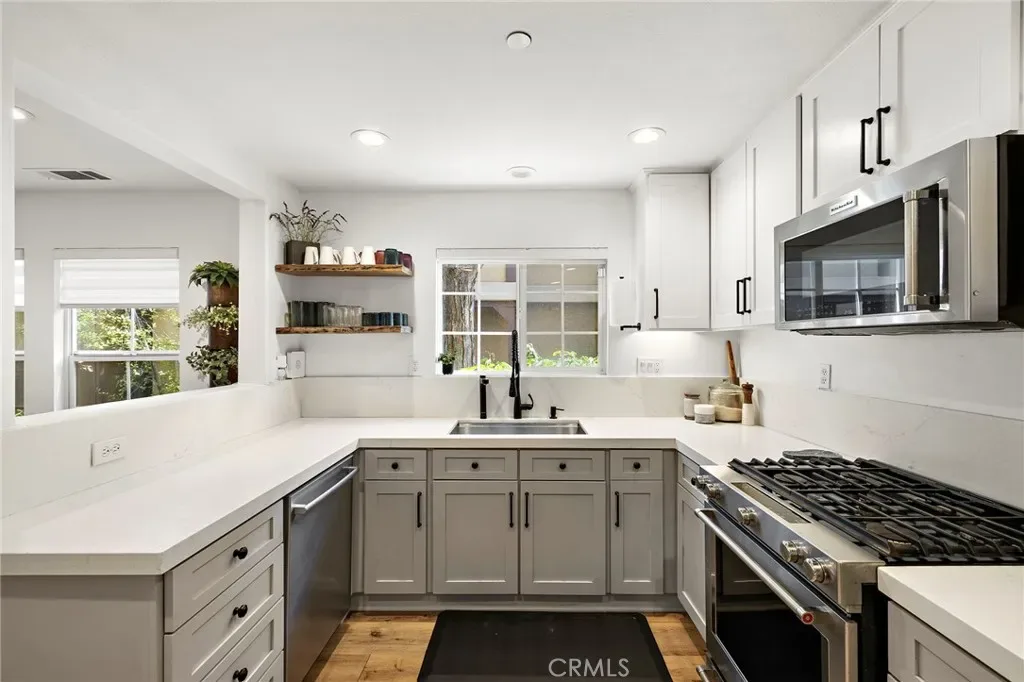Inside, the kitchen has been tastefully redesigned with refaced shaker cabinetry, honed quartz countertops, a deep stainless sink, and a dedicated reverse osmosis water system. The open-concept living and dining areas feel bright and elevated, featuring LVP flooring, recessed lighting on dimmers, and remote-controlled blinds for added comfort and convenience.