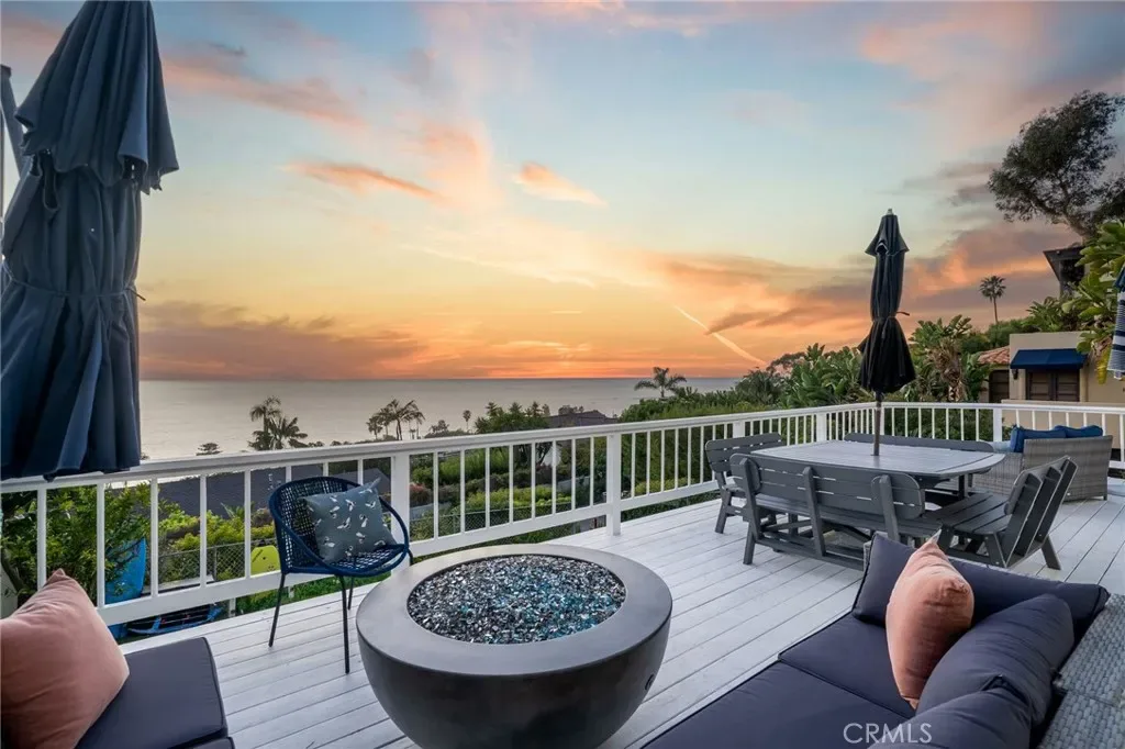 Welcome to 31331 Holly Drive, with seeping 180-degree ocean views, this rare street-to-street South Laguna residence captures the coastline, open Pacific, and unforgettable Catalina Island sunsets from a truly front-row setting. Enter from Holly Drive and exit to Brooks Street below, just minutes from the sand at West Street Beach, a location that perfectly blends privacy, walkability, and iconic scenery. This fully renovated coastal modern spans two levels cascading toward the Pacific, with sweeping ocean views and golden sunsets from nearly every room. Vaulted natural wood ceilings, a fireplace, wide-plank oak floors, and full-wall glass sliders blur the line between indoors and out, opening to a spacious ocean-view deck with fire pit. Front row for Catalina Island sunsets year round. The designer kitchen features a dolomite island, dark shaker cabinetry, and farmhouse sink. The primary suite enjoys its own private ocean-view deck, while the lower level offers two generous bedrooms, two full baths, and an expansive entertaining deck with fire pit. A dedicated studio with glass slider entry, outdoor shower, covered front porch, and detached two-car garage complete the home. Multiple outdoor living zones, endless Pacific views, and one of Laguna’s most coveted stretches of coast.