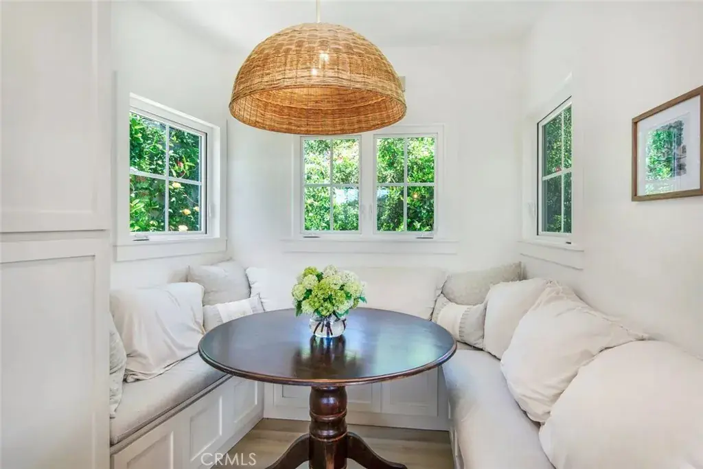 The stylish chef’s kitchen features custom-designed cabinets, a farmhouse sink, and a breakfast bar. The adjacent dining room features built-in custom bench seating with plenty of extra storage.