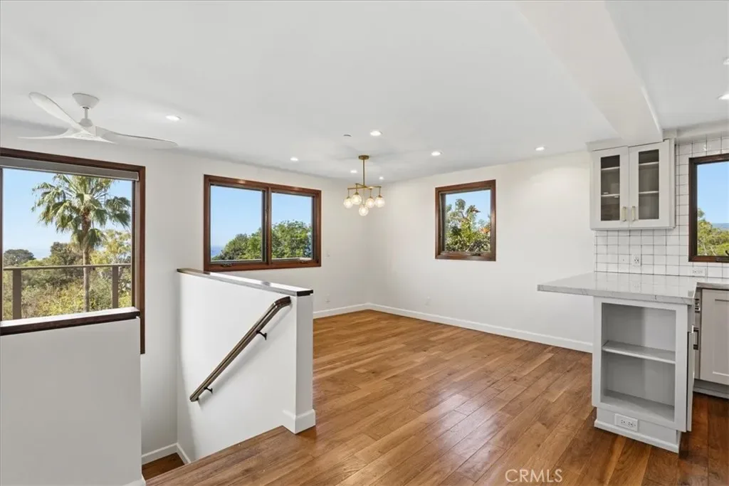 Welcome to coastal living at its finest in the heart of Laguna Beach. This exceptional residence offers a rare combination of ocean views, comfort, and everyday convenience in the highly sought-after Village neighborhood. The home features five bedrooms and three-and-a-half bathrooms—a rare offering in Laguna Beach—thoughtfully designed for both comfortable family living and effortless entertaining. On the top level, a light-filled living room showcases stunning Pacific Ocean views through a wall of windows and features rich hardwood flooring and a cozy fireplace, creating a warm and inviting gathering space. The gourmet kitchen is appointed with quartzite countertops, custom cabinetry, and stainless-steel appliances—perfect for preparing meals while staying connected with family and guests. Multiple outdoor spaces—including Brazilian Ipe hardwood view decks on all three levels—provide ideal settings for relaxing, dining, and enjoying the coastal breeze. The flexible floor plan includes three bedrooms on the main living level, including a primary suite featuring a spa-inspired bathroom with an ocean-view soaking tub, walk-in closet, and direct access to a peaceful outdoor deck.