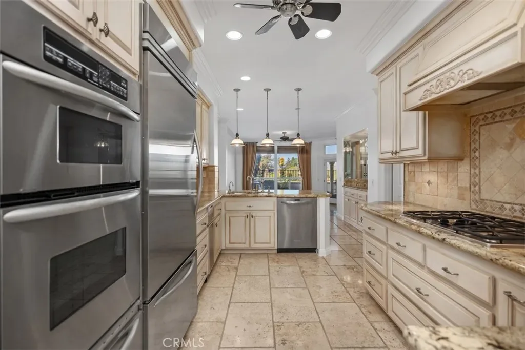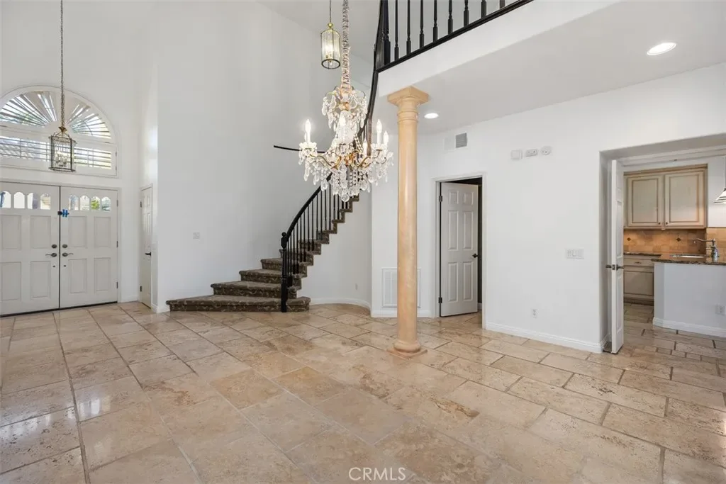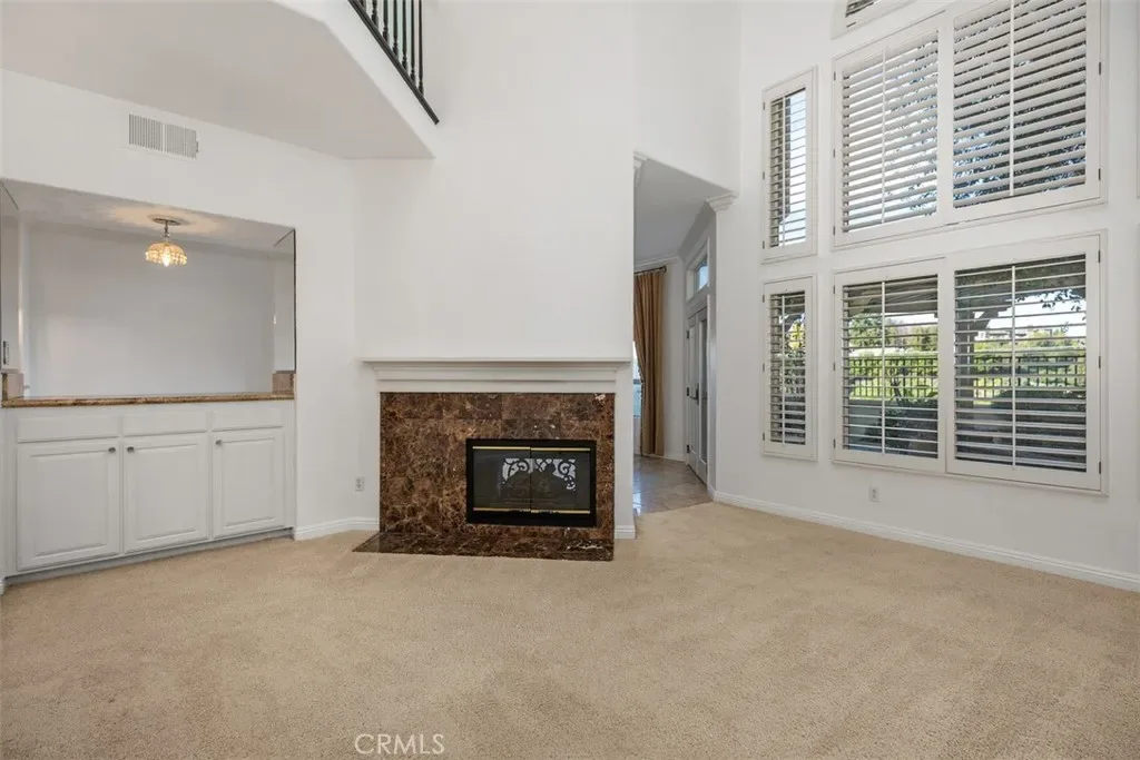 This beautiful view townhome has it all. The panoramic view encompasses the mountains, hills, city lights, and is only steps away from a large park inside Moulton Ranch. This 3-bedroom 2.5 bath home has 2549 square feet and is located within the gated community of Bella Vista with its own pool and spa. The high ceiling architecture and a skylight brings in tons of light, and the floorplan is open and free flowing. Travertine flooring, granite counters, quartz bathroom counters, and dual sinks in master and guest baths are some of the upgrades. Plantation shutters, ceiling fans, and recessed lights throughout the home plus fireplaces in living room, family room, and master bedroom. The rear patio has a cover for shade, stone pavers, and awesome views. The master bedroom has a fireplace, views, and a mirrored walk-in closet in the bath area with a separate tub and shower. The kitchen has travertine flooring, granite counters, and leads to an inside laundry with gas & 220, then into the 3-car garage with tons of built-in cabinets. This property has it all and is easy to show.