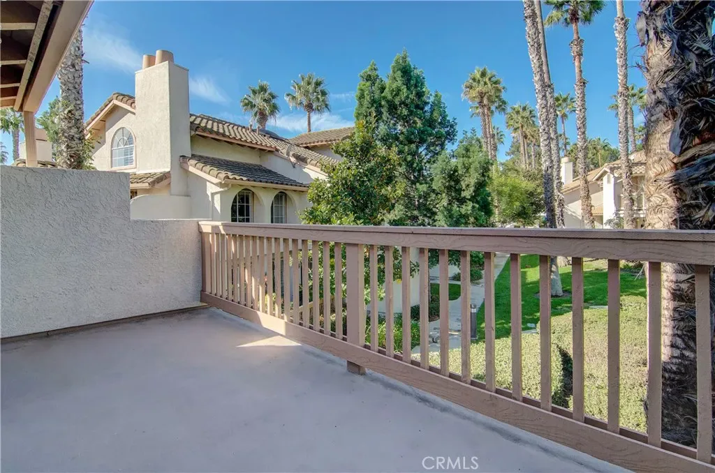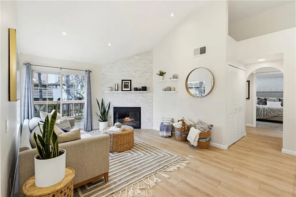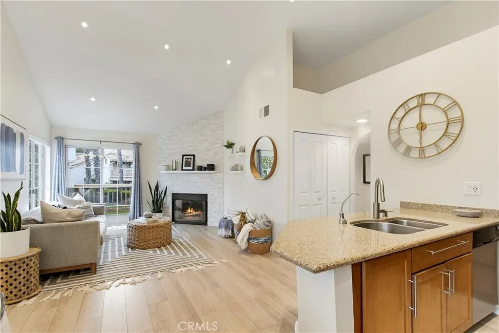 Tucked away in the sought after Briosa community, this stylish and modern upper level 2 bedroom, 1 bathroom condo offers the perfect blend of comfort, function, and charm. From the moment you step inside, the vaulted ceilings and open concept layout create a bright, airy feel that instantly feels like home. The kitchen has been thoughtfully upgraded with granite countertops, a modern tile backsplash, stainless steel appliances, and recessed lighting, perfect for everyday living or entertaining guests. The living area features warm wood laminate flooring and a cozy fireplace accented by a white stacked stone surround, adding a beautiful focal point to the space. Step outside to a private balcony located off both the living room and secondary bedroom, ideal for enjoying California sunsets. The balcony also includes a private storage closet for added convenience. The primary bedroom offers a soft accent wall with ambient lighting, a mirrored walk in closet, and a cozy nook that works beautifully as a reading corner or a spot for a laptop and morning coffee. Briosa is a well maintained community surrounded by lush landscaping and features a pool, spa, park, and walking trails. With nearby access to shopping, dining, and just a short drive to Laguna Beach, Dana Point Harbor, and some of Southern California’s best coastline, this home offers comfort and convenience in a prime location.