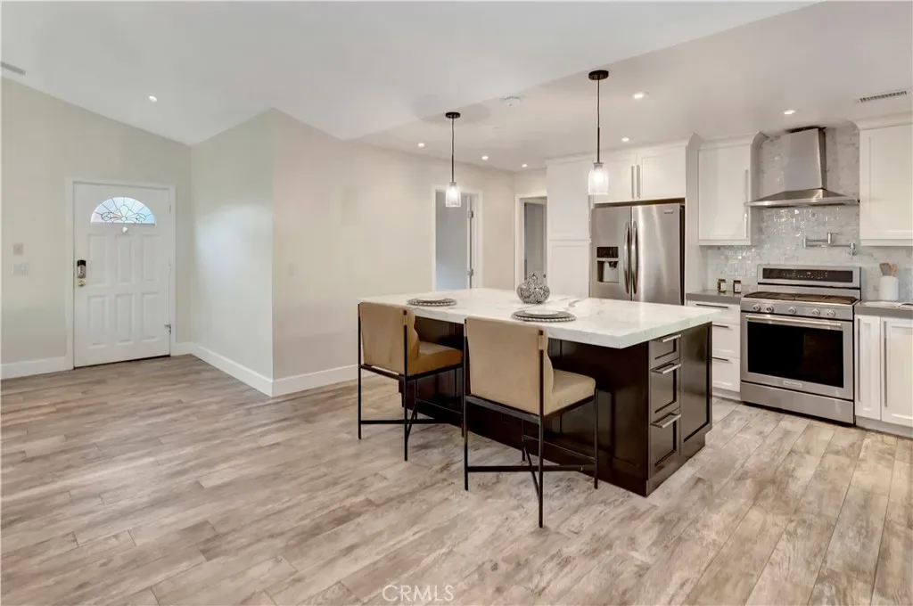 Step inside to an open-concept layout highlighted by a beautifully updated kitchen with elegant marble countertops, a center island, and stainless steel appliances—including the refrigerator. The spacious family room is designed for both relaxation and entertaining, complete with a cozy fireplace and ceiling-mounted surround sound speakers for an immersive experience.