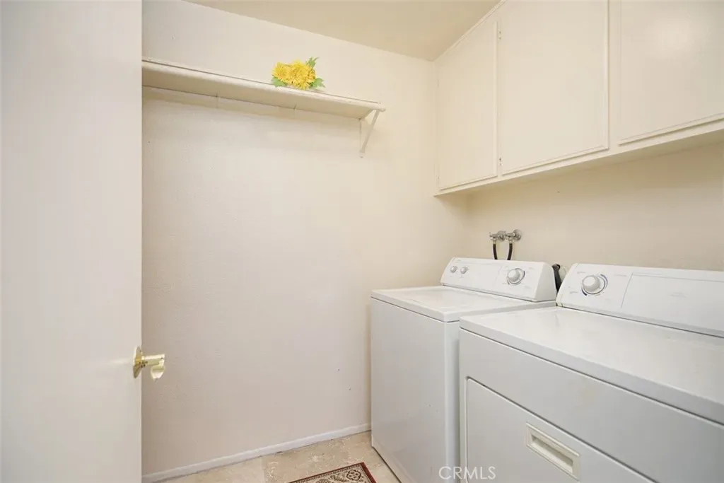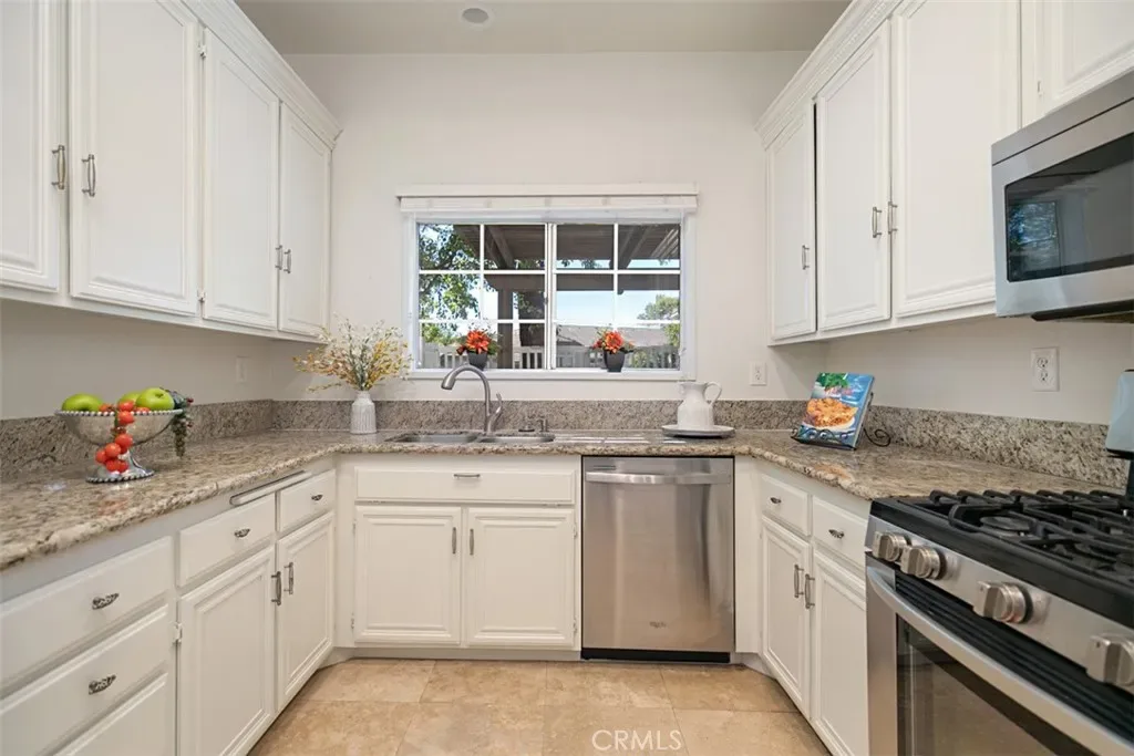 The kitchen is both elegant and functional, showcasing travertine flooring, granite countertops, abundant cabinetry, and stainless steel appliances including sink, oven, dishwasher, and microwave. A separate laundry room just off the kitchen adds everyday convenience and includes washer and dryer.