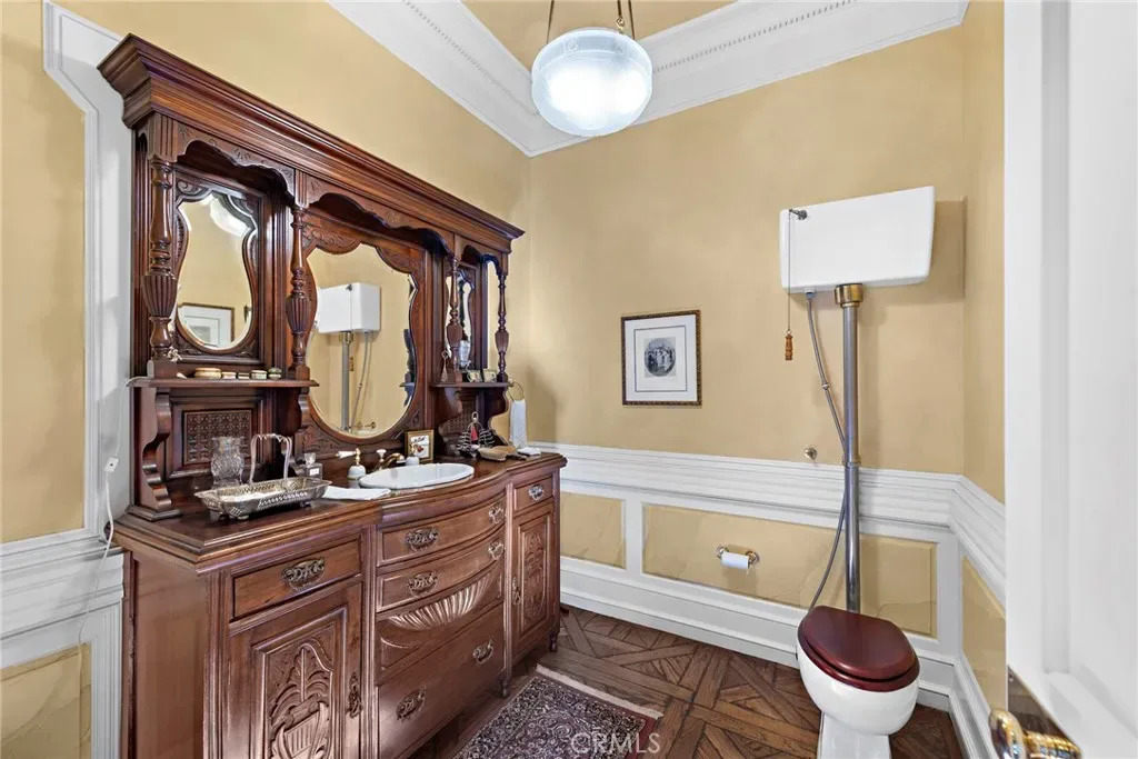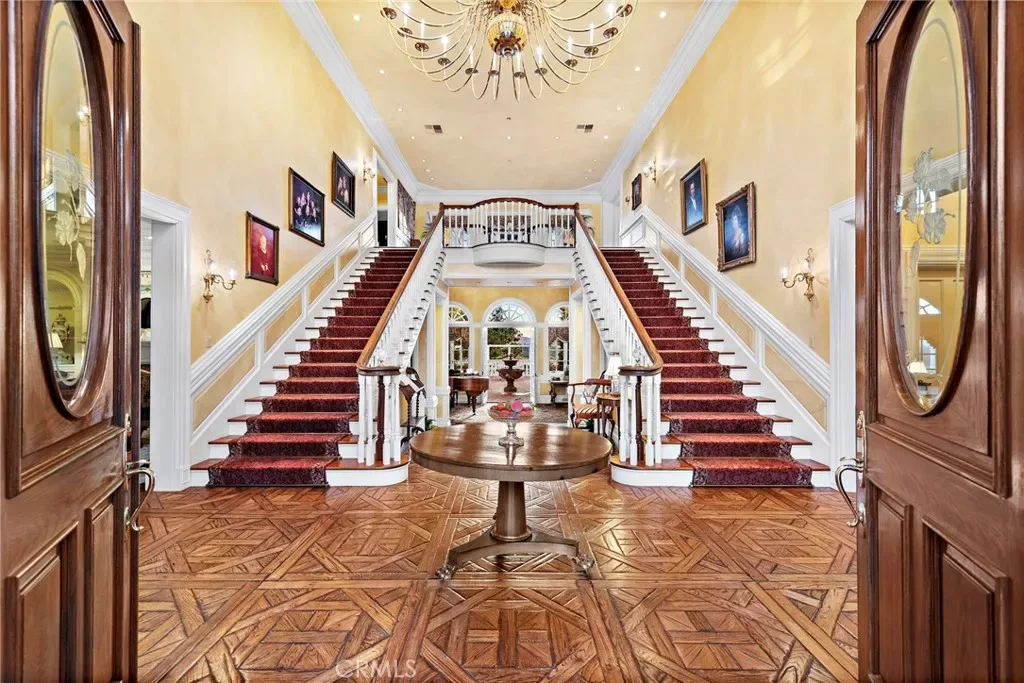 A grand dual staircase welcomes you into a spacious, open interior. Custom hardwood parquet floors flow throughout, complemented by expansive windows that fill the rooms with natural light and capture the breathtaking views. Soaring ceilings, crown molding, and refined finishes throughout further elevate the space.