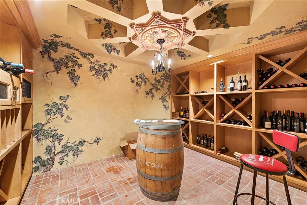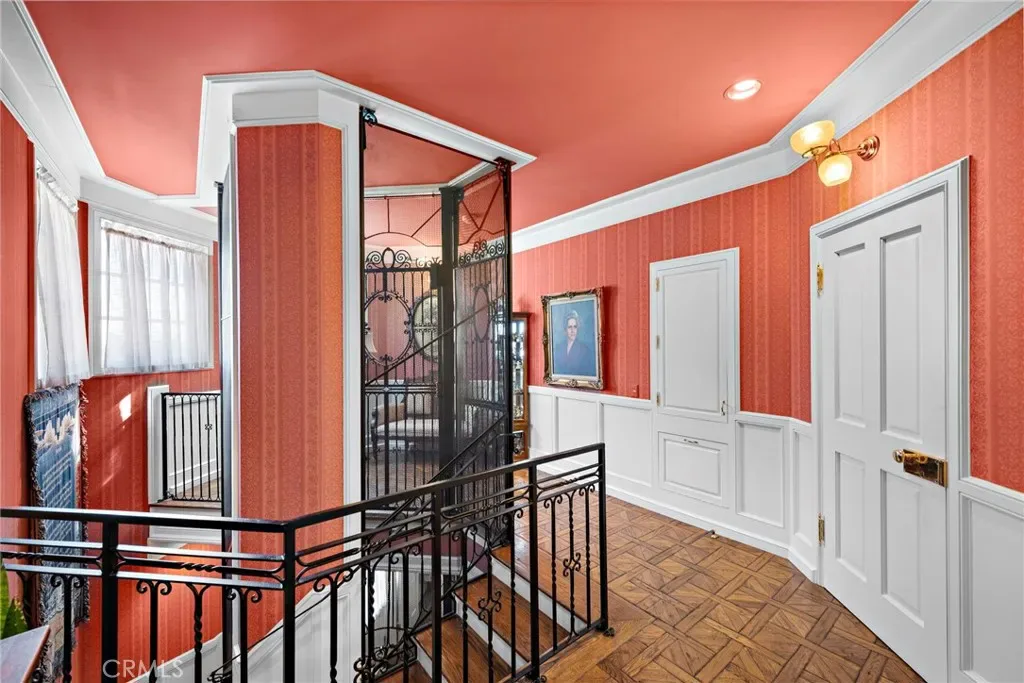 For wine enthusiasts, a vintage vault door leads to a wine cellar, ideal for tastings or quiet enjoyment. A charming birdcage elevator adds a touch of elegance and convenience.