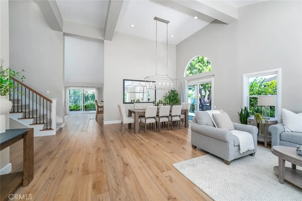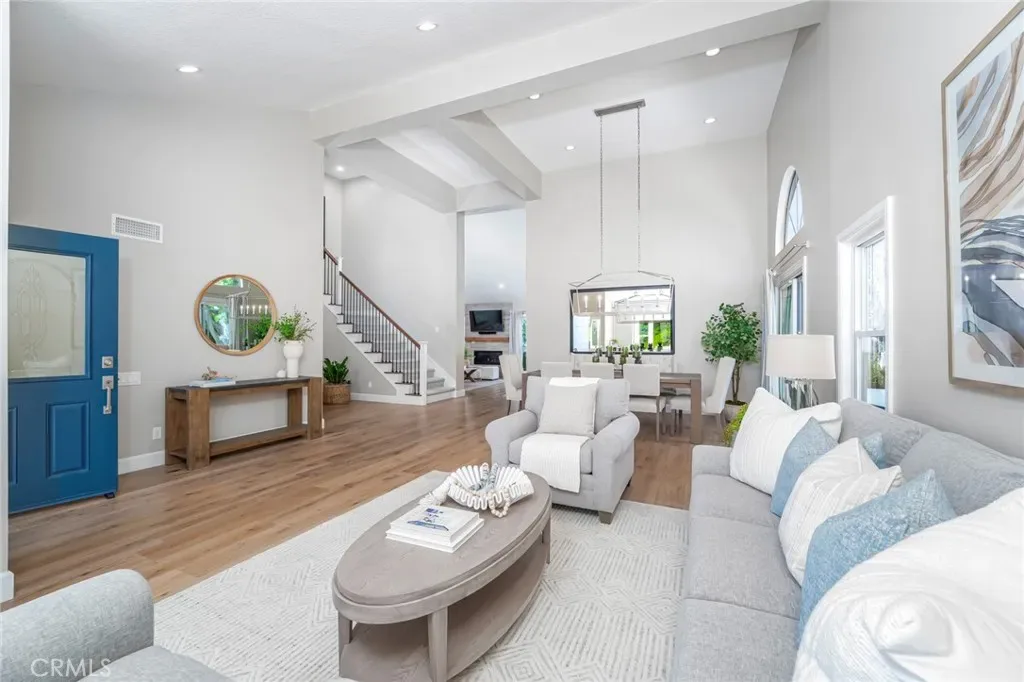 Rare remodeled Beacon Hill home featuring a highly-sought-after Main Floor Primary Bedroom; this 4-bedroom, 2.5-bathroom layout doesn’t come to market often! Tucked away at the end of a single-loaded cul-de-sac and set on an elevated, pie-shaped lot, it offers sweeping ocean-to-mountain views with Niguel Summit as a backdrop. Extensive remodeling has made this truly one of a kind. Feel immediately at home as you step into the bright, open living and dining areas, a seamless space perfect for modern living. Bay windows and a sliding door let natural light in, while two-story ceilings and updates like the custom staircase add to the welcoming atmosphere. Easily connect indoor and outdoor dining areas when entertaining. The entire main floor features wide-plank oak flooring, adding warmth and sophistication. The remodeled kitchen is functional and inviting, featuring granite countertops, stainless steel appliances, 5-burner Kitchenaid range, farmhouse sink, and an expanded peninsula with bar seating and storage. It flows seamlessly into the family room, complete with an in-wall electric fireplace framed by floor-to-ceiling limestone tile and a custom wood mantle. Step out to the spacious backyard, designed for relaxation and entertaining with three distinct areas: a grassy lawn, a shaded patio with a new cover, and a private space with handsome pavers perfect for dining or soaking in the hot tub while taking in the views. Main floor includes a redesigned laundry room, powder room, and the primary suite – a true retreat. This serene space offers views and a luxurious expanded bathroom with porcelain flooring, freestanding tub, walk-in shower, dual quartz vanity, custom built-ins, and a large walk-in closet with addtl. built-ins and display cabinet. Upstairs, discover three secondary bedrooms, full bathroom with quartz counters and shower/tub combo, and ample storage in large linen cabinet. One bedroom features a slider leading to a grand west-facing deck with breathtaking views; would also make an incredible office space. Solar savings w/a leased system (to be assumed by buyer). With its thoughtful remodeling, expanded space and incredible location, this is a very unique opportunity to live in Beacon Hill and enjoy 6 lighted tennis courts, 3 pools and spas, parks and close proximity to the Salt Creek Trail, shopping/restaurants, Monarch Beach Golf Links, Salt Creek Beach and The Ritz Carlton. Don’t miss this opportunity, schedule your private showing today.