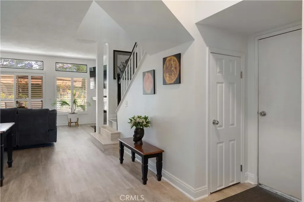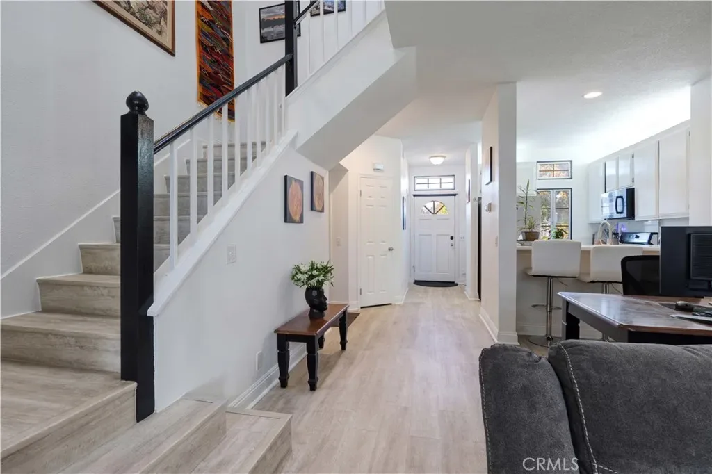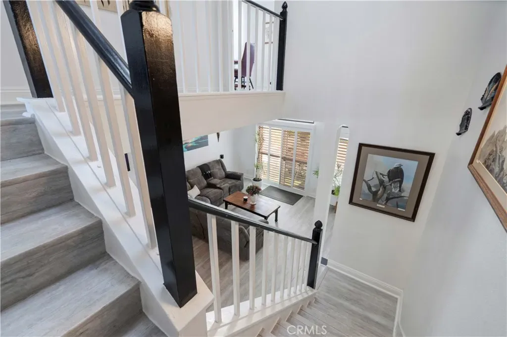 Welcome home to this beautiful residence located in the exclusive gated community of Bridgeport Terrace. This inviting property features two bedrooms, two and a half bathrooms, an attached garage and a host of upgraded amenities. Upon entering, you will be greeted with oak laminate wood flooring that flows effortlessly throughout the open floor plan. The kitchen features quartz countertops, recessed lighting and bar seating, while the adjacent dining area makes for easy entertaining. The spacious living room centers around a gorgeous, custom tile-surround fireplace, all while overlooking the private, serene patio. A convenient guest half-bath is located downstairs, as well as an in unit, side by side laundry space. Head upstairs to find the two primary suites, each offering its own ensuite bath and walk in closet. Additional upgrades include shutters, new paint throughout, custom built ins in the living room and a contemporary staircase marked with espresso handrails and white spindles. Bridgeport Terrace features excellent amenities including a sparkling pool and spa, picnic and BBQ areas and a secure gated entry. HOA dues cover basic cable, trash service, exterior maintenance and well-maintained landscaping. Conveniently located near the 5 freeway, this home is minutes from shopping, dining, entertainment and world-renowned beaches.