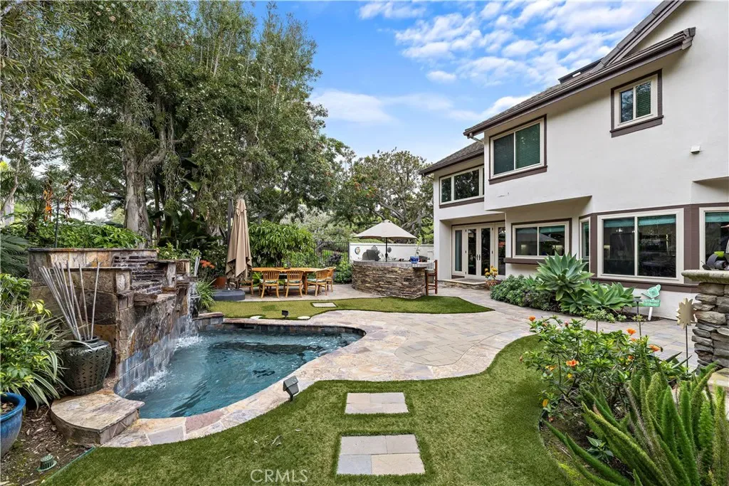 Outside, the private backyard has been designed for seamless indoor-outdoor living and entertaining. The inviting spa, built-in barbecue, and ambient lighting are all framed by lush landscaping that highlight the serene, coastal ambiance of this home.