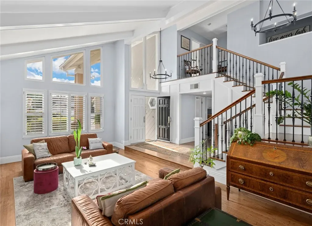 A sense of calm unfolds from the moment you enter, where a sculptural custom staircase with warm wood risers and tailored paneling sets a tone of understated elegance. Soft, ambient lighting and carefully curated fixtures illuminate the natural textures of wide-plank wood flooring, guiding you into an inviting living space anchored by a refined fireplace—an intimate setting designed for both quiet reflection and effortless gathering.
