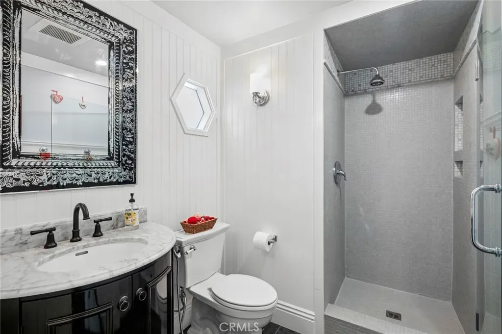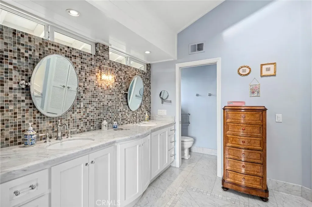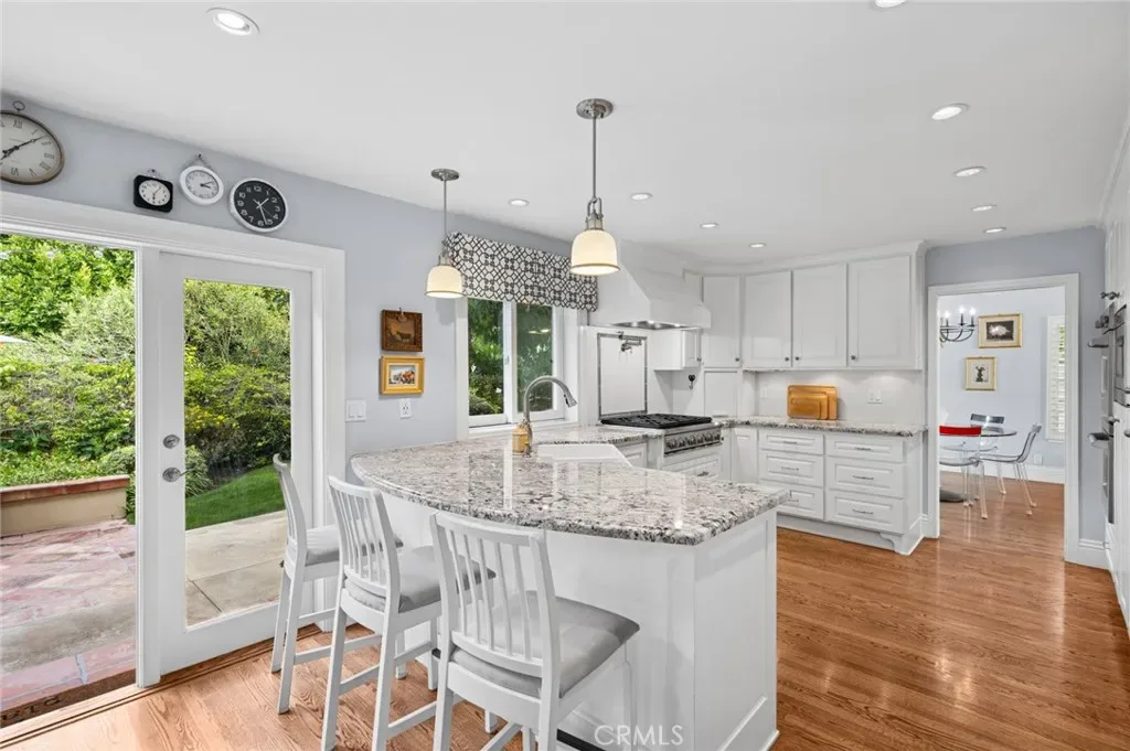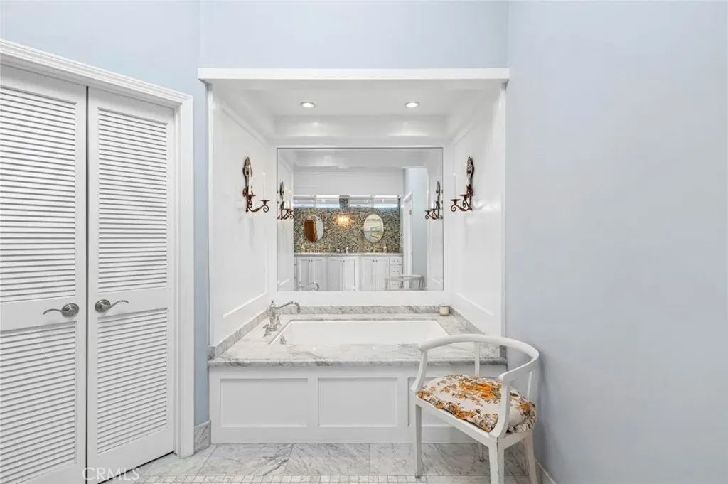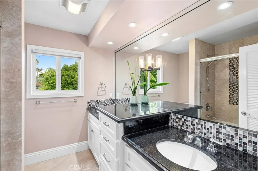 The kitchen is thoughtfully composed as both a functional workspace and a place of connection. Honed granite surfaces, a farmhouse sink, and artisanal tile backsplash are complemented by professional-grade appliances, including a six-burner cooktop with pot filler, dual convection ovens, and an integrated refrigerator. An extended breakfast counter invites casual mornings, while a discreet dry bar with wine refrigeration enhances the home’s capacity for relaxed entertaining. Flowing seamlessly from the kitchen, the family room offers a more intimate retreat—where a custom window seat frames soft natural light, creating a serene nook for reading, conversation, or quiet moments at the end of the day. A main-level guest suite, currently curated as a private office, is appointed with bespoke cabinetry and shelving, offering both flexibility and refinement. The adjoining bath is enveloped in custom finishes, with full-height detailing that evokes a spa-like simplicity. Upstairs, the primary suite is a tranquil sanctuary. Elevated ceilings with custom paneling create a sense of volume and calm, while a private balcony extends the living space outdoors. The ensuite bath is designed as a place of restoration, featuring a deep soaking tub, dual vanities with bespoke cabinetry, and a walk-in shower—all finished with timeless materials and a restrained palette. Secondary bedrooms are thoughtfully updated, each offering comfort and quiet, while the guest bath continues the home’s cohesive design language with custom cabinetry, stone surfaces, and a refined mosaic detail. Outdoors, the landscape has been intentionally designed for ease and sustainability, with water-conscious plantings enhancing the natural surroundings. A covered patio in the rear yard creates a peaceful extension of the home—an ideal setting for open-air dining or moments of stillness.