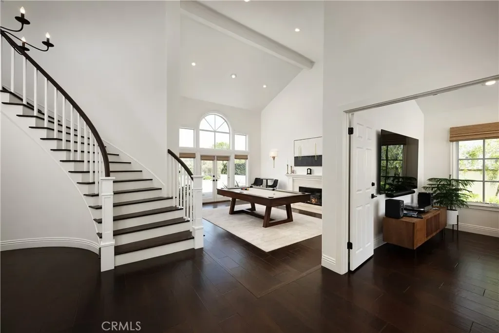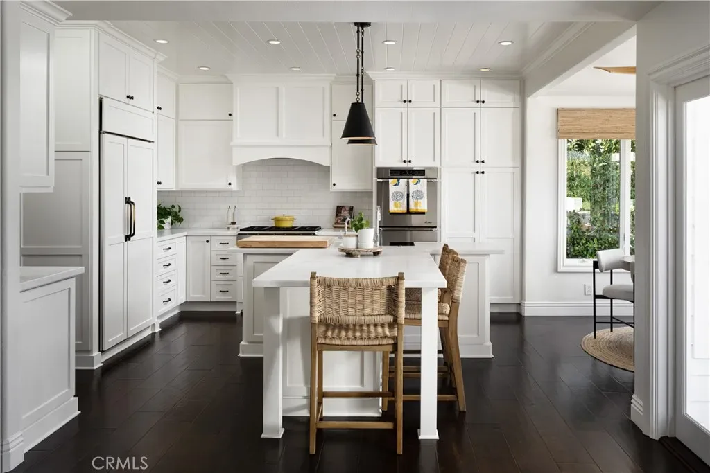 A custom Dutch door welcomes you into a dramatic entry with soaring ceilings, rich hardwood flooring, and thoughtfully designed living and entertaining spaces, including a dedicated game room. The chef’s kitchen is beautifully appointed with custom shaker cabinetry, Calacatta Michelangelo marble countertops, a Dacor 6-burner range, double ovens, Sub-Zero refrigerator, and a spacious walk-in pantry, all opening seamlessly to the family room with an integrated whole-home speaker system.