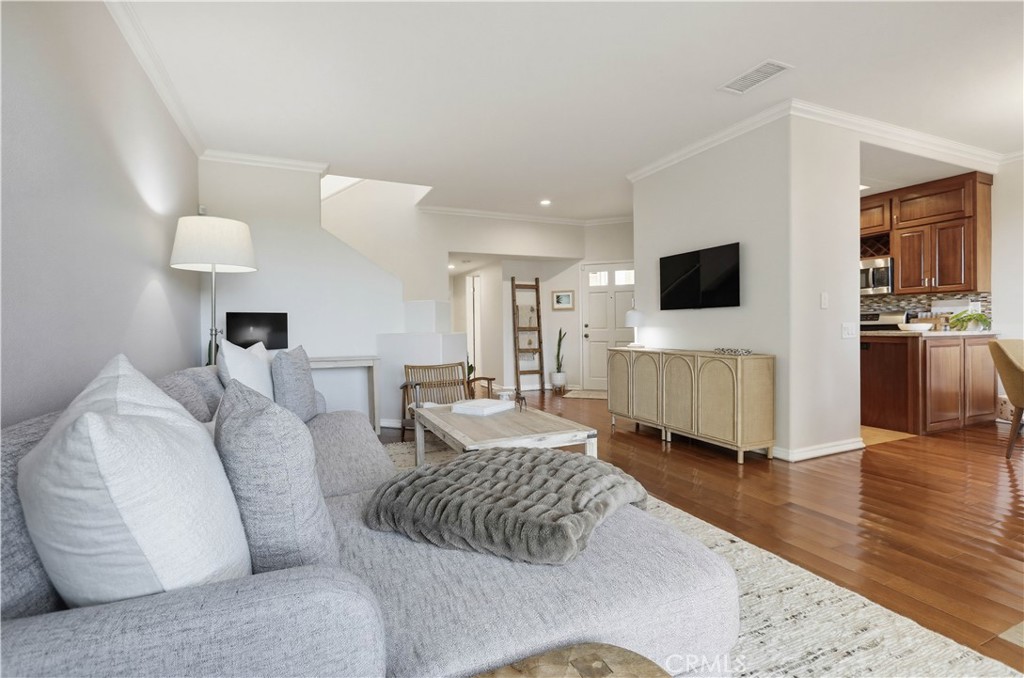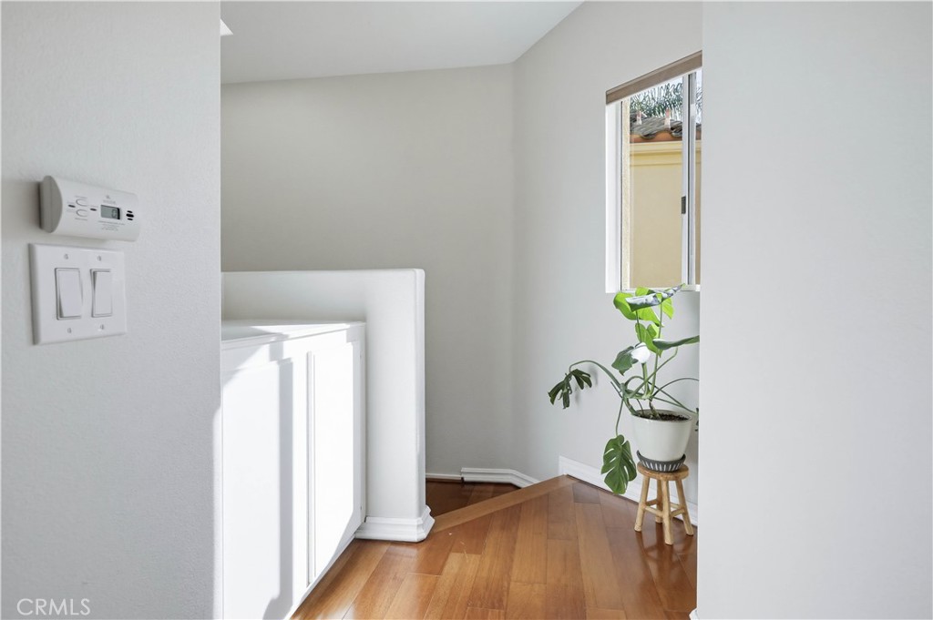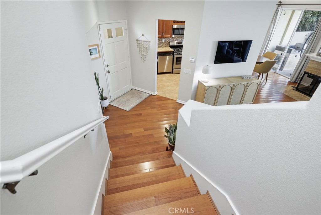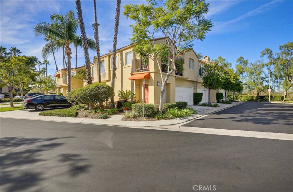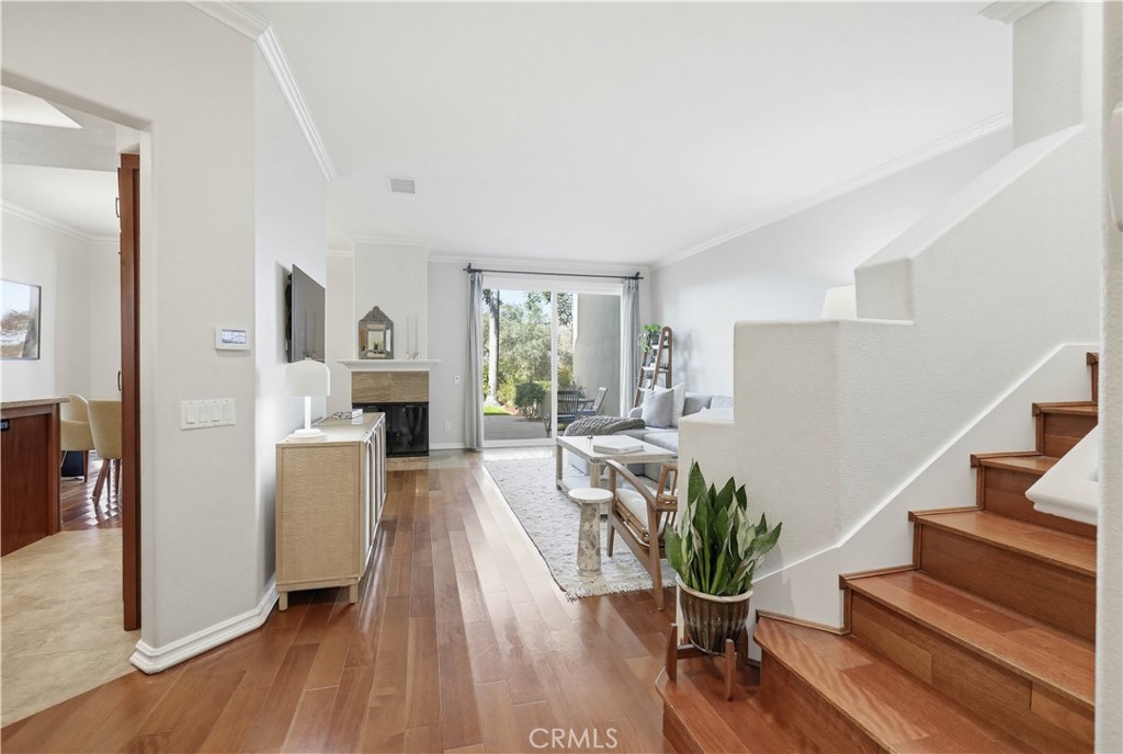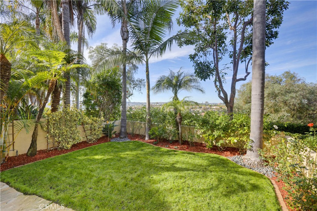 Beautifully updated end-unit home ideally situated on a lush greenbelt with sweeping sunset and rolling hill views. Set on one of the largest and most desirable lots in the Encore at Marina Hills community, this light-filled residence offers privacy, space, and an exceptional backyard oasis. An arched walkway and gated front courtyard welcome you inside to gorgeous hardwood floors throughout and crown molding. The open floor plan features a spacious living area with sit-down views and a stunning three-sided gas fireplace shared with the dining area. Two sets of sliding glass doors create seamless indoor-outdoor living. The kitchen boasts rich hardwood cabinetry, granite countertops, glass tile backsplash, recessed lighting, and stainless-steel appliances, opening perfectly to the dining area for easy entertaining. The main level includes a powder room and a laundry room. Upstairs, the freshly painted primary suite features vaulted ceilings, dual vanities, a shower/tub enclosure with bench, and a large private balcony ideal for enjoying sunsets and ocean breezes. The freshly painted secondary bedroom offers vaulted ceilings, updated dual-pane windows, and beautiful views. The expansive backyard is perched above a peaceful greenbelt and showcases a sandstone patio, built-in BBQ and bar, grassy lawn, vibrant rose bushes, and lush tropical landscaping with mature trees—perfect for relaxing or entertaining. Additional highlights include a direct-access two-car garage with built-in storage, refrigerator, washer, and dryer included, and HOA coverage for water. Encore amenities include a pool and spa, picnic areas, and close proximity to parks, trails, shopping, dining, beaches, and easy freeway and toll road access. Tenants to enjoy resort like Marina Hills Park amenities as well, including pool, clubhouse, tennis courts, playgrounds, sport courts and playing fields.