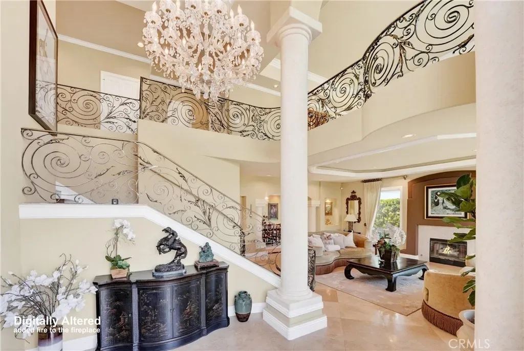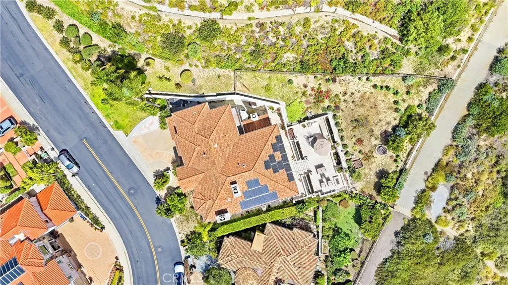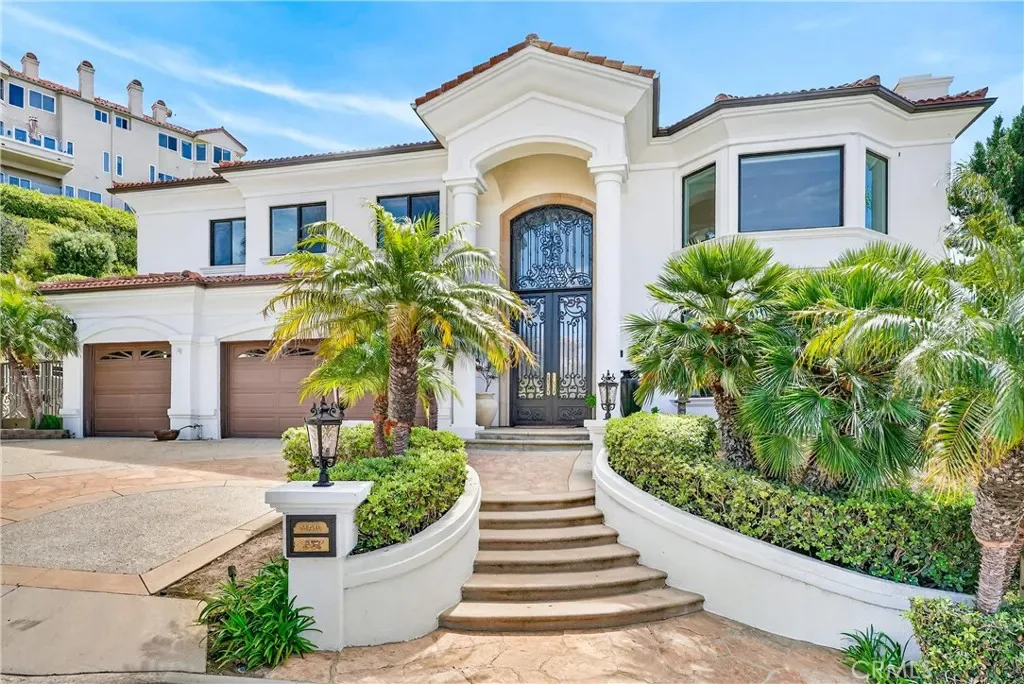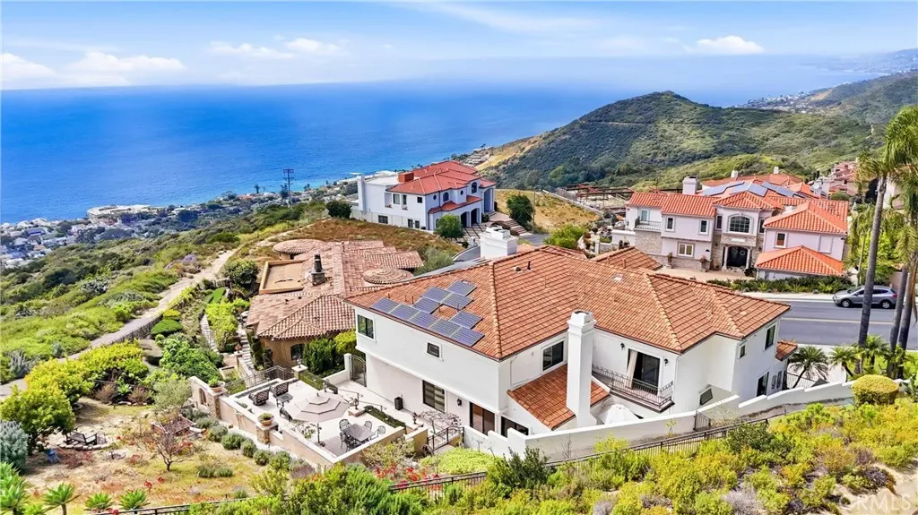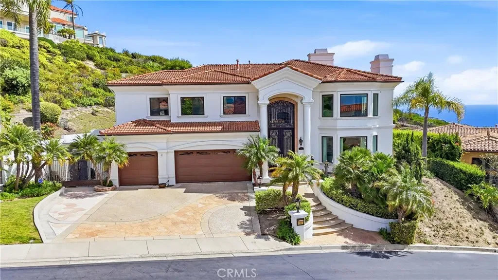 Set behind the gates of Laguna Sur, this remarkable estate showcases sweeping ocean, Catalina Island, and coastline views extending toward Palos Verdes. The residence offers a thoughtfully designed two-level floor plan with generous living spaces and an easy, open flow ideal for both everyday living and entertaining. The home makes a striking first impression with a custom entry featuring 10-foot-tall custom wrought iron doors with a 6-foot wrought iron window arching above. These doors open to a dramatic foyer with soaring ceilings and a distinctive circular marble design. Architectural elements throughout include graceful archways, statement columns, and expansive windows that highlight the views. Designer lighting and a sophisticated combination of wood and travertine flooring complete the space. A custom wrought iron staircase adds to the home’s refined character. The layout includes five bedrooms and four and a half bathrooms, along with a formal dining room and an inviting family room complete with a 15-foot built-in showcase-bookcase. Natural light fills the interior, enhancing the sense of space and drawing attention to the stunning coastal scenery. Upstairs, a versatile loft overlooks the main entry area below and captures beautiful ocean views. It is ideal for a lounge, office, or media space. Thoughtful enhancements elevate the home throughout, including an expansive backyard deck designed for outdoor entertainment and relaxation. The kitchen has been beautifully redone with updated finishes and appliances, creating a functional and stylish centerpiece. The primary suite has been upgraded with a redesigned closet and a refined bath retreat, offering a spa-inspired experience. Additional improvements include updated lighting throughout, refreshed fencing for added privacy, and an enhanced entryway that complements the home’s architectural appeal. A fully integrated solar system with 3 Tesla Powerwalls provides impressive efficiency and can power the entire home, including both air conditioning systems, off-grid. Located within the highly sought-after Laguna Sur community, this home presents a rare opportunity to enjoy coastal living with impressive views and refined, move-in-ready upgrades.