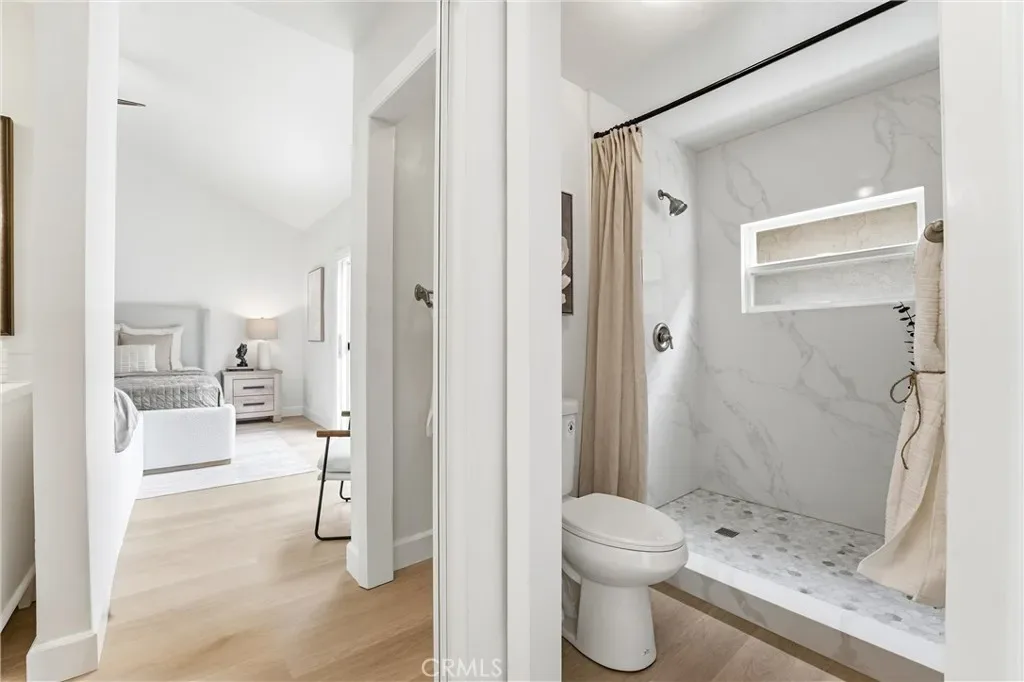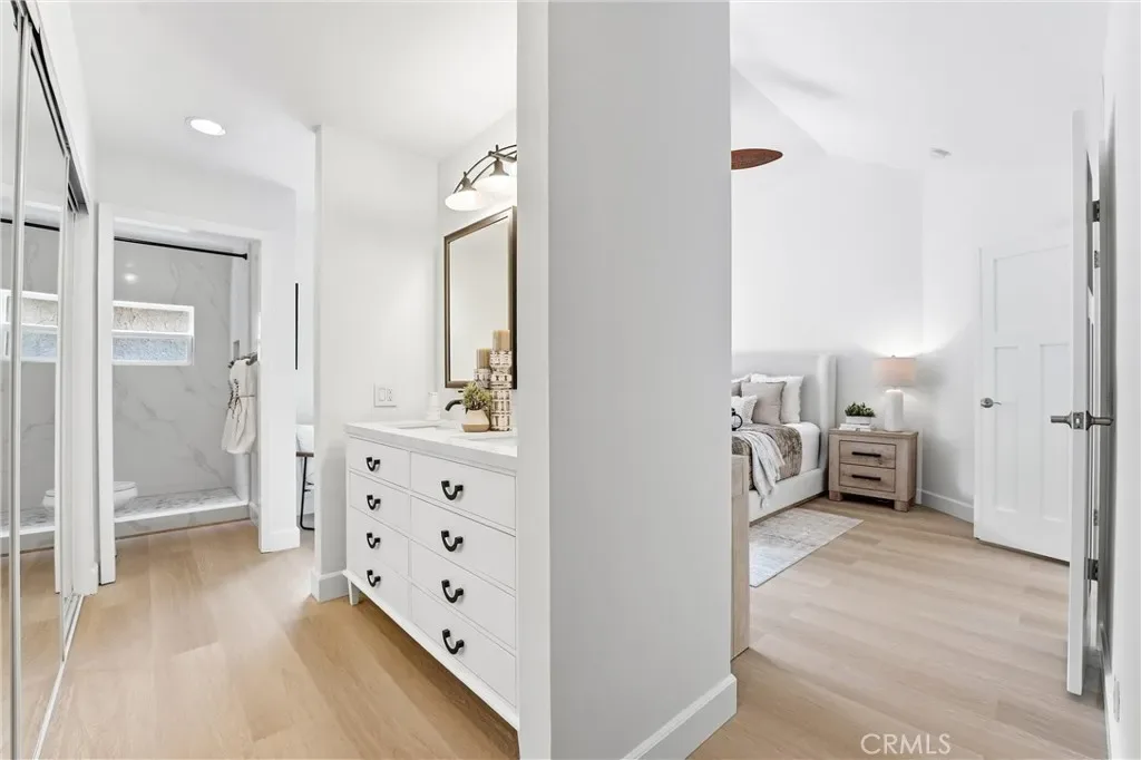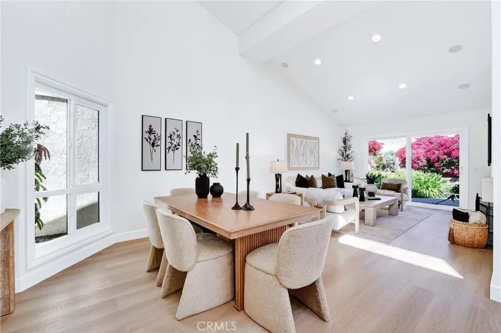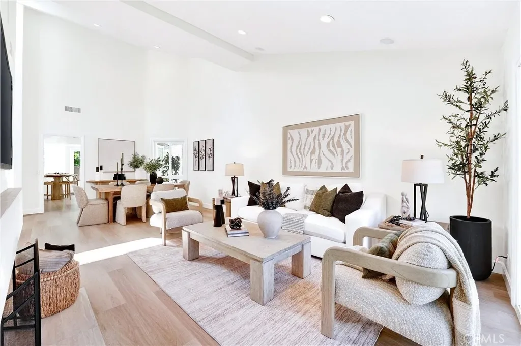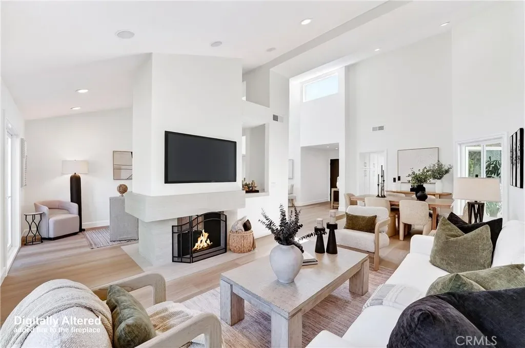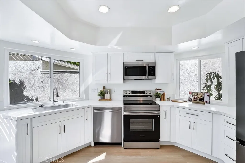 Highly desirable 1-story living, this newly & extensively remodeled home blends modern design with thoughtful functionality throughout. Bright, open floor plan showcases vaulted ceilings across the living, dining, den & primary bedroom areas, enhanced by updated recessed lighting, luxury vinyl flooring, & a dual-sided gas fireplace finished in sleek porcelain tile. Beautifully updated kitchen offers stylish white shaker-style cabinetry, quartz countertops, stainless steel Samsung appliances, pantry storage, & abundant natural light from multiple windows & French doors. Both shower areas have been taken down to the studs & rebuilt with high-end finishes, including freestanding vanity cabinets with stone countertops, dual sinks, & elegant custom mirrors. The primary suite features a spa-inspired walk-in quartz shower with polished marble hexagon tile flooring. Triple-mirrored closet doors & a dedicated walk-in closet ensure ample storage. Additional features include a versatile den/office space with potential for a 3rd bedroom, an interior laundry room, & upgraded finishes such as vinyl windows & doors, new baseboards, switches, outlets, & fresh interior paint throughout. Outside, enjoy private front & rear patios surrounded by mature citrus trees, plus exterior updates that have transformed this home to reflect a fresh, modern appearance. Located on a quiet cul-de-sac, this home also features a custom front gate, and a detached two-car garage with generous attic storage. Located adjacent to Yosemite Park, just blocks to Sea Country Community & Senior Center and LN Elementary School, 1/2 mile to LN Regional Park, nearby Whole Foods & upscale shops and minutes to the 73 Toll Road & I-5 freeway. In 10 minutes you can see the ocean at Laguna Beach & in 30 minutes you’ll be at Disneyland – What a Great Location!