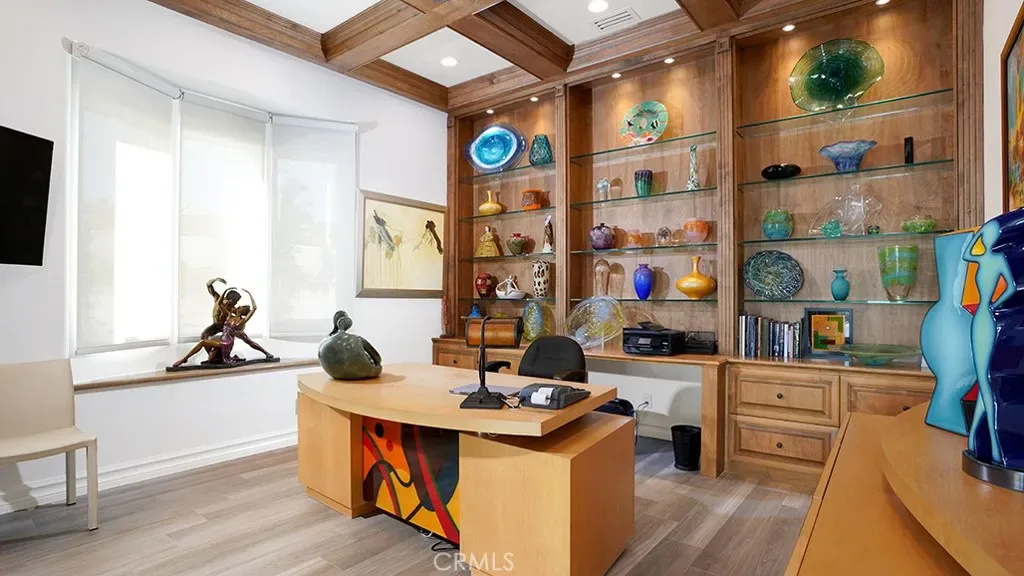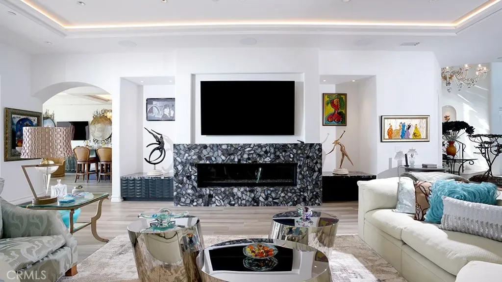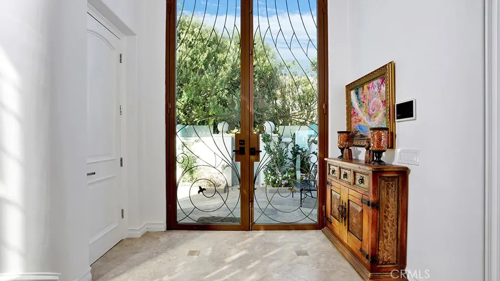 Dramatic 20-foot entry crowned by a custom Murano glass chandelier introduces interiors conceived as gallery space. Architectural finishes read as sculptural elements, with dedicated art walls and multiple niches intentionally integrated to showcase collections. Hand-painted ceiling frescoes by mural artist Donovan Fitzgerald add bespoke dimension and refinement throughout.