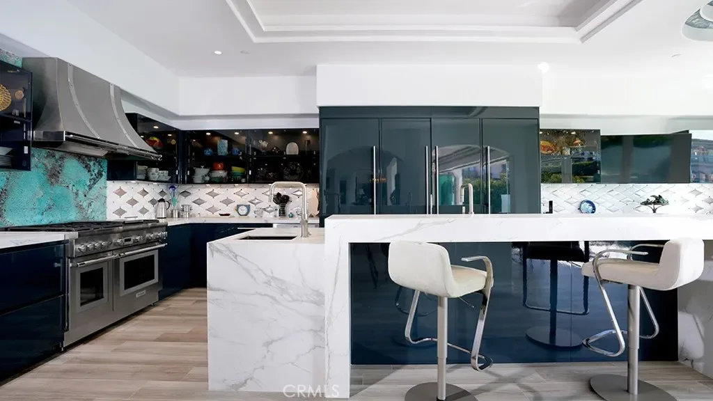 Chef’s kitchen balances precision and beauty with Cantoni cabinetry, Calacatta porcelain surfaces, and professional-grade Thermador and Sub-Zero appliances. Expansive gathering areas anchored by a linear fireplace transition effortlessly to ocean-facing terraces, reinforcing coastal indoor-outdoor living at its finest.