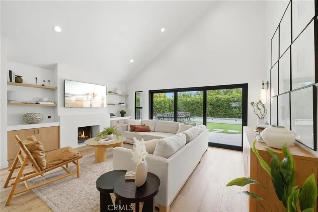 The dramatic open-concept great room is defined by soaring vaulted ceilings, a sleek statement fireplace, and expansive bi-fold doors that dissolve the boundary between indoors and out, revealing a tranquil, curated outdoor setting designed for both relaxation and entertaining.
