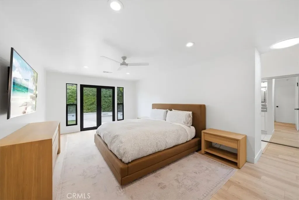 At the heart of the home, the chef’s kitchen is a striking blend of form and function, featuring custom light oak cabinetry, quartz countertops, double ovens, a built-in range, walk-in pantry, reverse osmosis water system, and an integrated workspace—all thoughtfully designed with a refined, modern sensibility.