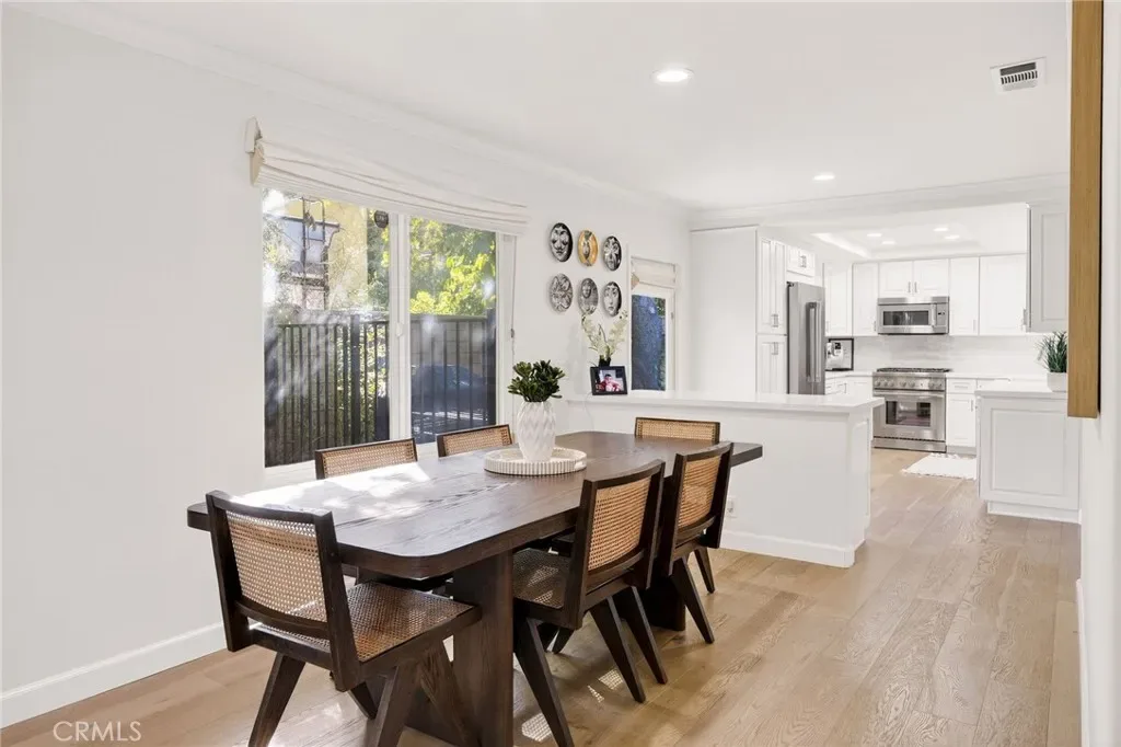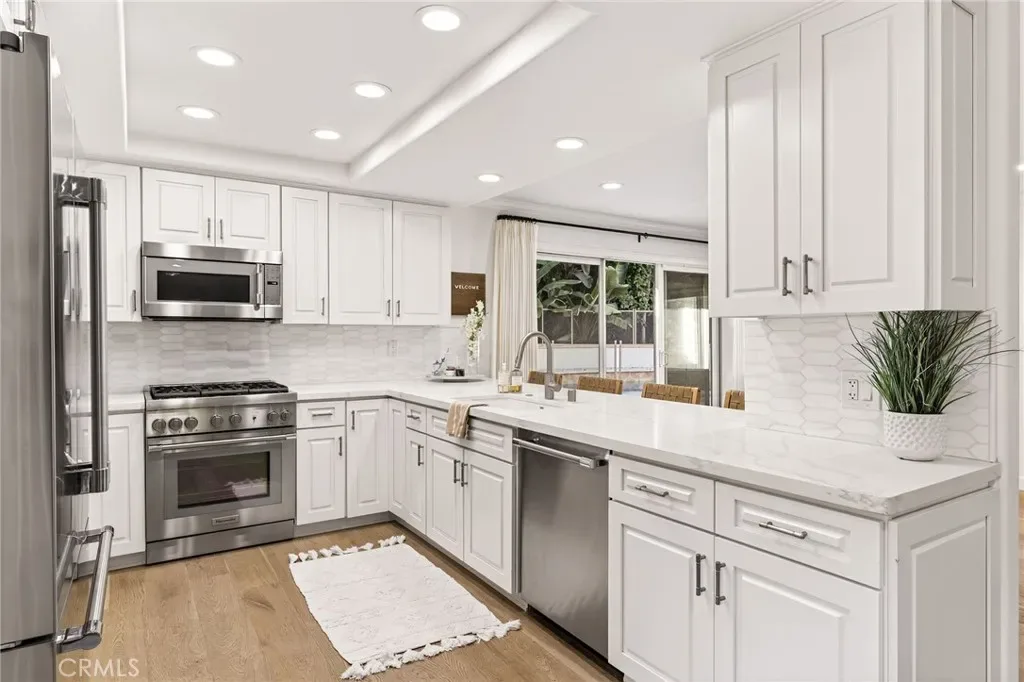 Interior upgrades showcase refined design throughout, highlighted by a fully remodeled open-plan chef’s kitchen featuring quartz countertops, a wine refrigerator, and new premium Thermador appliances. Newer white oak flooring, custom lighting and window coverings, and a sleek electric fireplace further elevate the home’s modern sophistication.