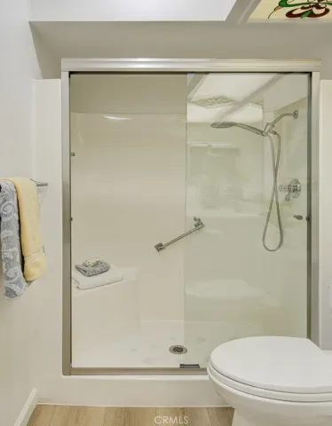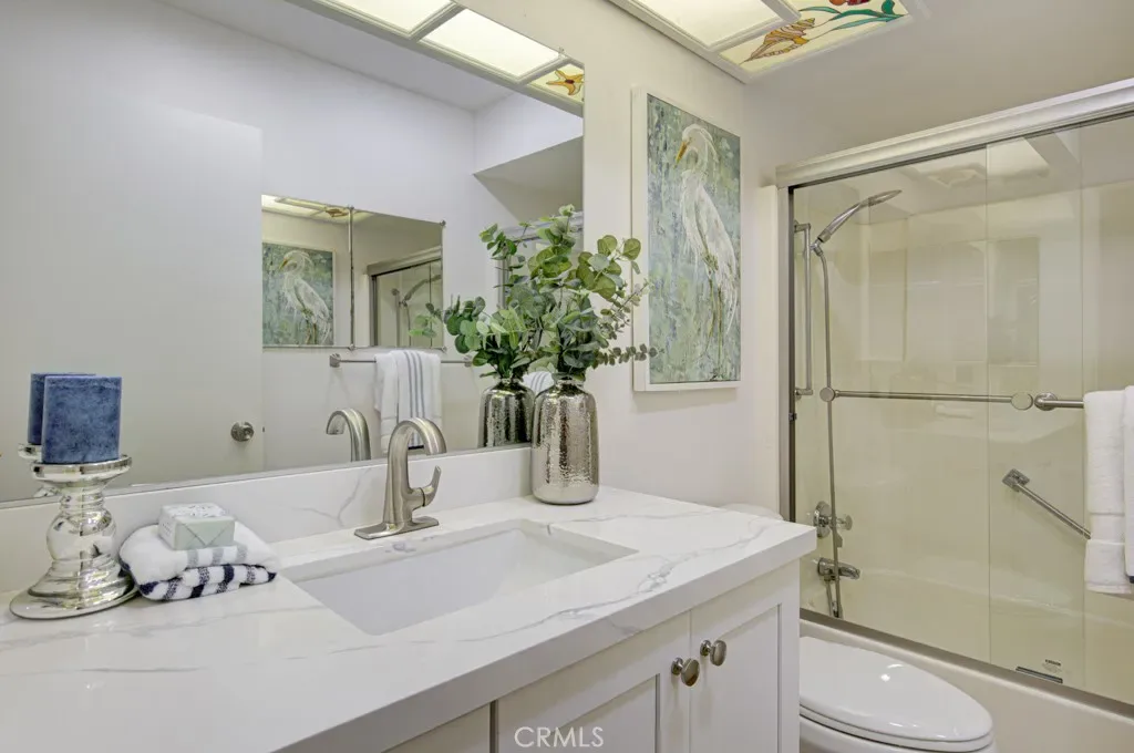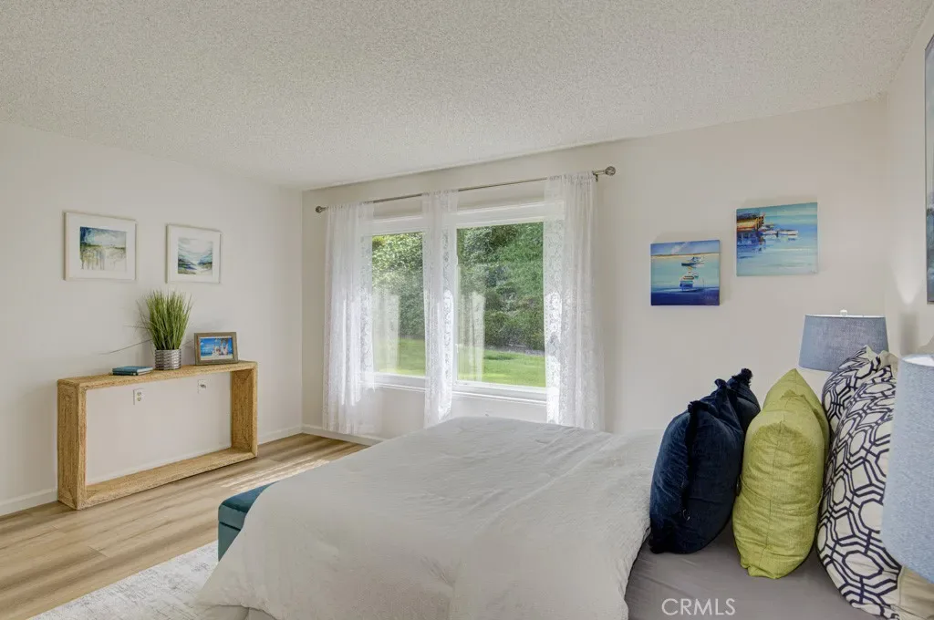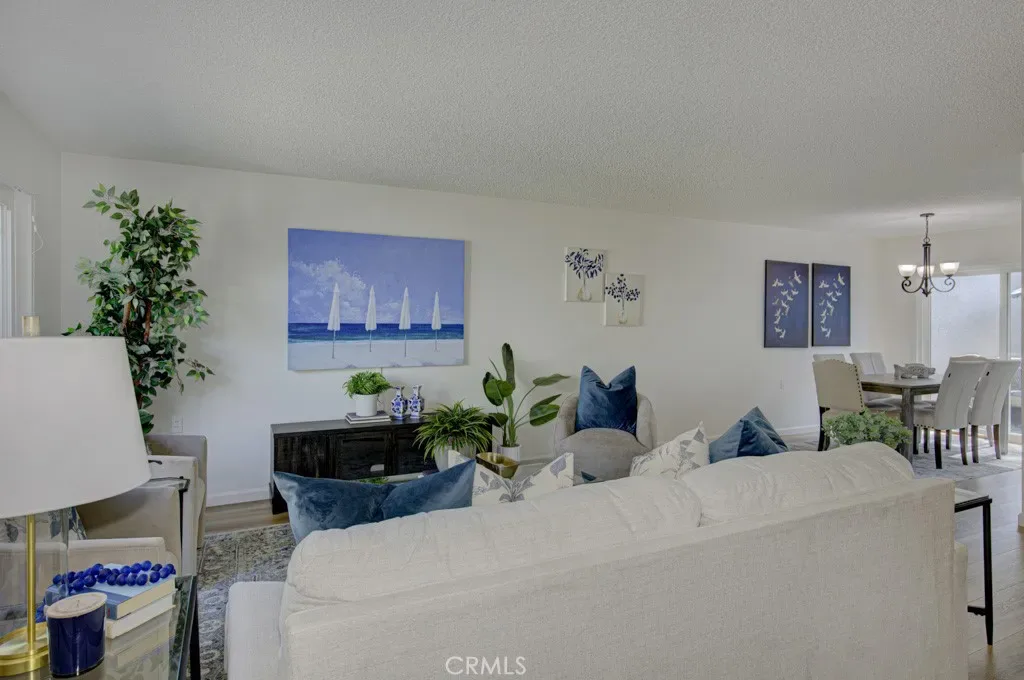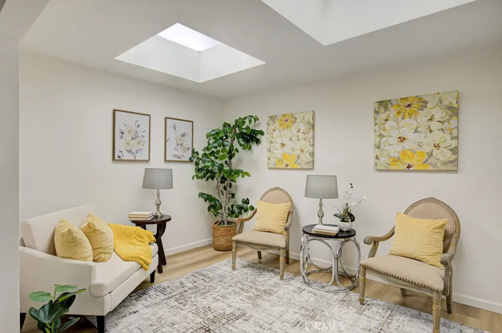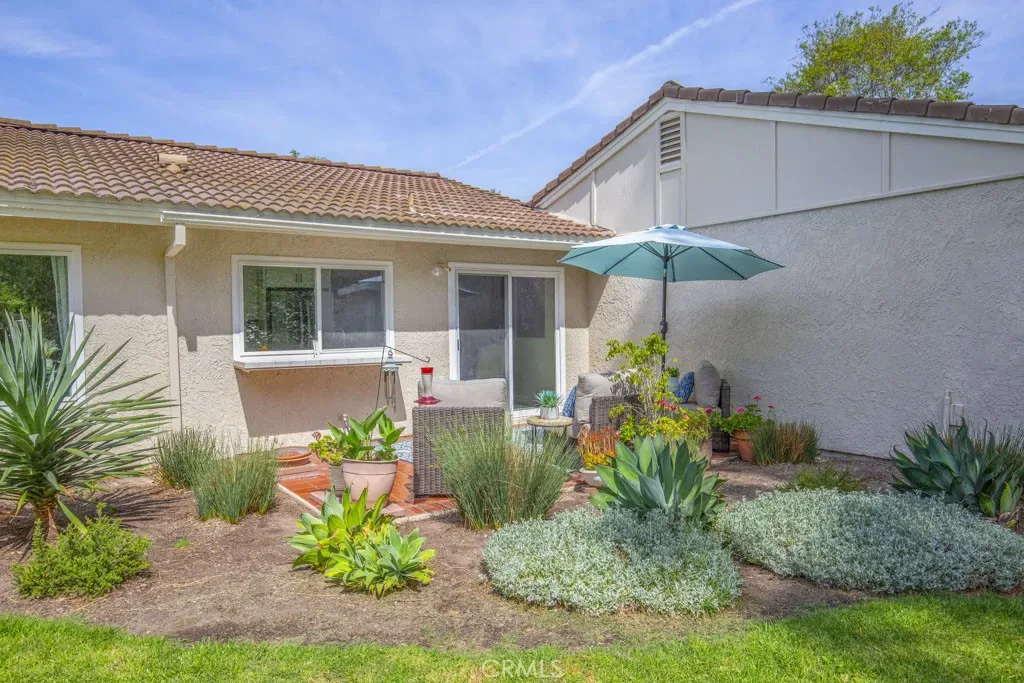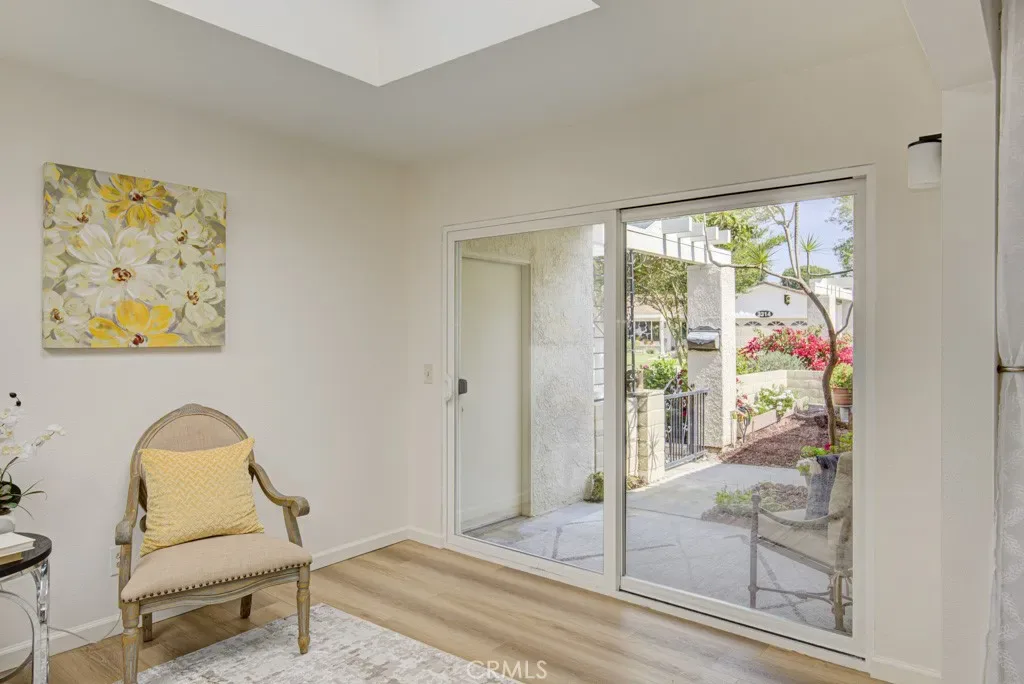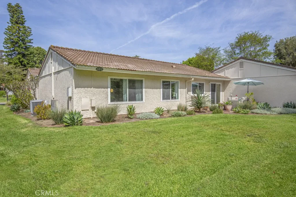 Welcome to 3313-B San Amadeo – a lovely highly upgraded three-bedroom, two-bathroom single-level end-unit LA REINA residence in the Laguna Woods senior community. This home is nestled in a peaceful cul-de-sac far from busy roads and noisy highways. The large living room is brightened by enormous windows that look onto the front entry area. The upgraded kitchen features newer cabinetry with soft-close drawers, an attractive tile backsplash, granite countertops, a lazy susan, a ceiling fan and a convenient pass-through to the rear patio. The primary bedroom has been expanded by approximately 150 sq. ft. replacing the original patio space between the house and the garage to create a versatile bonus room with skylights. That added space or either of the two guest bedrooms could easily serve as a home office, TV room, workout area or arts and crafts studio. Both bathrooms have newer cabinetry with soft-close drawers. The primary bath has a dual sinks and a shower, while the hall guest bathroom has a tub/shower combo. Numerous improvements and upgrades throughout the property include central HVAC, dual-pane windows and beautiful manufactured wood flooring in all rooms. Solar tubes bring additional sunlight into the living room, hallway and both bathrooms. The rear tiled patio with a private view overlooking a large lawn is the perfect tranquil spot for outdoor entertaining, dining and relaxing. The oversized garage has washer-dryer hookups, a storage closet and easily accommodates a golf cart in addition to two vehicles. The extended driveway can hold up to four additional vehicles plus there is ample street parking for guests in the cul-de-sac. This is a great property that is move-in ready. Do not miss!