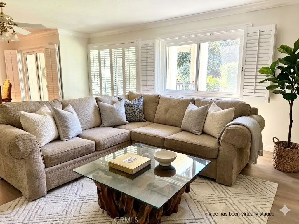 GOLF COURSE PROPERTY! Experience resort-style living in this beautifully appointed end unit 2-bedroom, 2-bathroom condominium overlooking the lush greens of Laguna Woods. Boasting 1,260 square feet of sophisticated living space, this home features a modern open-concept floor plan perfect for entertaining. Fine interior details include smooth ceilings, elegant crown molding, dual-pane windows, and ceiling fans in every room. The primary suite offers a convenient walk-in shower for ease of access. Relax on your private outdoor patio while enjoying serene golf course views.