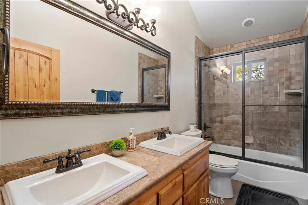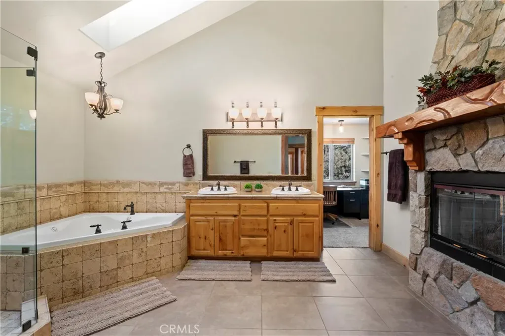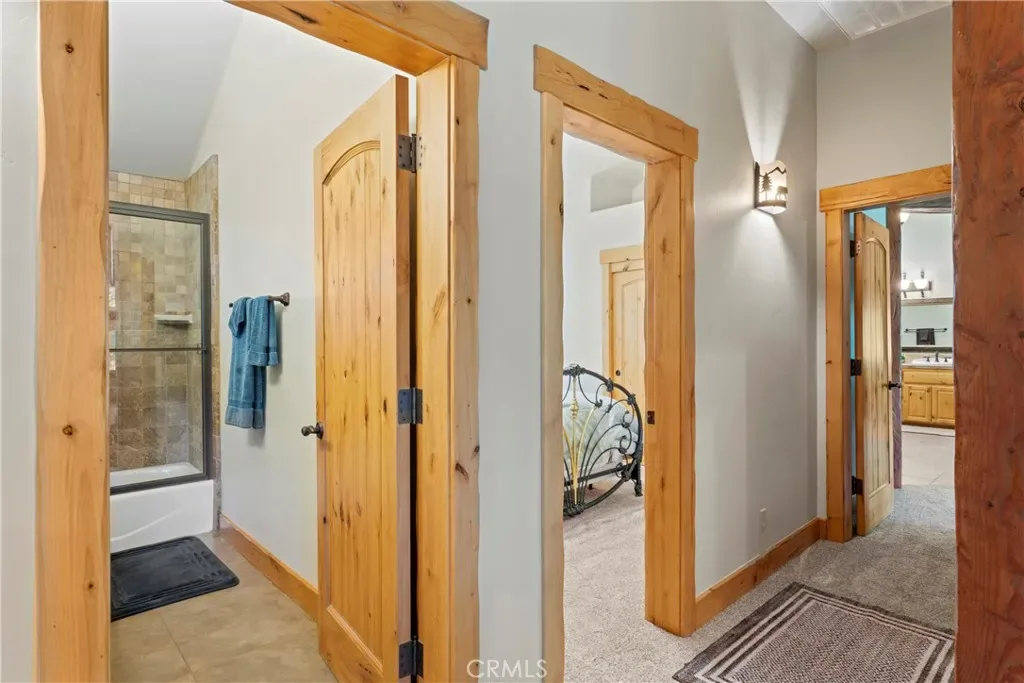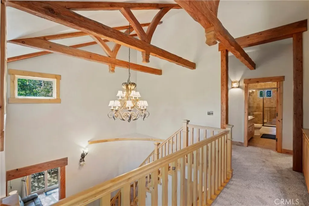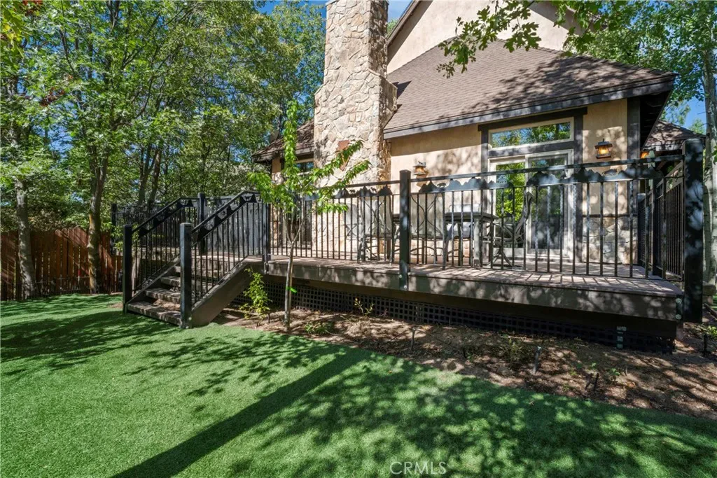 Experience the perfect blend of rugged alpine charm and refined luxury within this quintessential mountain lodge! Situated on a rare flat corner parcel offering full lake rights to private Lake Arrowhead. Custom built for the original owner in 2005, 1034 Teakwood offers a combination of easy accessibility and grand architectural scale. No detail was overlooked utilizing high quality finish work carpenters and high quality lighting fixtures/hardware throughout. Driving into the property you will appreciate hand chiseled split faced granite retaining walls and planters. An oversized 3 car garage provides ample space for vehicles and kayaks, while the dedicated level RV AND BOAT PARKING ensures yours toys are always ready for the next excursion. Reside in a low maintenance house through plaster siding, Trex decking and custom metal decking handrails. Maximum comfort provided by central forced heat and A/C plus Sellers recently installed a 24KW Generac whole house natural gas generator! The perfect property for kiddos and pups frolic within the fenced yard with artificial turf. A grand front door entrance greets you with a dramatic foyer boasting hand carved beams, banister, and rustic door/window casings. Solid wood flooring blankets the entire main living level. A spacious bedroom and full bathroom conveniently located on the entry floor! The kitchen is tastefully designed with knotty pine cabinetry, stainless appliances, double oven, custom mountain theme tiled backsplash, coffee bar, center island, and breakfast bar top. Relax fireside in the vaulted ceiling living room which leads directly onto the oversized entertaining deck(Trex). Upstairs hosts a luxurious primary en suite bedroom with floor to ceiling romantic dual sided stone fireplace, vaulted ceilings and huge walk in closet. Pamper yourself in an oversized soaking tub and enclosed glass shower beneath beautiful skylights. The upstairs is completed with the laundry room, 2 guest bedrooms, a double sink vanity bathroom. The loft serves as an office or movie room, or, frame it in to create a 5th sleeping quarters. Truly the front runner property of its price range, this property bridges the gap between a rustic escape and high end manor. Listed just in time for Summer fun the Alps of Southern California!
