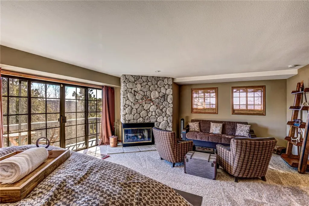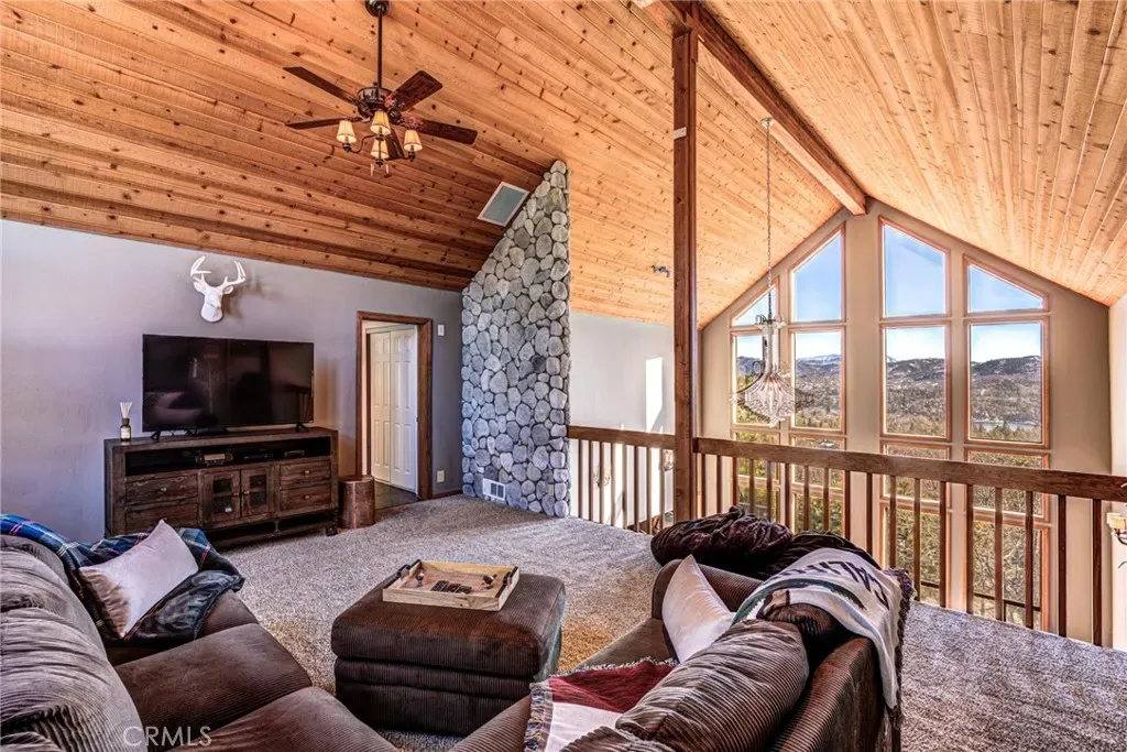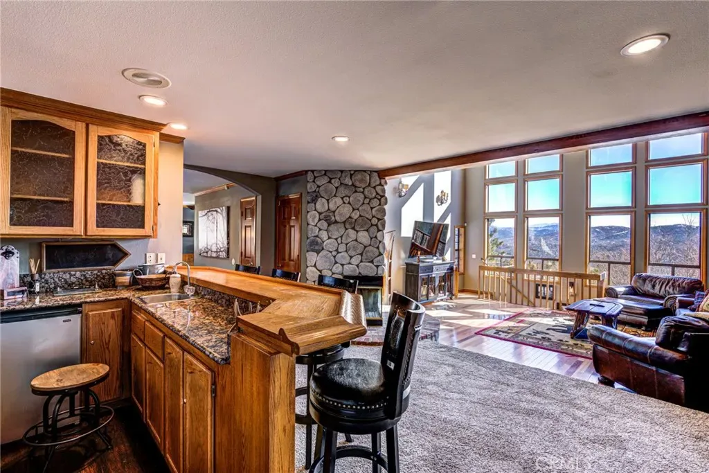 Vaulted wood-beamed ceilings Soaring floor-to-ceiling windows, Magnificent stone fireplace, Custom built-in bar