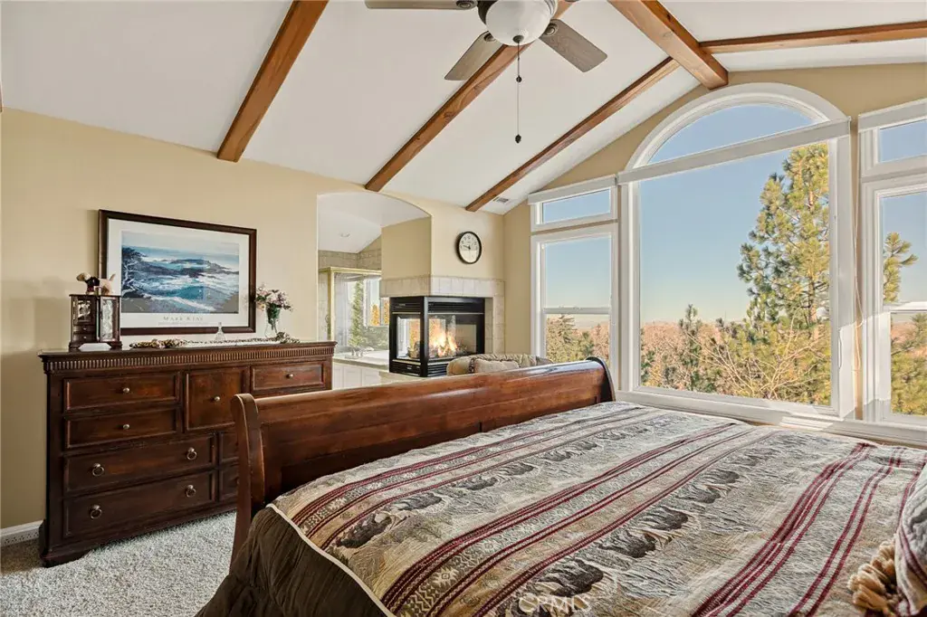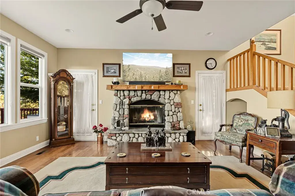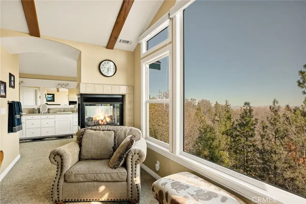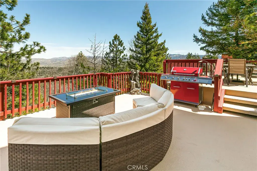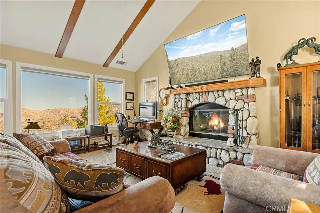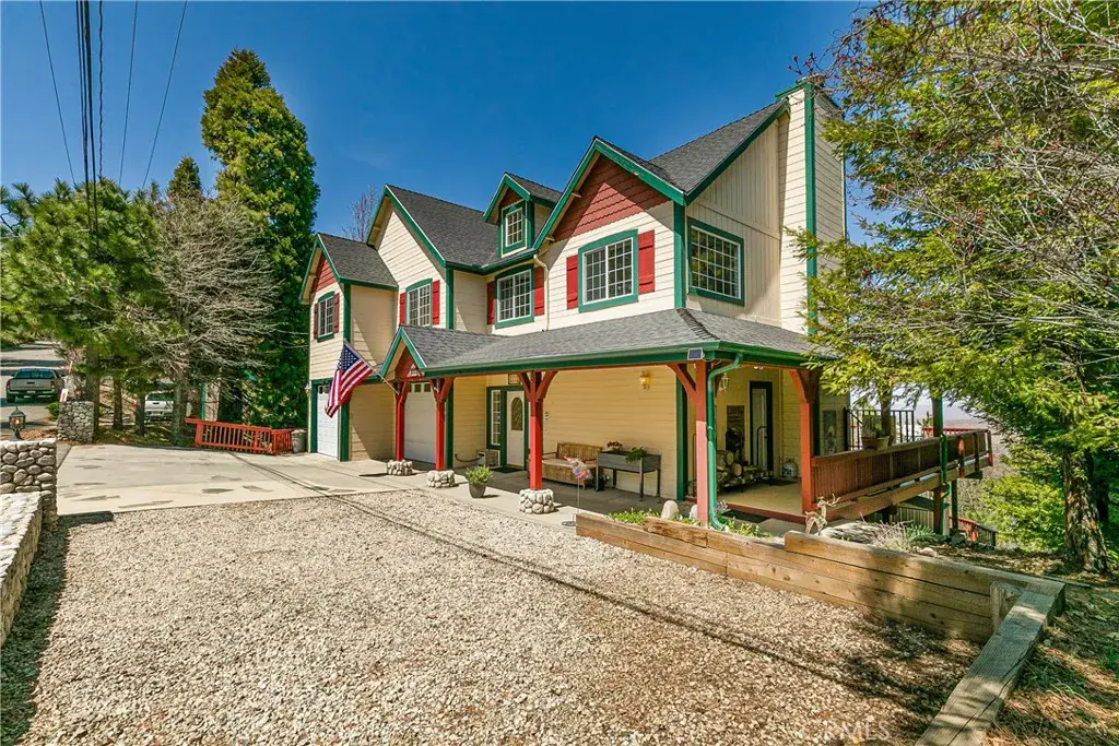 A Rare Mountain Gem with Views That Will Take Your Breath Away. Tucked away in a peaceful, low-traffic neighborhood, this mountain retreat offers the kind of views that are truly indescribable—like stepping into a painting. With 180-degree panoramic vistas stretching across forested ridgelines, the high desert, and twinkling city lights, you’ll find serenity and inspiration from every window. Plus, this home includes coveted lake rights to Lake Arrowhead—adding even more value to mountain living. Enjoy true level entry—a prized feature in snowy mountain communities—with not a single step to the front door. A large driveway able to hold 8 cars, deep two-car garage, and bonus RV parking or boat storage make this home as functional as it is beautiful. Inside, the cozy yet open living room welcomes you with rich hardwood floors, a striking river rock fireplace, and expansive windows that perfectly frame the show-stopping views. A spacious dining area flows into the charming farmhouse-style kitchen featuring white cabinetry, granite countertops, and stainless steel appliances—perfect for hosting holidays and special gatherings. The outdoor living space rivals the interior, with several distinct entertaining decks—all finished with a weatherproof surface for year-round use and durability. Whether you’re enjoying al fresco dinners, sipping morning coffee, or relaxing under the stars around the firepit, every space was thoughtfully designed to take full advantage of the incredible views. Upstairs, all bedrooms await along with a flex space perfect for game nights, movie marathons, or additional sleeping. This bonus room features vaulted ceilings, a fireplace, and some of the best views in the house. The primary suite is a true retreat with ample space for a king bed, a double-sided fireplace shared with the ensuite bath, and more stunning views of the National Forest. The bathroom includes a soaking tub, walk-in shower, dual vanities, and a huge walk-in closet with attic access. Two more spacious bedrooms and a stylish full bath are just down the hall. Below the home is a third level for storage or potential expansion, and additional outdoor sheds are perfect for tools, gear, or seasonal décor. A private access road below offers even more flexibility, ideal for off-road vehicle storage. AC, generator, & lake rights. Whether you’re looking for a full-time residence, second home, or future short-term rental, this property checks every box. Comes fully furnished.