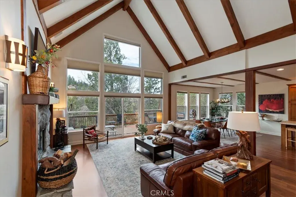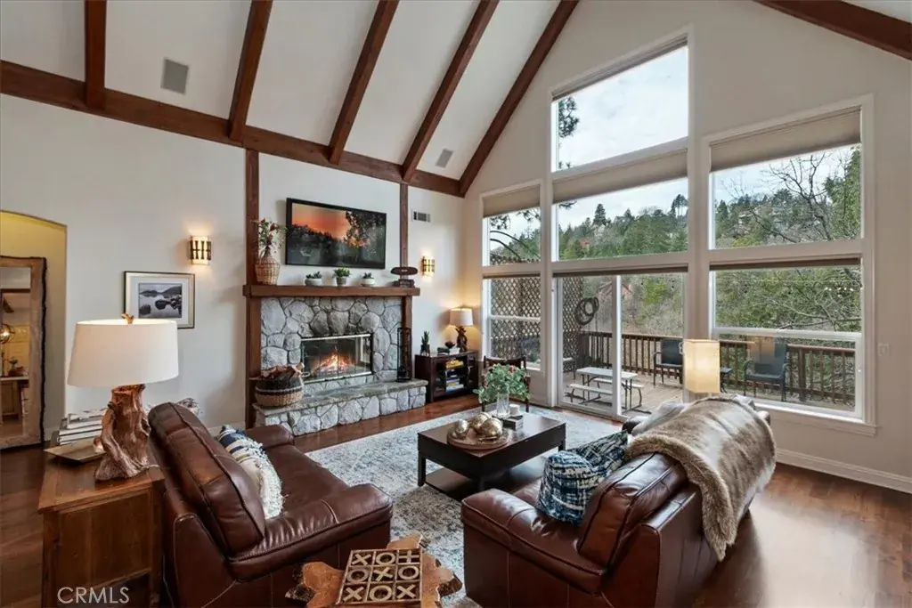 Experience the pinnacle of alpine luxury in this impeccably maintained, newer mountain estate. Spanning nearly 3,300 sq. ft. on a third-acre of lush forest, this home offers a rare “absolutely no stairs” lifestyle on the main level. From the level-entry garage and level parking to the main-floor primary retreat and laundry, every essential is designed for effortless, high-end living. ~ Exquisite Main-Level Living with everyones favorite Great Room Design: Step into a grand living area featuring soaring two-story ceilings and a massive floor-to-ceiling stone fireplace. ~ Architectural Elegance: Walls of glass frame breathtaking forest views, complemented by rich real wood floors and custom knotty-alder cabinetry. ~ Primary Retreat: A true sanctuary featuring its own fireplace, a spa-like tub, a massive walk-in closet, and serene views of the surrounding pines. ~ Outdoor Serenade: The main living space opens onto an expansive deck overlooking the forest and the gentle seasonal sounds of Willow Creek just below. ~ Versatile Lower Level: The lower level serves as the ultimate entertainment hub and guest wing. ~ Game Room: Features a third fireplace and access to a second private outdoor living space. ~ Additional Rooms: Includes spacious guest rooms, a dedicated office, and a specialized hobby/craft room. ~ Modern Conveniences & Community Perks. ~. This home is a turn-key opportunity, offered mostly furnished and decorated for immediate enjoyment. ~ Infrastructure: Located on a county-maintained, plowed road with public utilities, high-speed internet and A/C for your summer comfort. ~ Lake Access: Includes full privileges to the private, pristine waters of Lake Arrowhead. ~ Prime Location: Walk or ride directly to Tavern Bay Beach Club and endless National Forest trails. ~ Bonus: A boat dock is also available for separate purchase.