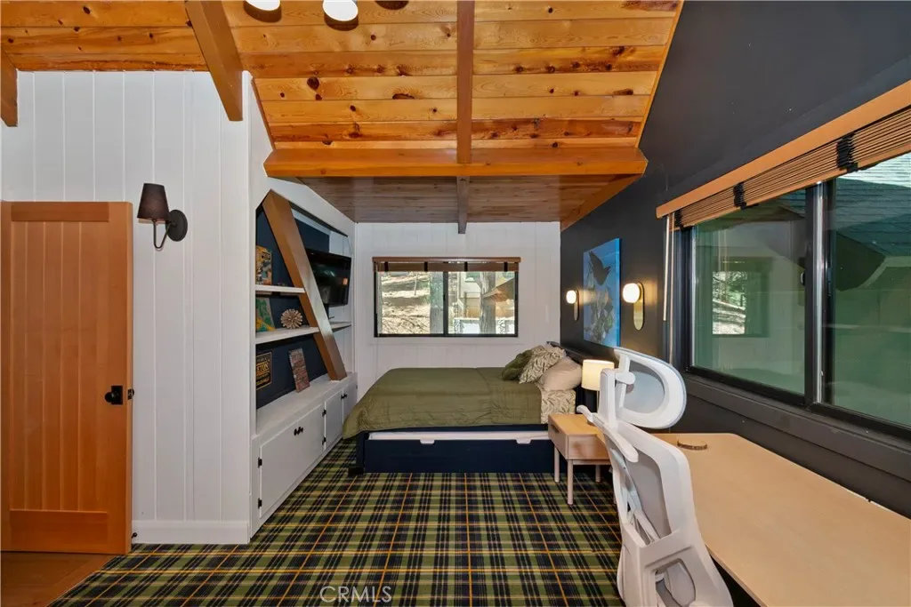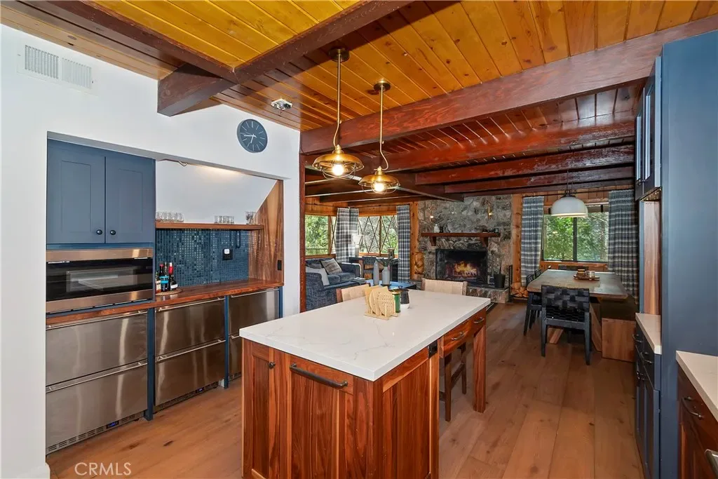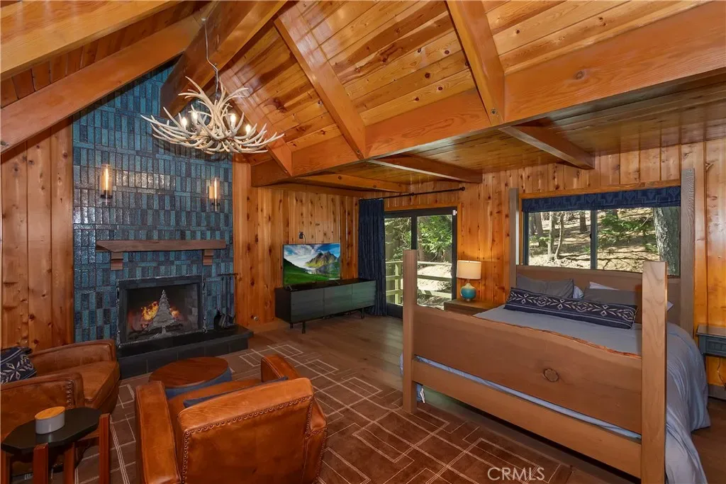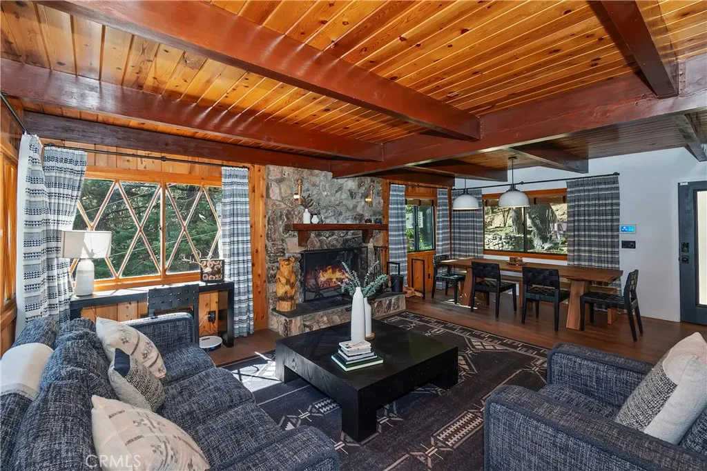 Rustic character meets modern polish in this beautifully updated Lake Arrowhead home with full lake rights. Set directly across from the Lake Arrowhead Country Club and minutes from National Forest trails, this property puts boating, fishing, swimming, hiking, and easy commuter access all within reach. The main level welcomes you with an open layout anchored by a striking stone fireplace in the living room, flowing into a generous dining area built for gathering. The upgraded kitchen pairs high-end appliances with smart design—equally suited to weeknight dinners and weekend entertaining. A well-appointed, main-level bedroom and full bath round out this floor with added flexibility for guests. Upstairs, the primary suite is a genuine retreat: vaulted beamed ceilings, a second stone fireplace, a sitting area, and a private deck overlooking the mountain air. A second bedroom and impeccably finished bathroom share this level with the primary bedroom. Downstairs, the finished lower level is an entertainer’s dream. Wraparound couches, custom artwork, and tasteful décor create a lounge-ready atmosphere, while a mounted 72-inch television with state-of-the-art surround sound turns movie nights and game days into an experience. It’s the kind of space guests never want to leave. Practical details haven’t been overlooked —a two-car garage, ample guest parking, air conditioning, and a tankless water heater keep the home running efficiently year-round. Tastefully maintained and thoughtfully upgraded, this is Lake Arrowhead living at its best—lake privileges and furnishings included and the memories are yours to make.