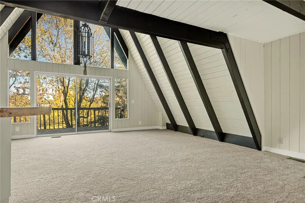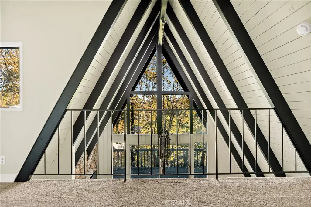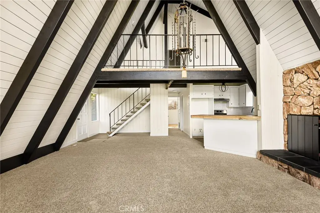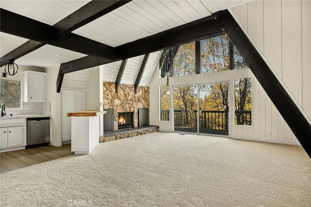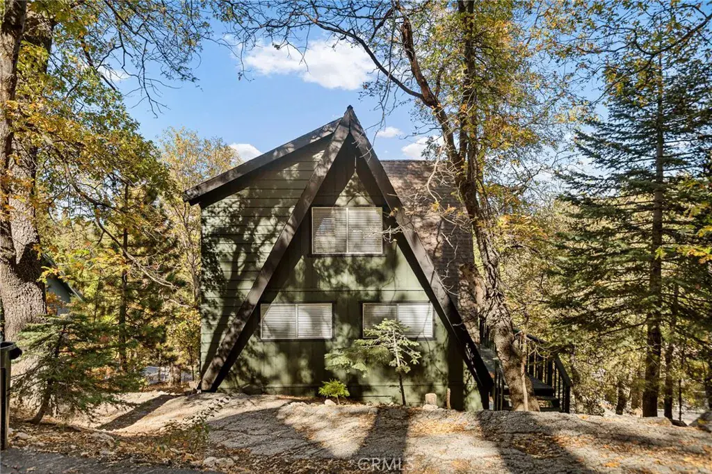Lake rights ! Step into this beautiful remodeled A FRAME cabin—a timeless mountain favorite reimagined with a modern style and plenty of comfort. Just moments from the Lake Arrowhead Country Club with peeks of the course, this home captures the perfect blend of mountain charm and contemporary updates. Soaring open beam ceilings and dramatic A frame lines frame the great living room with natural light. The open concept living space features a cozy fireplace and large windows that frame the surrounding pine trees. The kitchen has been redone and brand new carpet throughout. This home is ideal for relaxing weekends or full time mountain living. Enjoy lake rights to our private lake and the unbeatable location near golf, dining and hiking. 3 big bedrooms and 2 baths all ready for you! Some photos are virtually staged. Come take a look !